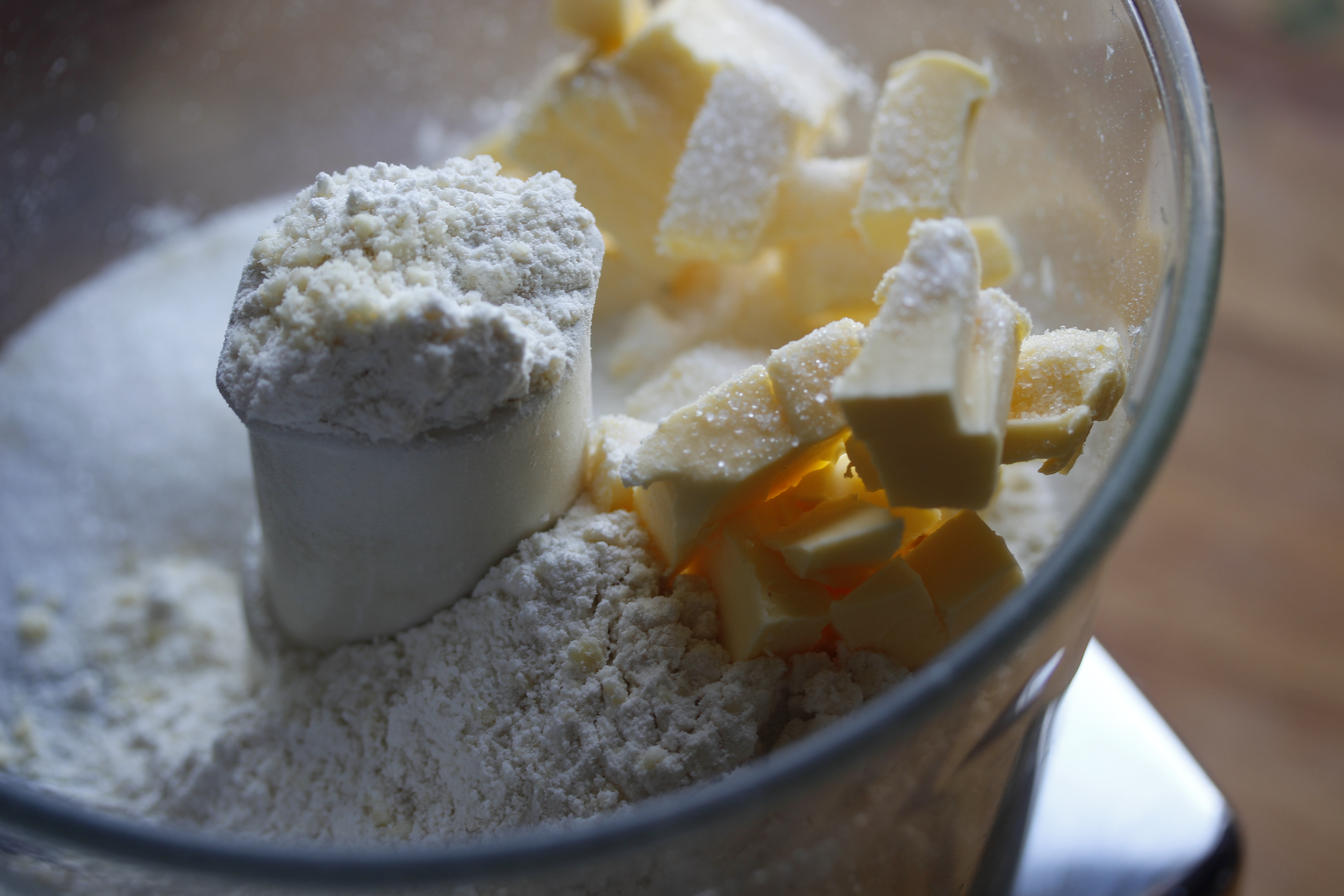 Svo vigtaði ég 200 g af hveiti og 50 g af möndlumjölinu og setti í matvinnsluvélina, ásamt 120 g af köldu smjöri, skornu í smábita, 3 msk af sykri og svolitlu salti. Lét vélina ganga þar til allt var orðið að fíngerðri mylsnu og bætti svo ísköldu vatni út í smátt og smátt (líklega svona 1 1/2 msk í allt) þar til auðvelt var að hnoða deigið saman og hægt að fletja það út en það var þó fremur lint og meðfærilegt, alls ekki þurrt eða stíft.