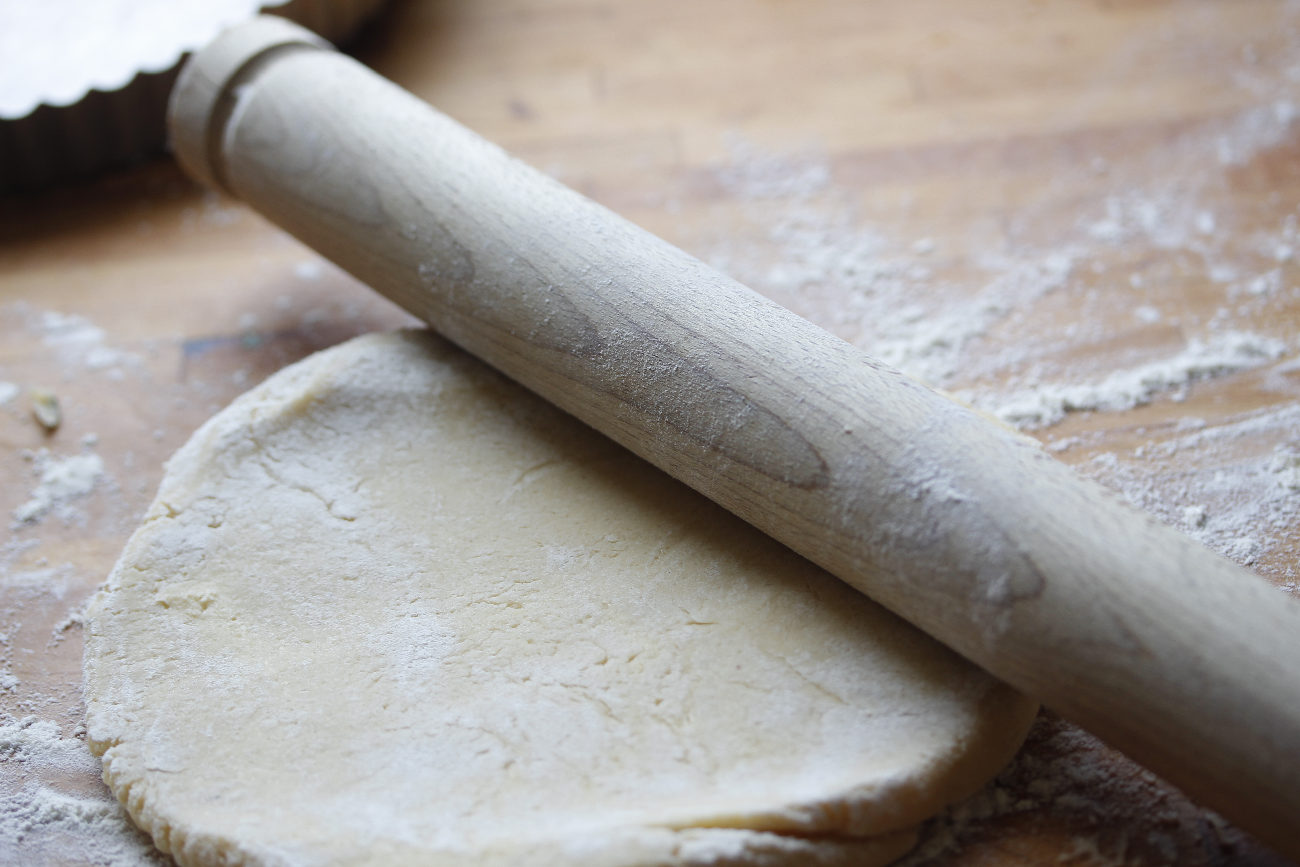Ég flatti það út á hveitistráðu borði í hring, nægilega stóran til að þekja meðalstórt bökumót – bæði botninn og hliðarnar – vafði deiginu gætilega utan um kökukeflið, lyfti því og lagði yfir formið.