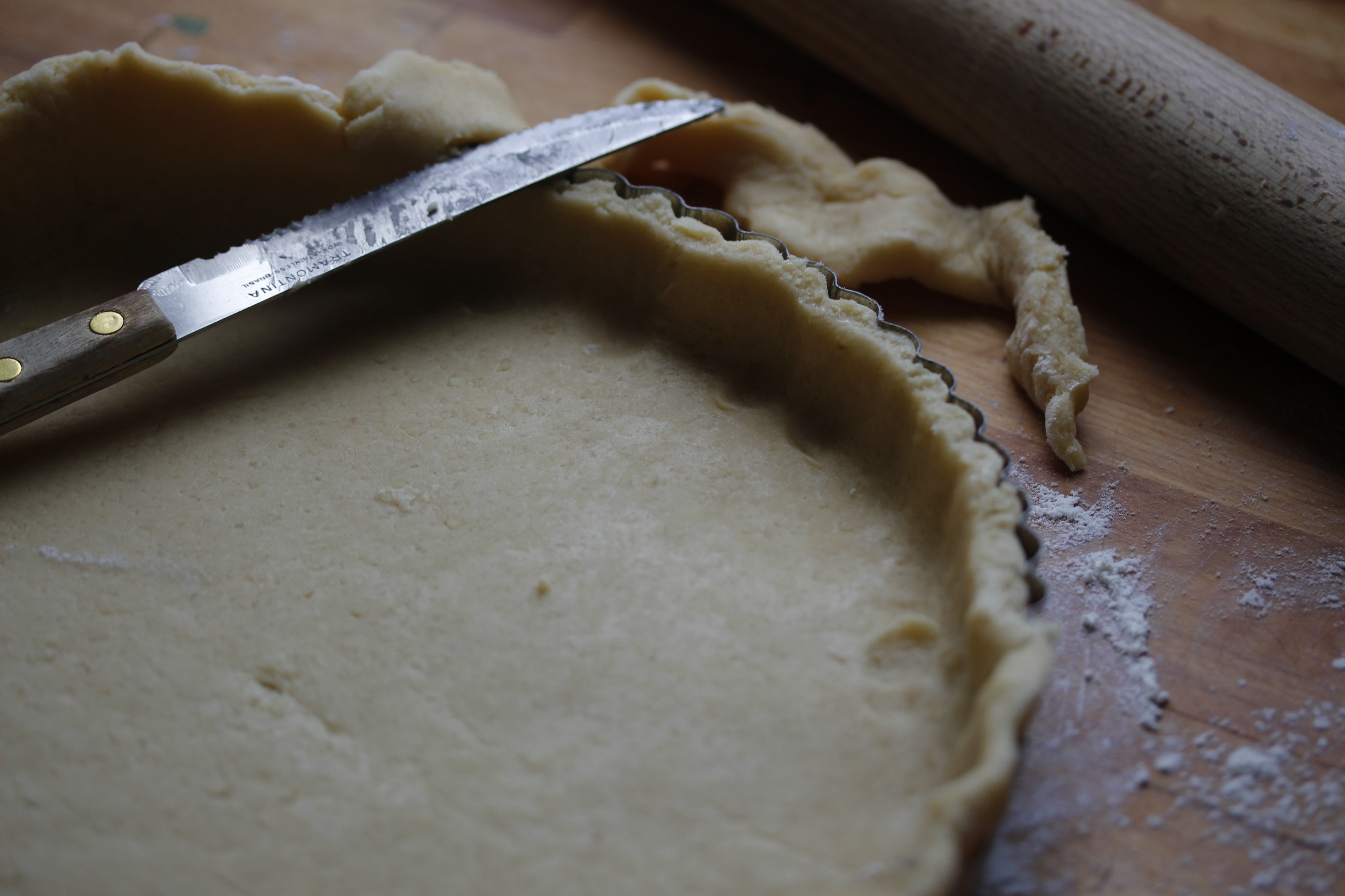 Ég þrýsti deiginu (ekki mjög fast) upp með hliðunum á forminu og snyrti brúnirnar með hníf. Ef kanturinn er þunnur eða rifinn einhvers staðar má nota afskurðinn til að bæta hann. Svo kældi ég deigið í hálftíma (eða lengur; en ef maður er að flýta sér má líka setja það í frysti smástund).