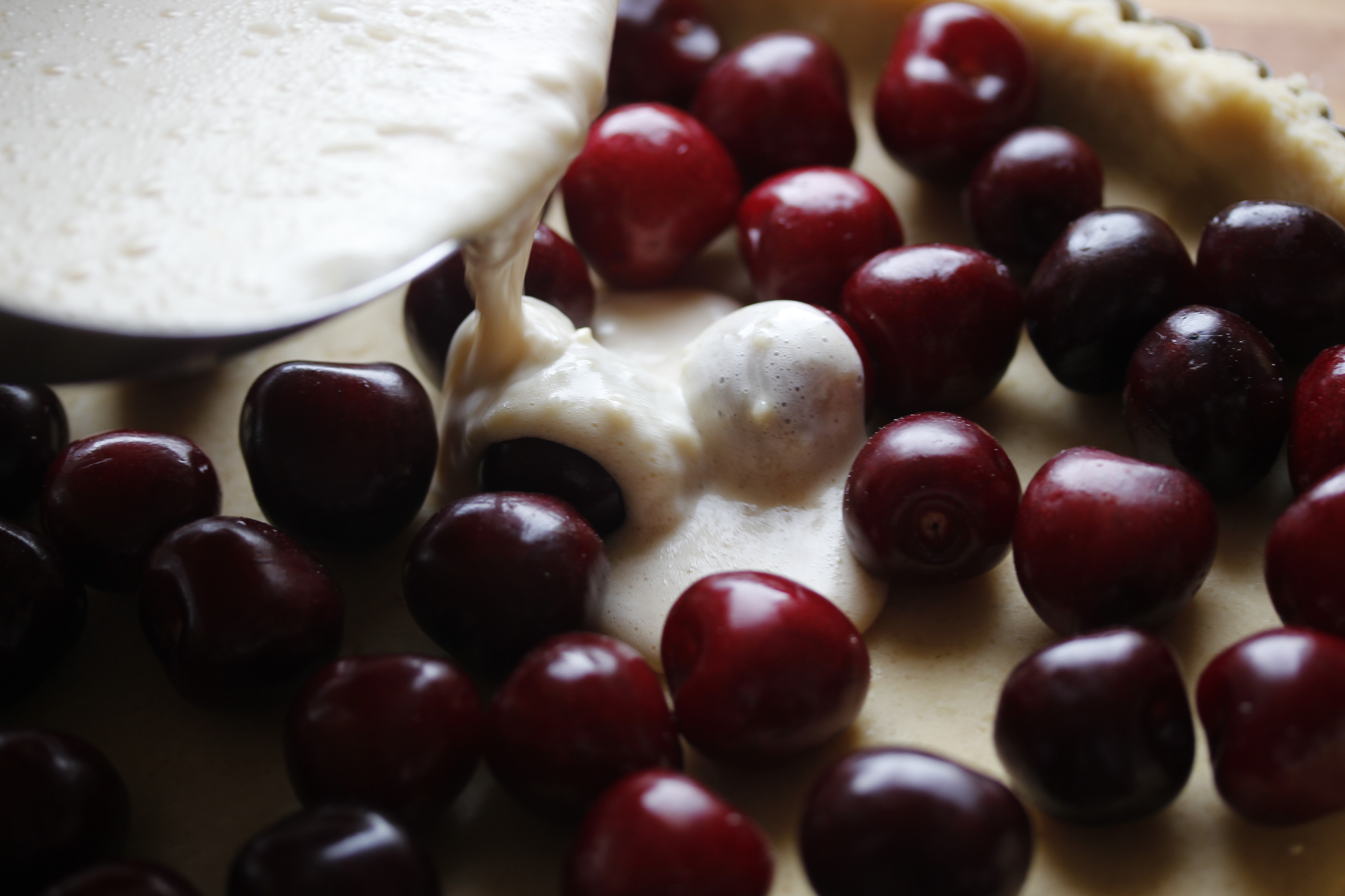 Ég náði svo í bökuskelina, dreifði kirsiberjunum í hana og hellti fyllingunni yfir.