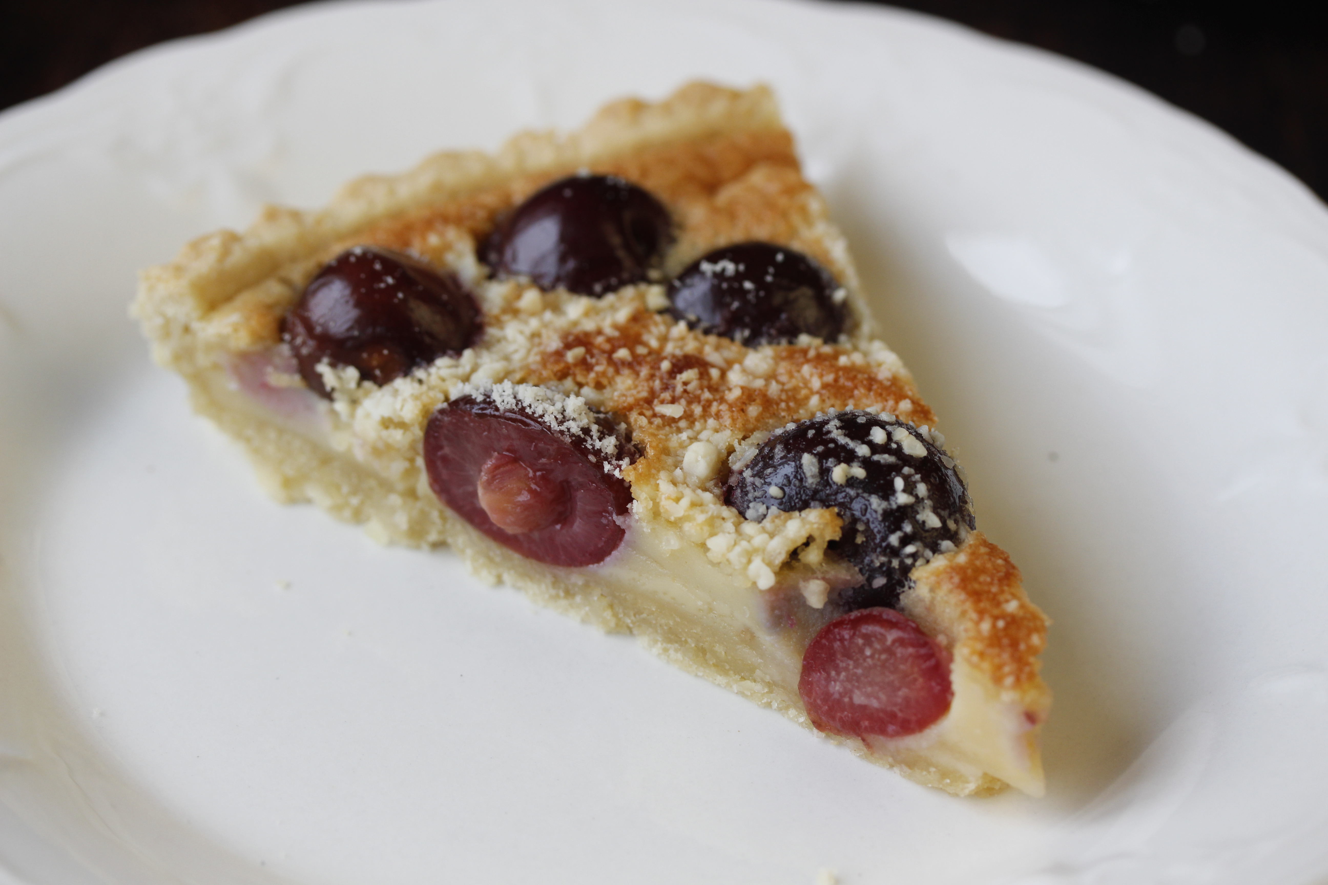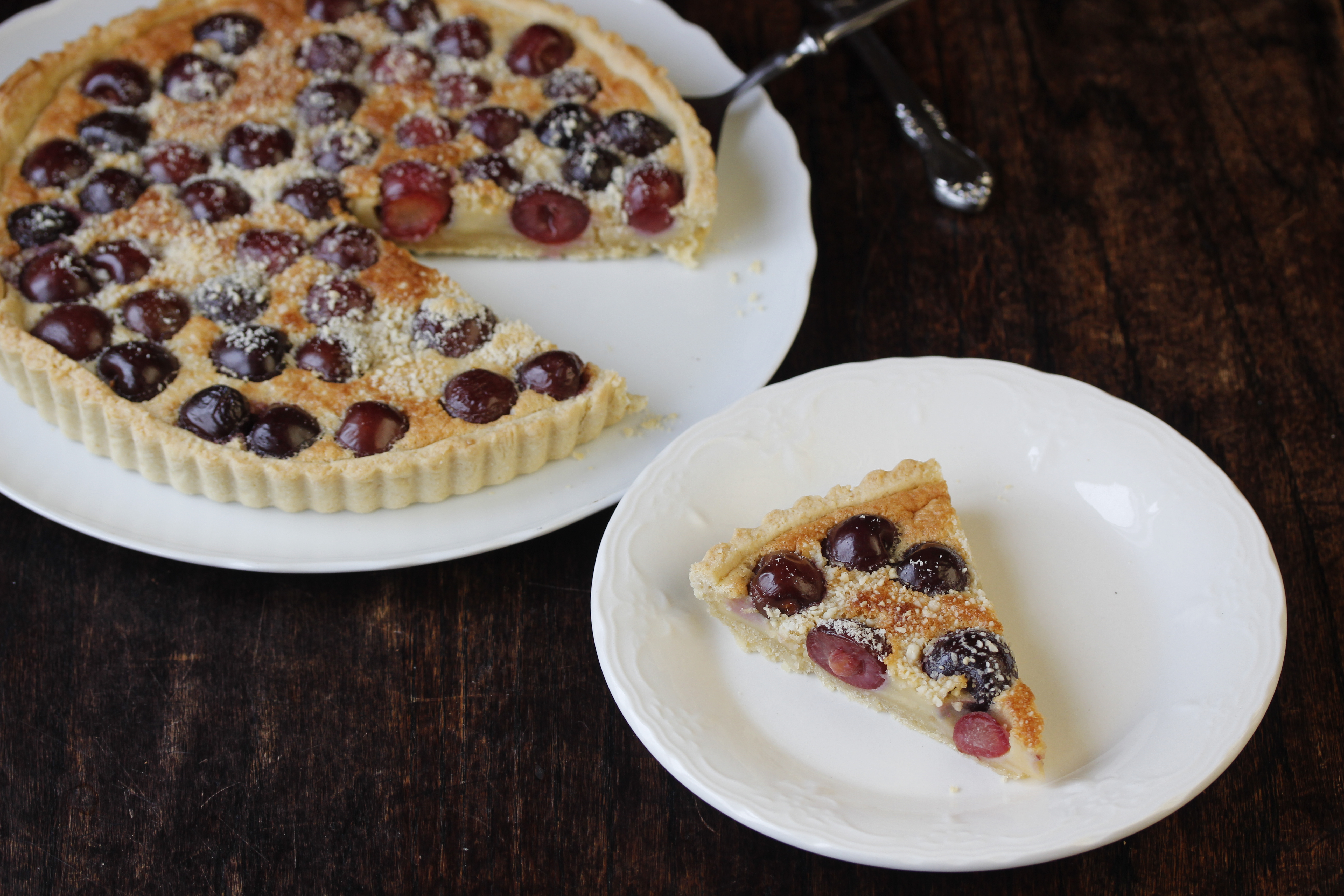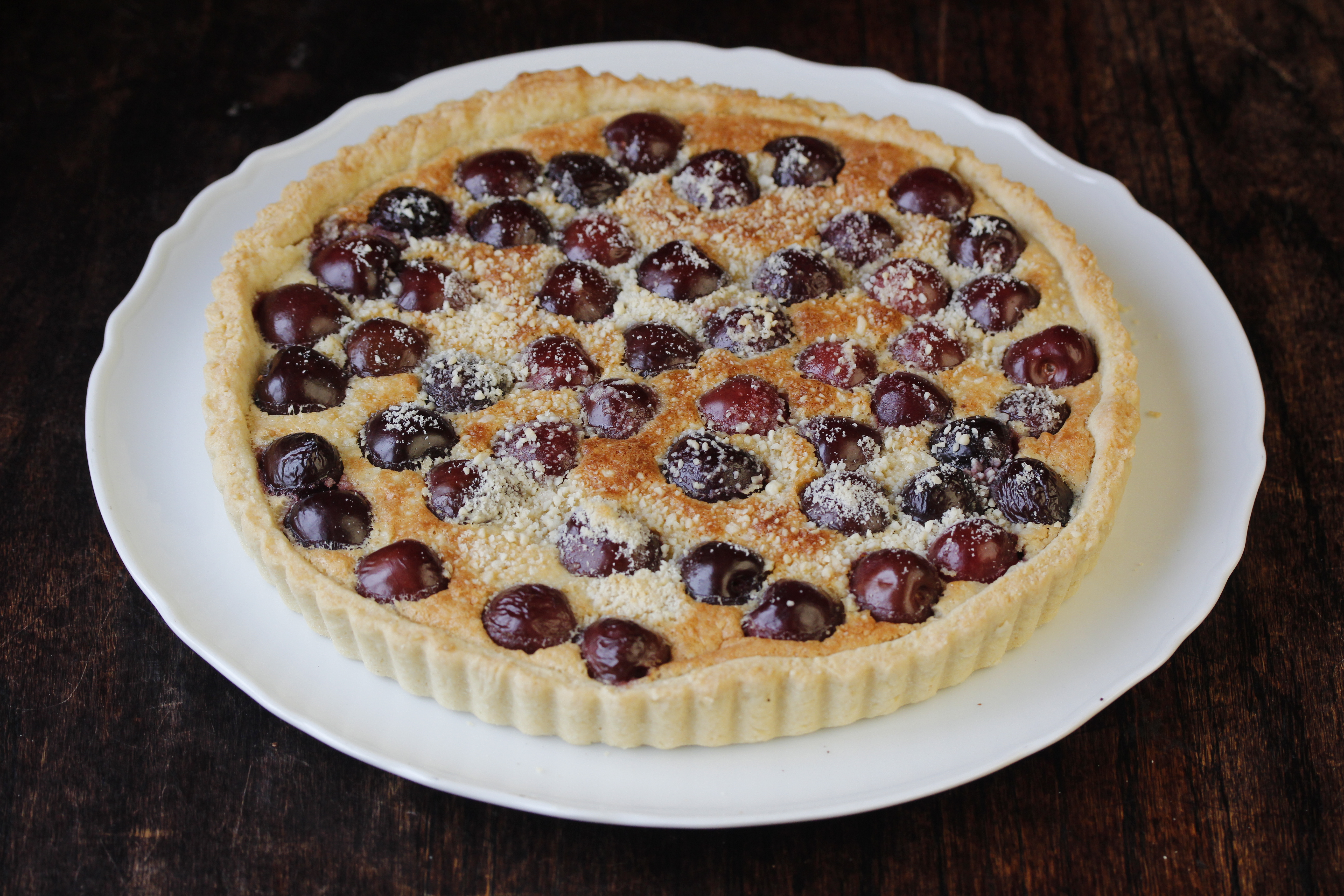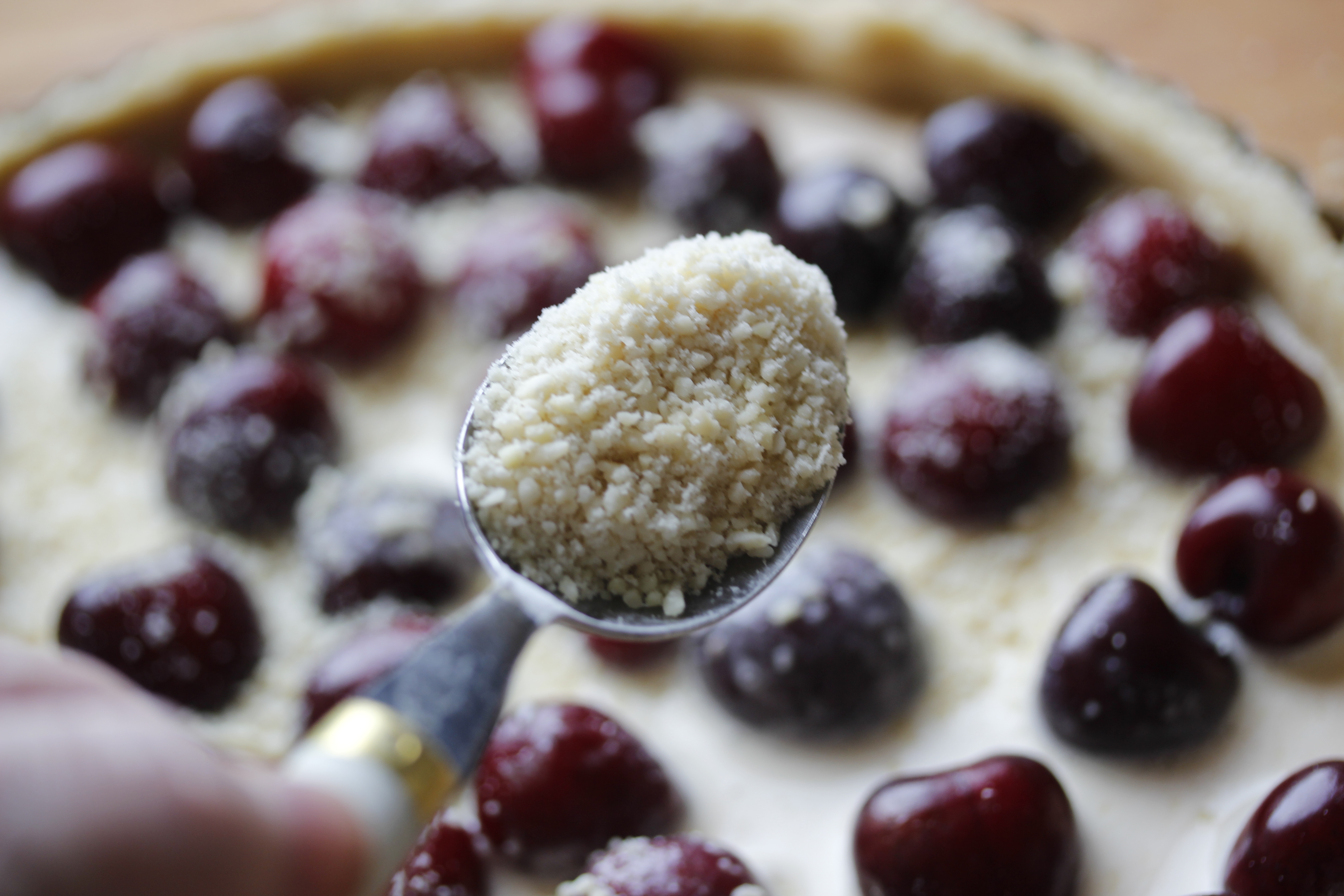 Svo þegar heim kom fór ég að velta fyrir mér hvað ég ætti að gera úr kirisberjunum. Það fyrsta sem mér datt í hug var clafoutis en um það hef ég nú skrifað hér áður svo ákvað ég að gera frekar böku – reyndar hálfgert clafoutis í bökuformi en ætli ég kalli þetta ekki frangipane – eða líklega annars best að sleppa frönskunni alveg. Ég kann svo lítið í henni hvort eð er. Þetta er bara kirsiberja-möndlubaka.