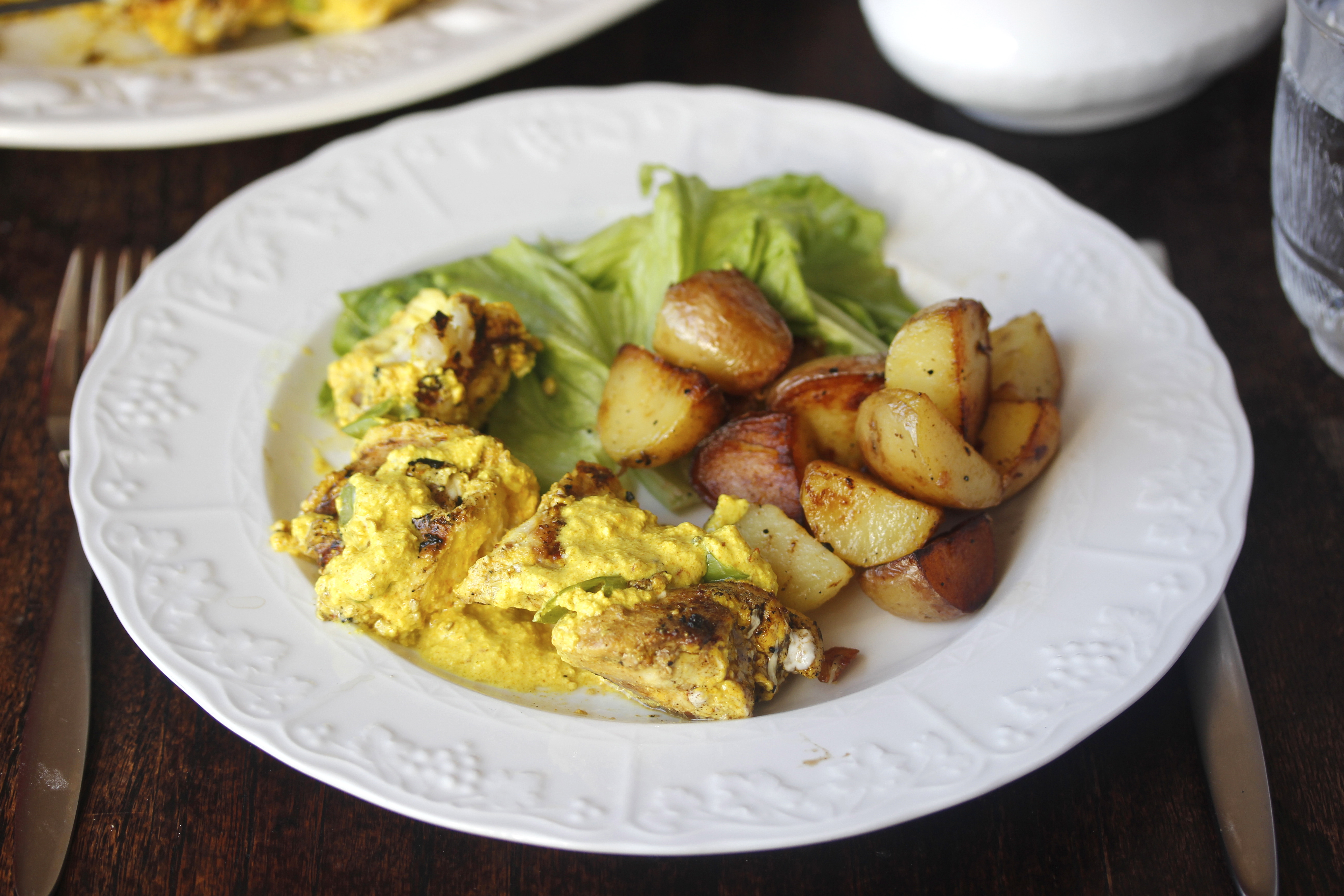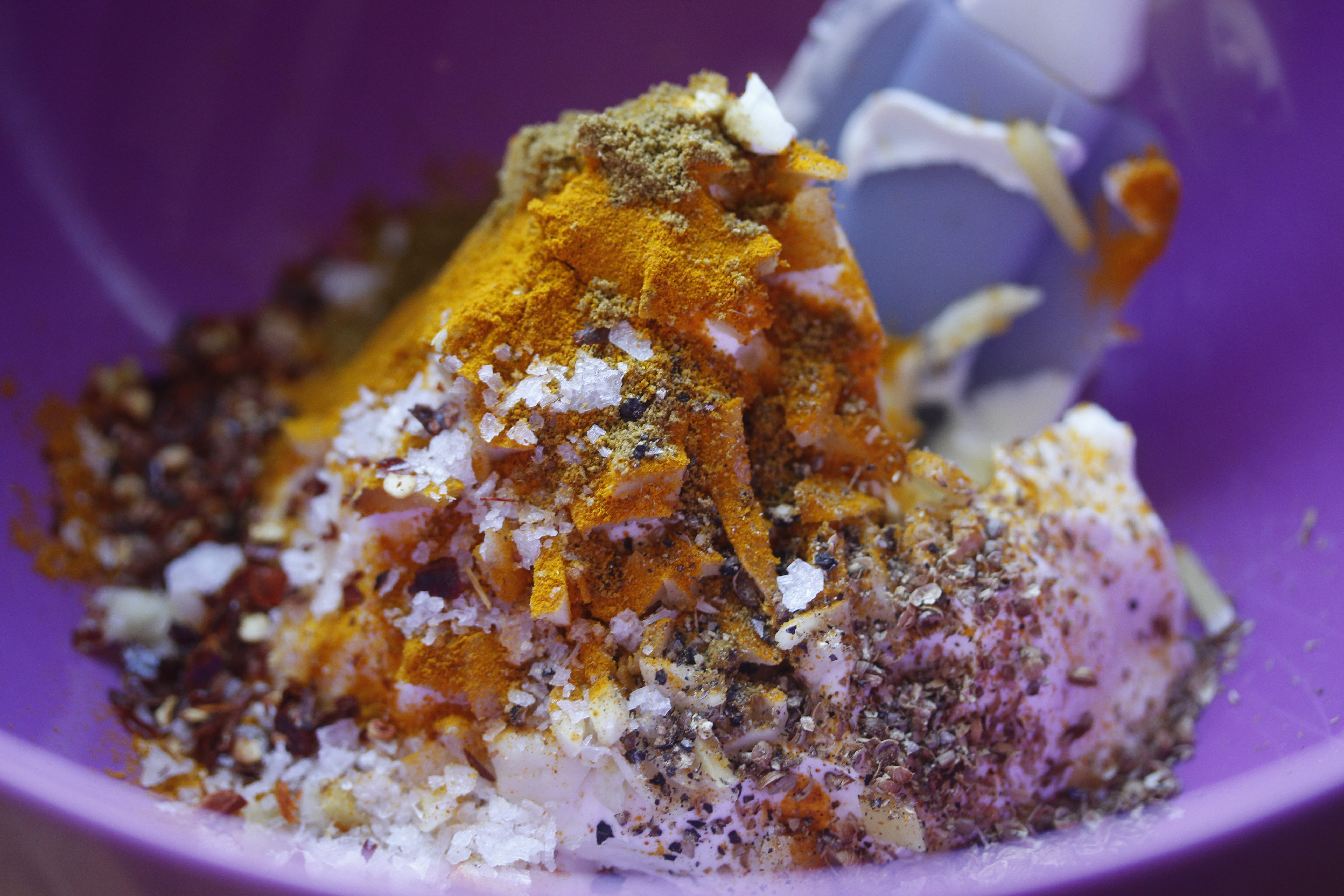 Ég setti 200 g af grísk jógúrt, 1 msk af smátt saxaðri engiferrót, 2 smátt saxaða hvitlauksgeira, 1 1/2 tsk af túrmeriki, 1 tsk af kummini, 1 tsk af möluðum kóríanderfræjum, 1/4 tsk af ciliflögum, pipar og salt í skál og blandaði vel.