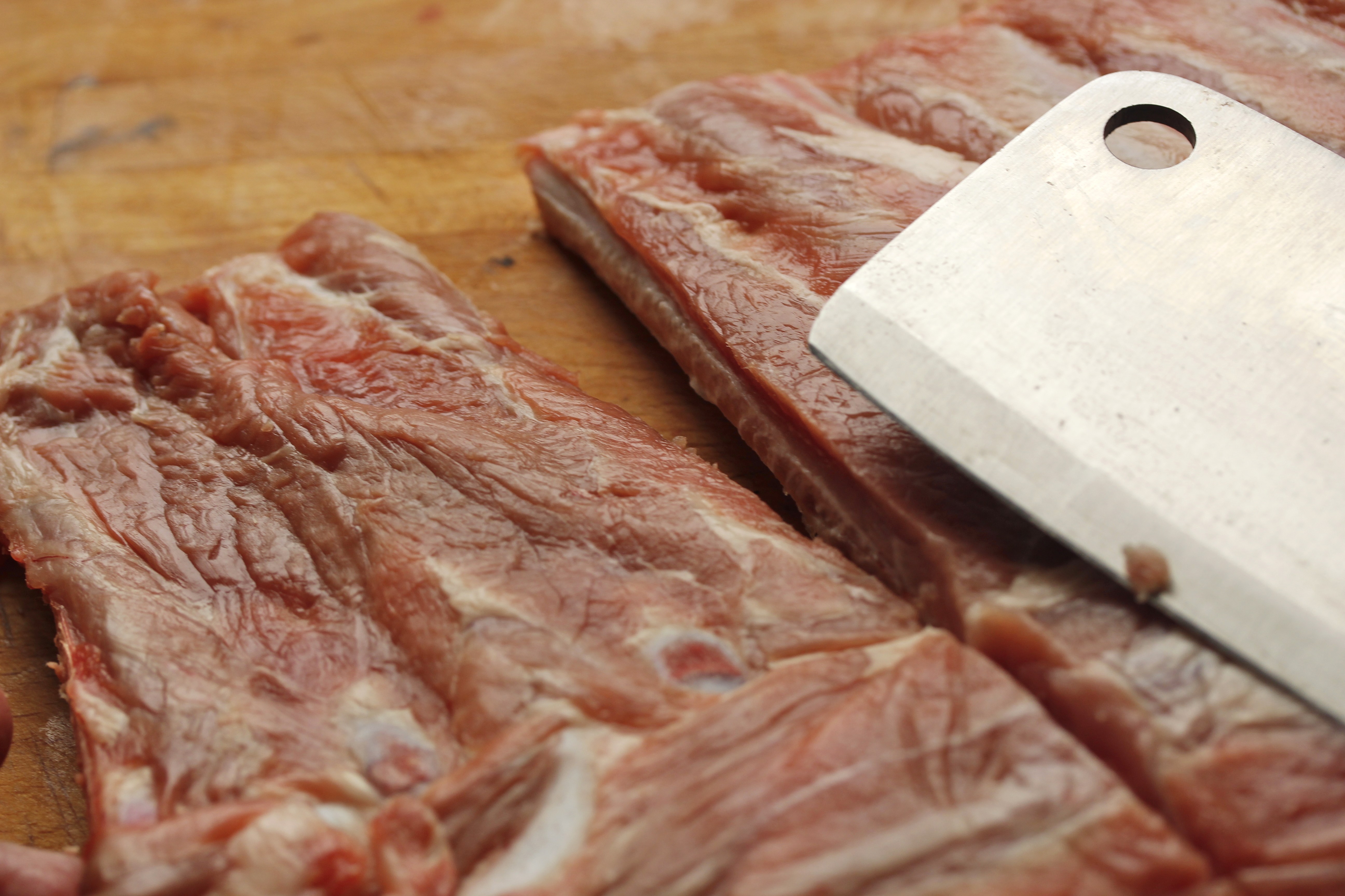 Stundum hef ég rifjalengjurnar bara heilar – og hefði kannski gert það ef þær hefðu verið jafnstórar – en núna hjó ég þær í bita, þessa heilu í fjóra og hina í tvo.