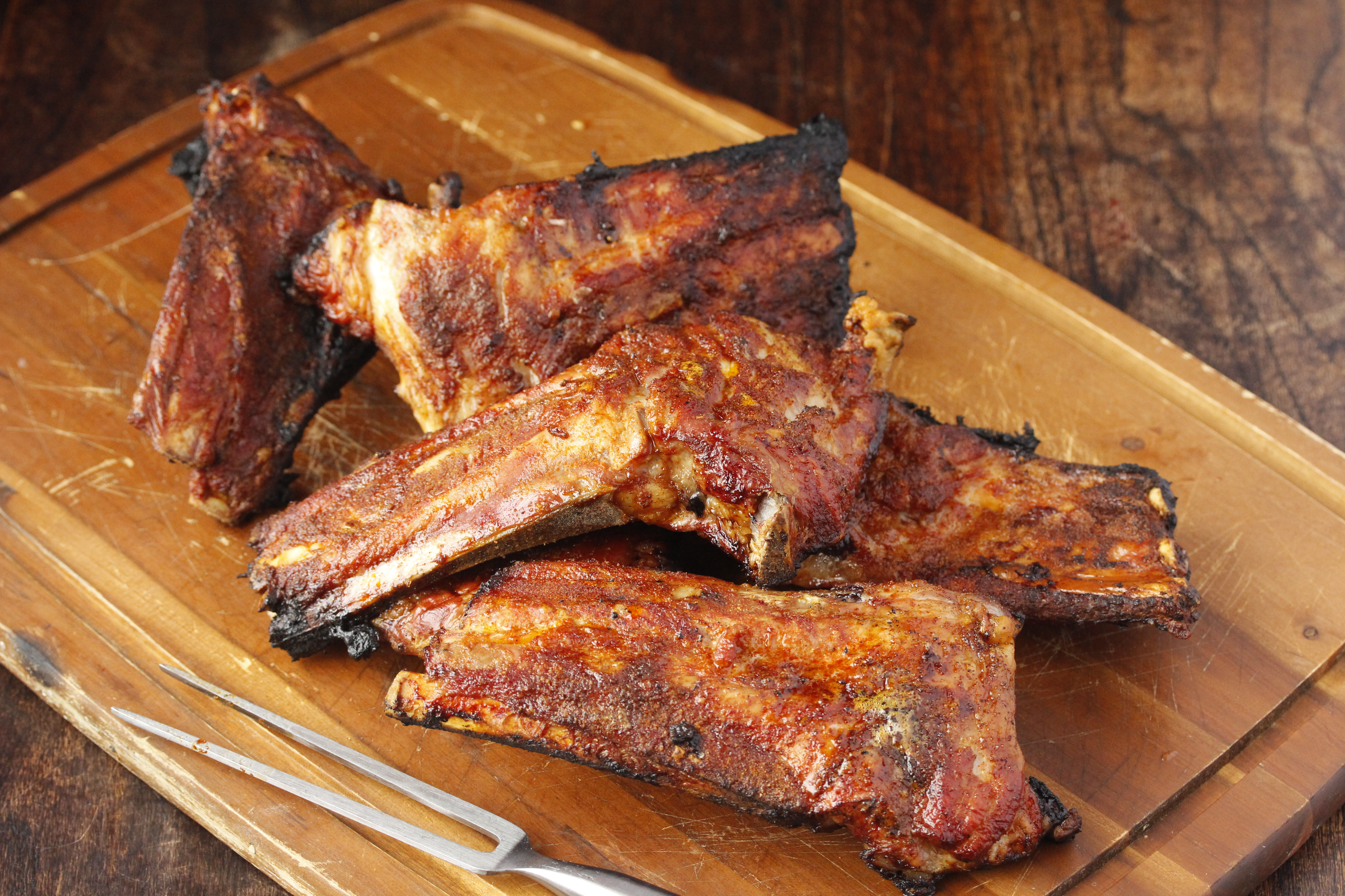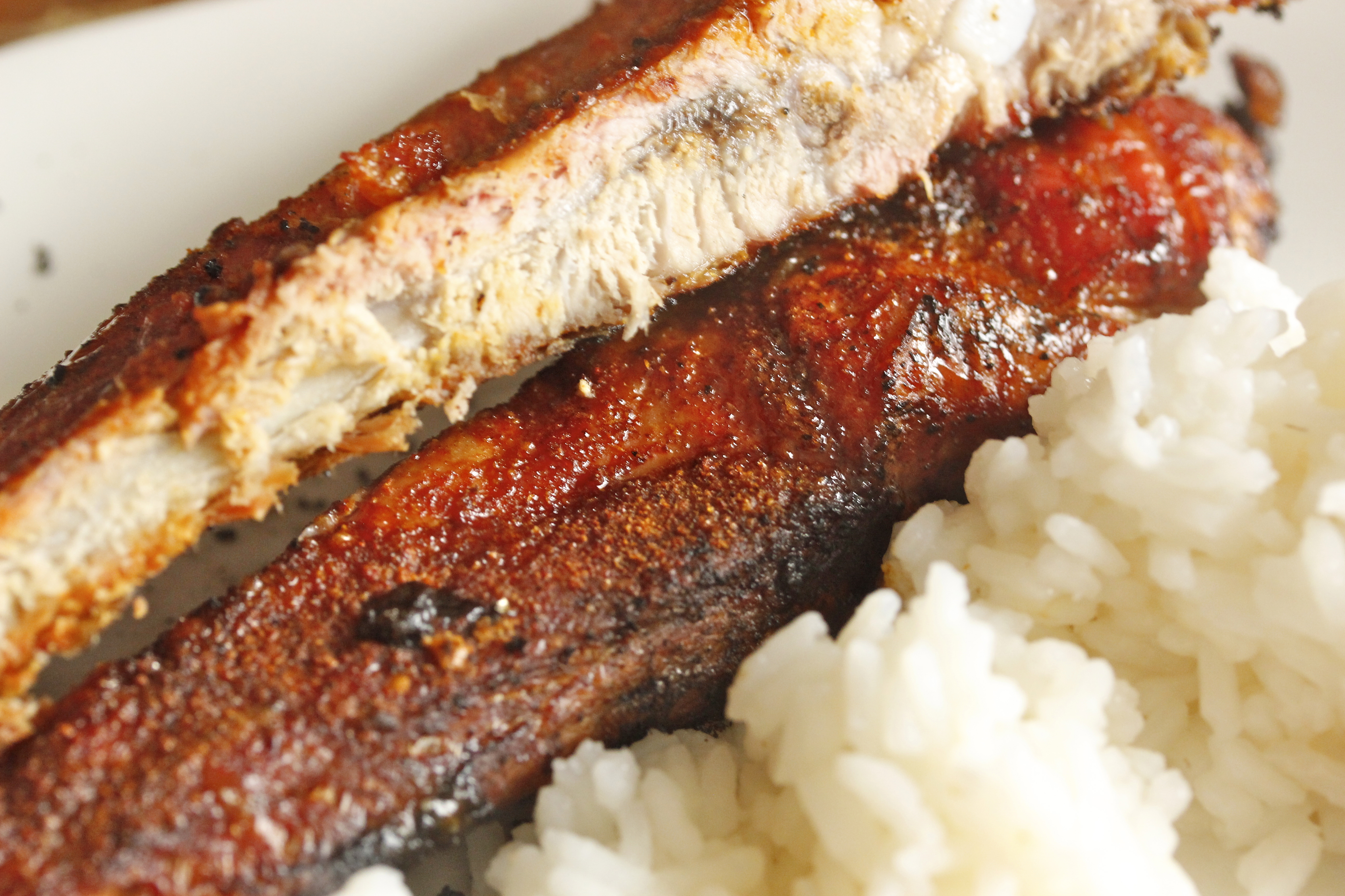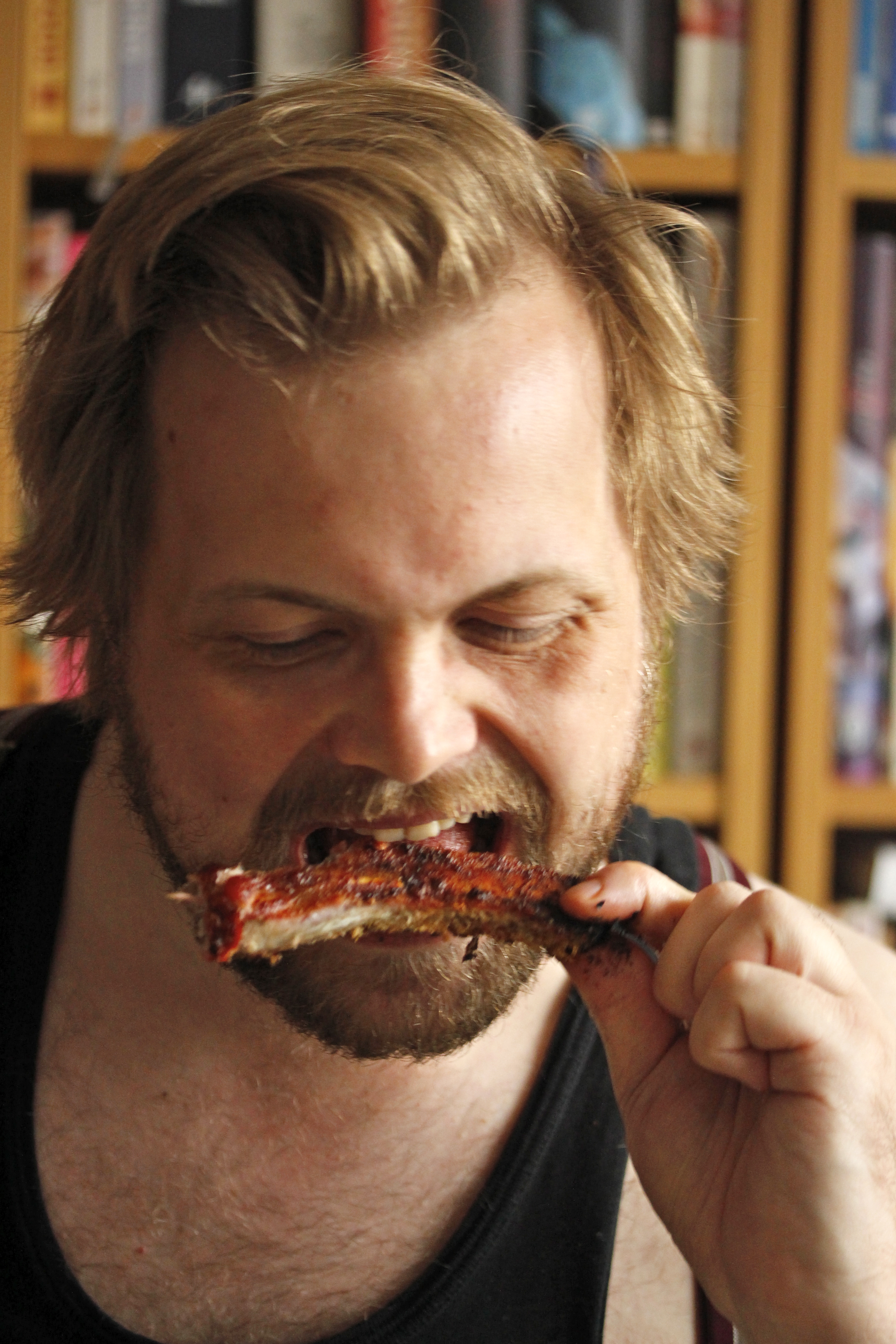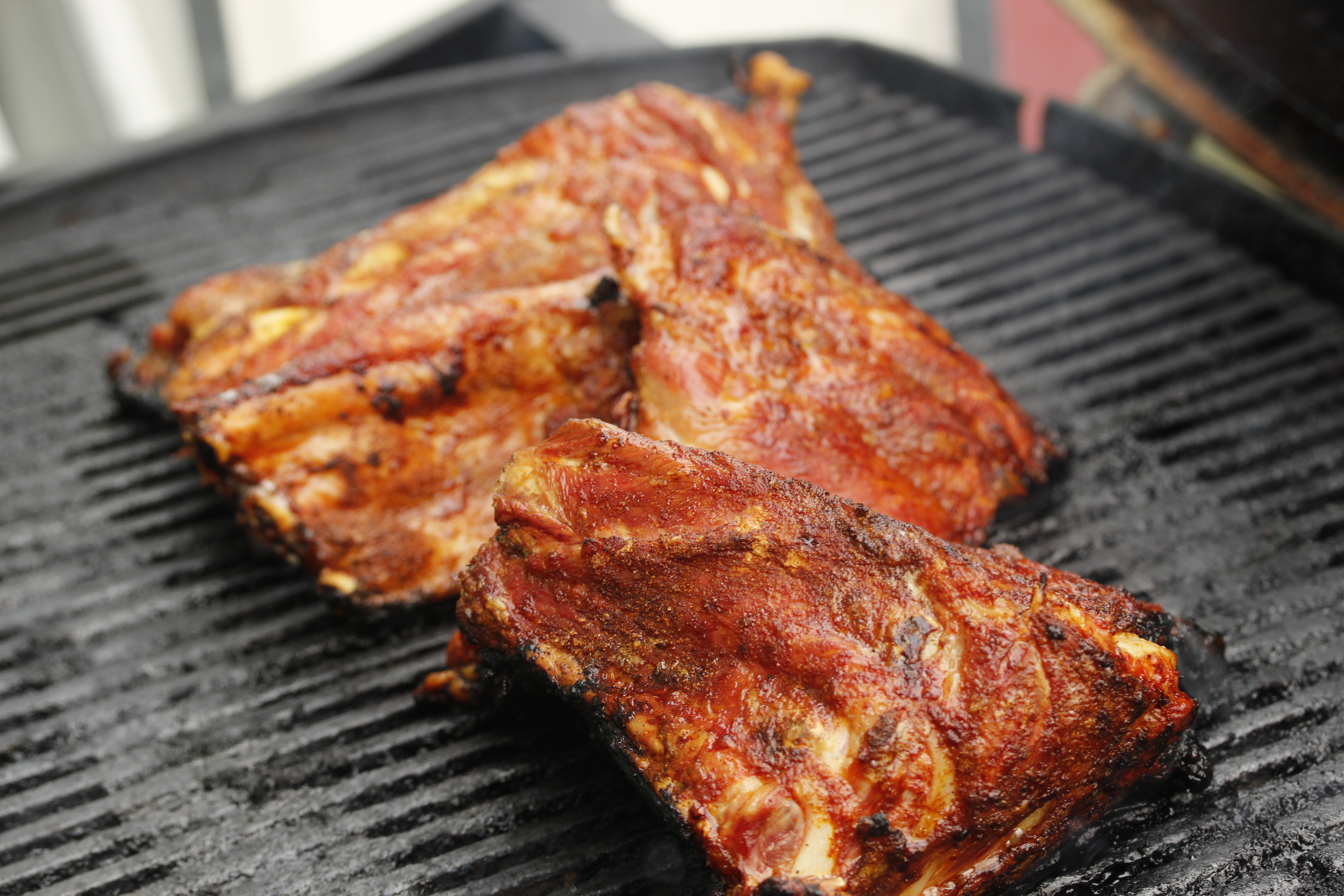 Lokaði svo grillinu aftur og leit ekki á rifin fyrr en þau voru búin að vera í svona klukkutíma og korter á grillinu en þá voru þau líka tilbúin. Tveir bitanna höfðu reyndar dottið og lagst flatir og voru dálítið brenndir að neðan en það má bara skafa af þeim … Annars má líka hlífa kjötinu með því að setja álpappírsbút undir, ekki of stóran.