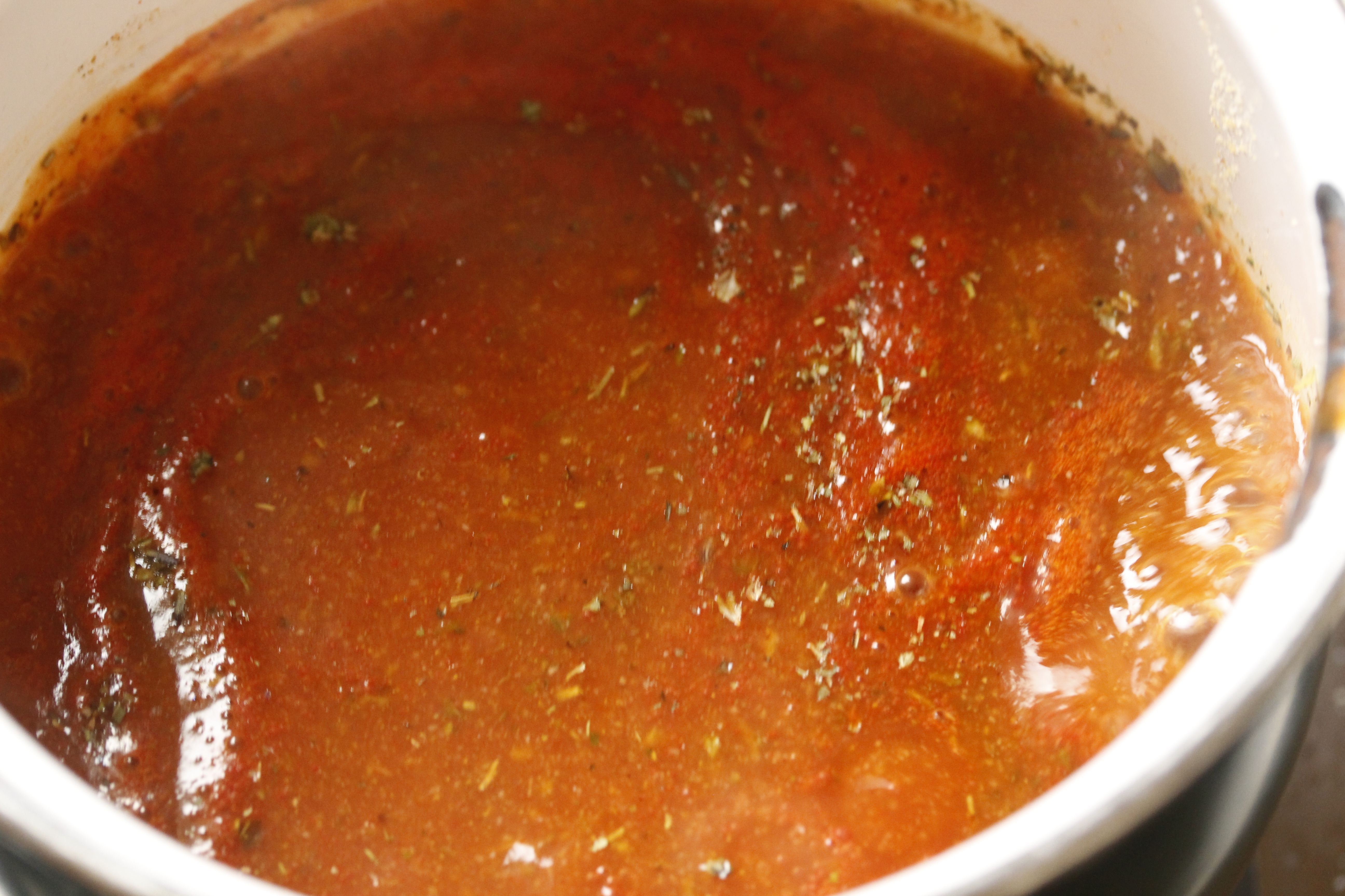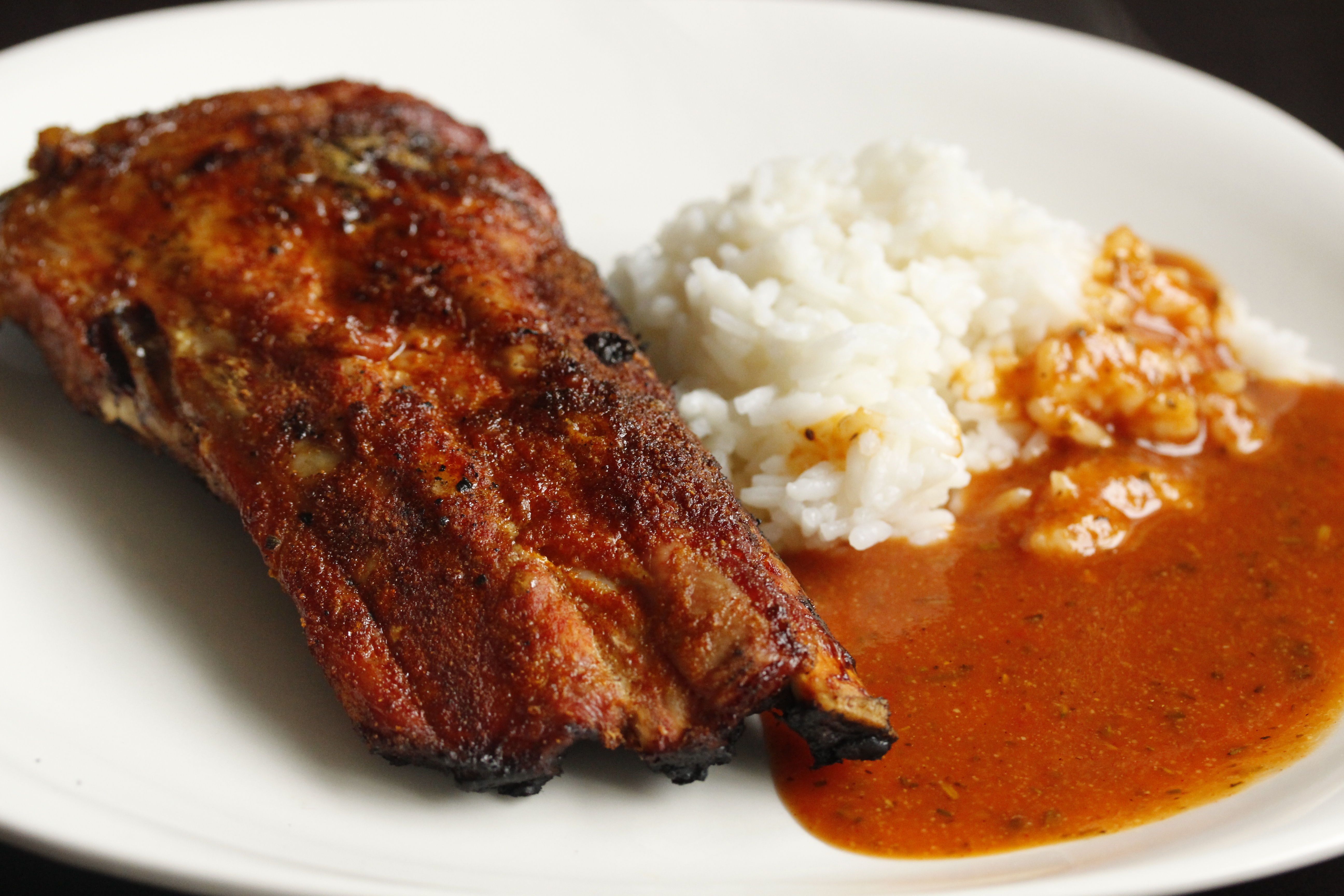 Á meðan hafði ég soðið hrísgrjón og slumpað saman sósu sem var einhvern veginn svona: slatti af tómatsósu, dálítið sætt sinnep, væn skvetta af Frank’s Louisiana Hot Sauce (eða annarri chilisósu), matskeið af ediki, matskeið af púðursykri, lauksalt, hvítlaukssalt, tvær teskeiðar herbes de provence, vatn eftir þörfum … ég er örugglega að gleyma einhverju en þetta var semsagt slumpasósa. Soðið saman í nokkrar mínútur.
