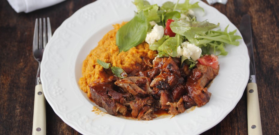Á meðan gerði ég sæta kartöflustöppu, kryddaða með kanel, og salat með tómötum og fetaosti.