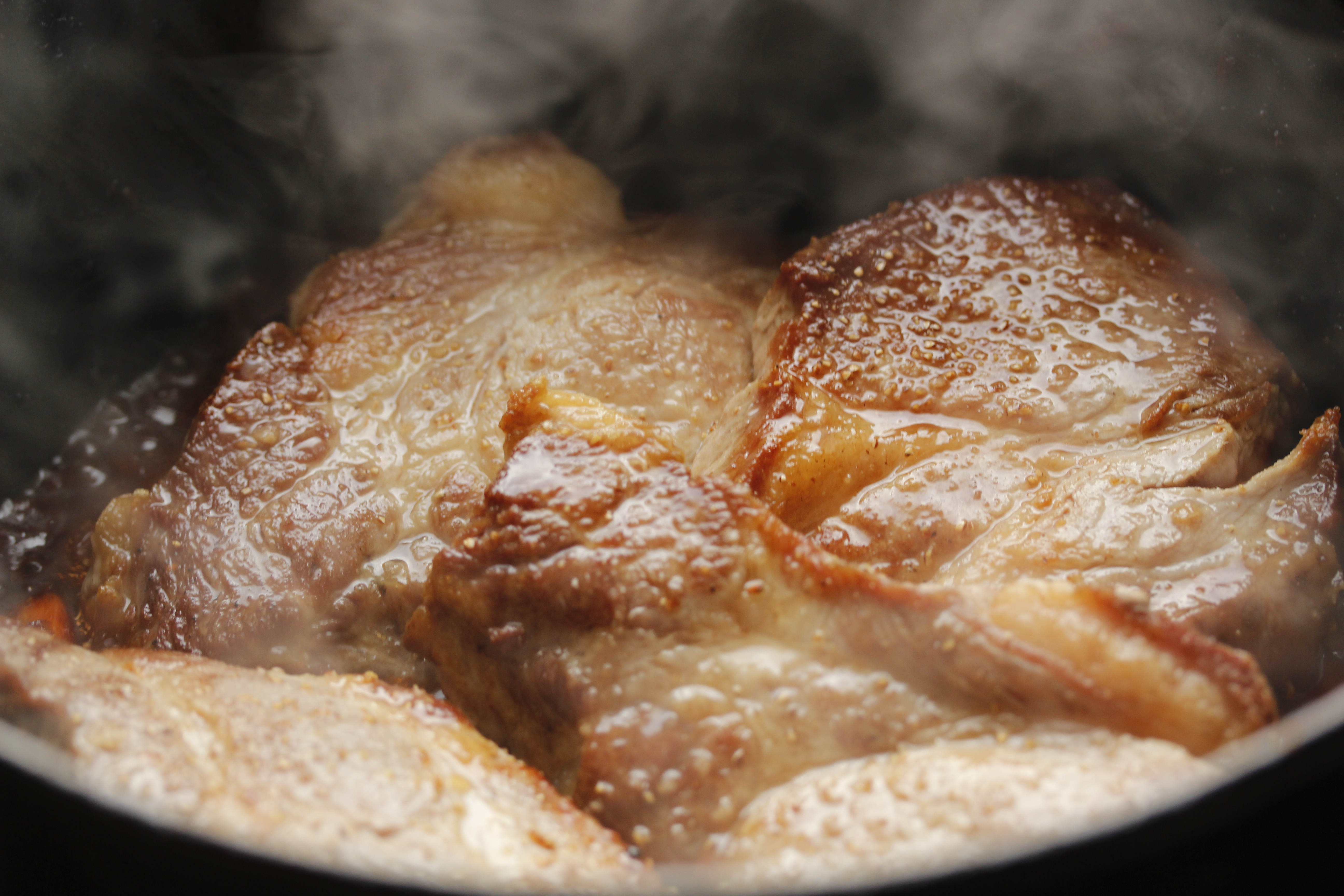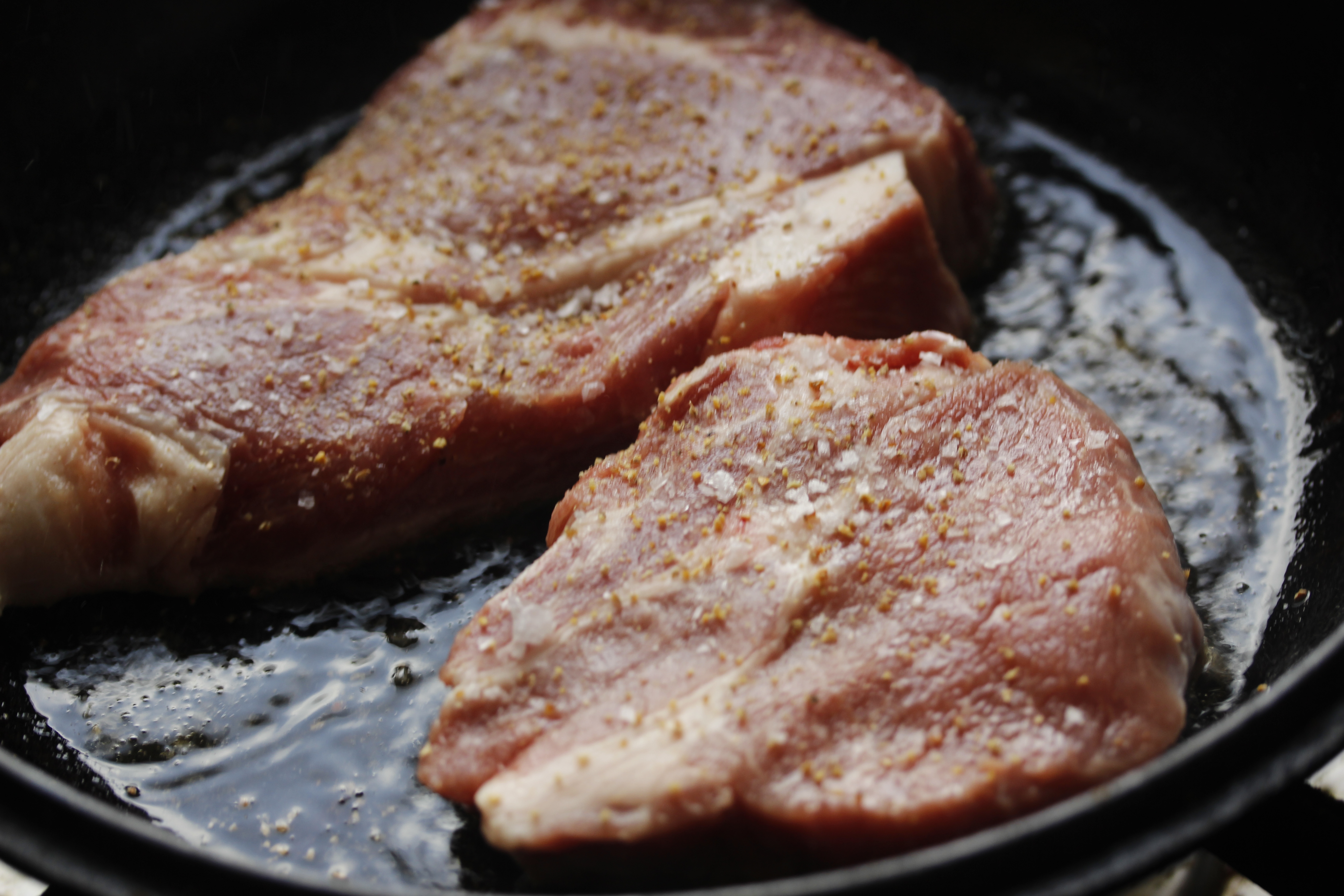 Þetta voru semsagt fjórar nokkuð þykkt skornar sneiðar af svínahnakka, vel fitusprengdar, samtals rétt rúm 800 grömm. Ég kryddaði þær með pipar og salti og brúnaði þær í 2 msk af olíu við góðan hita. Tók þær svo af pönnunni og setti á disk. Lodge-steypujárnspotturinn minn hefur þann kost að það er hægt að nota lokið sem pönnu svo ég gat brúnað allar sneiðarnar fjórar í einu.