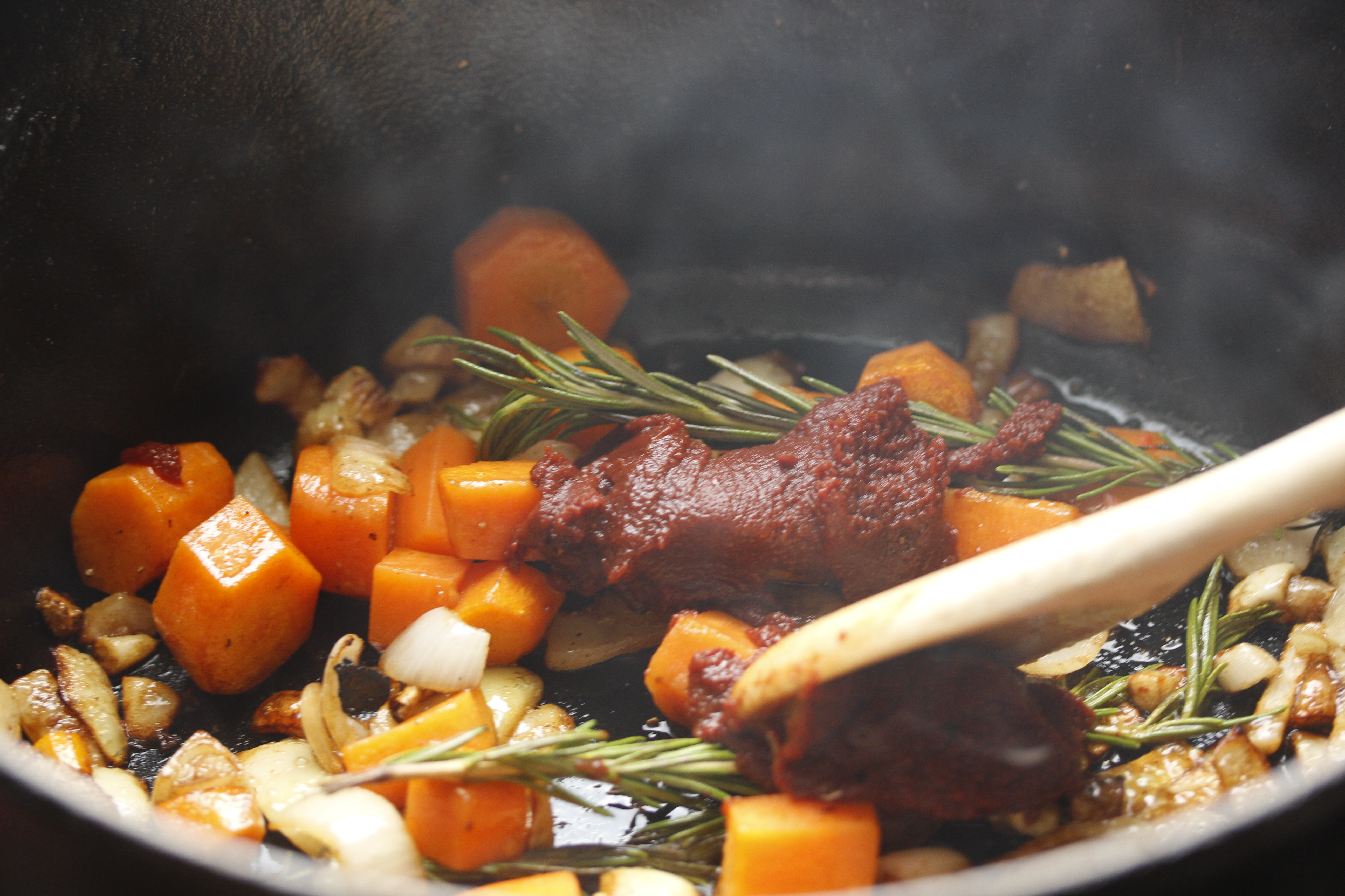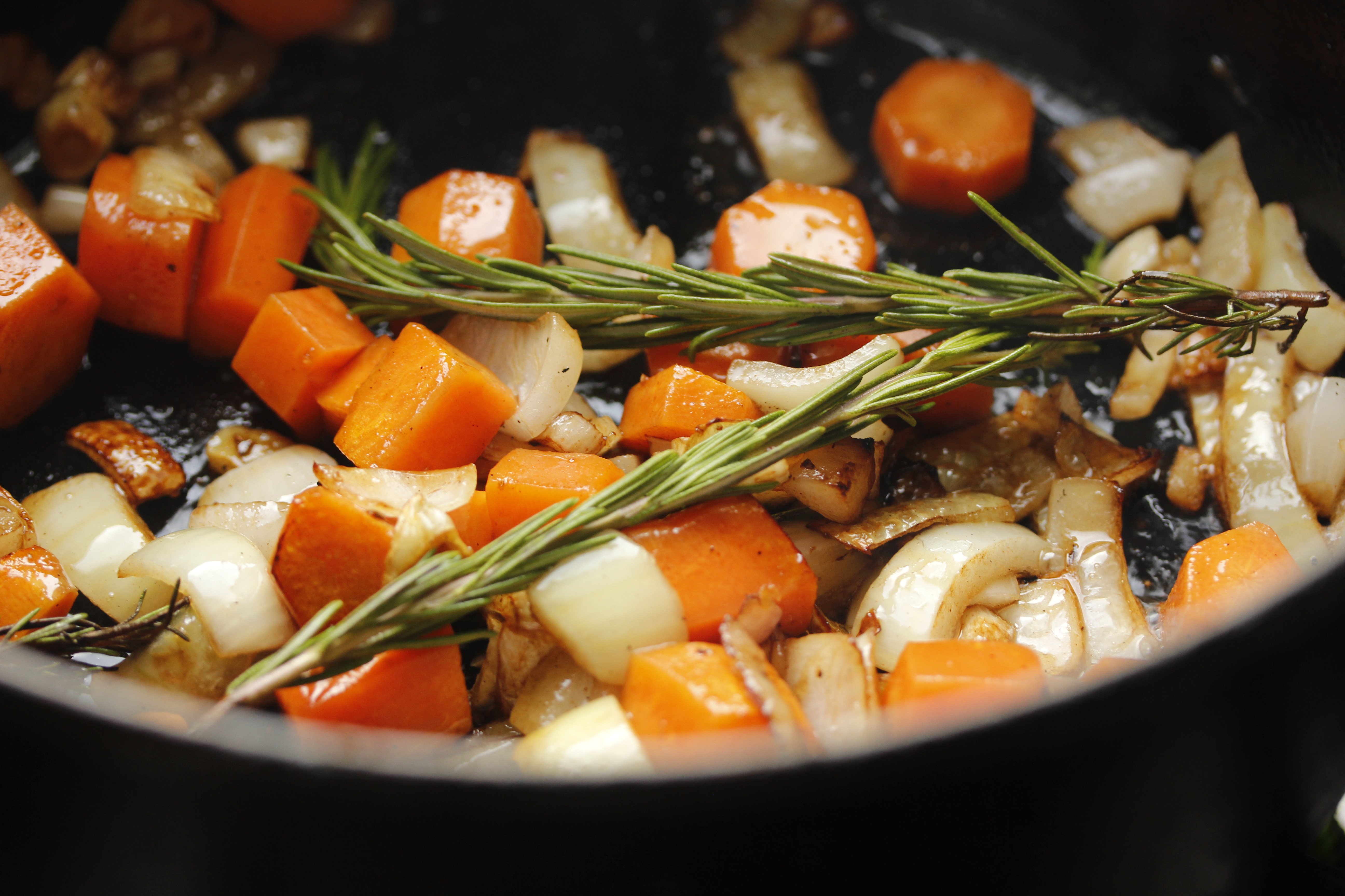 Ég var búin að skera niður einn lauk, tvo hvítlauksgeira og 5-6 (frekar litlar) gulrætur og setti þetta út i olíuna í pottinum og lét krauma í nokkrar mínútur. Kryddaði með pipar og salti og setti tvær rósmaríngreinar út í.