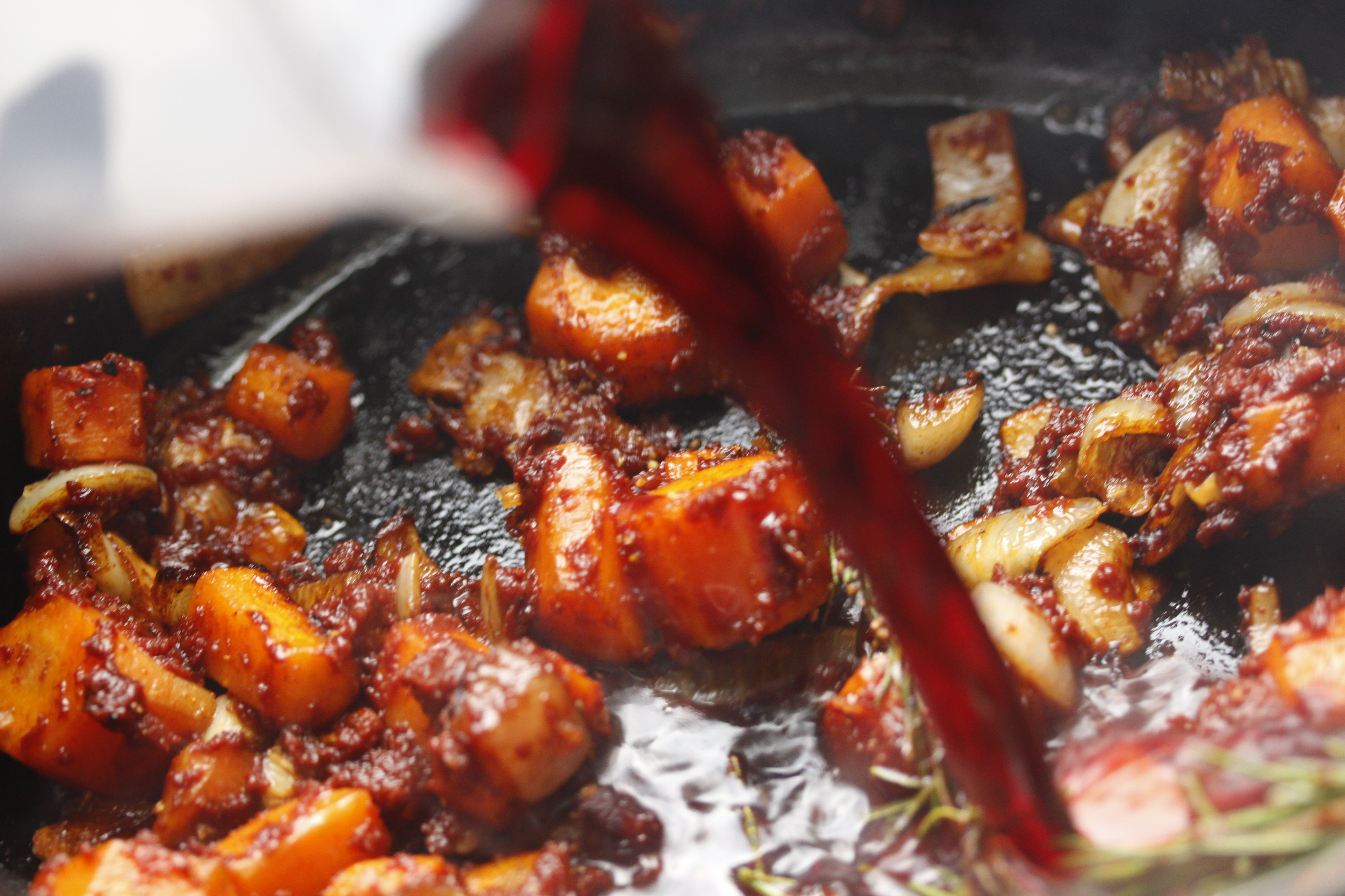 Svo hellti ég 150 ml af rauðvíni út í (ef maður á ekki rauðvín má nota vatn og bæta kannski við smáskvettu af rauðvínsediki) …