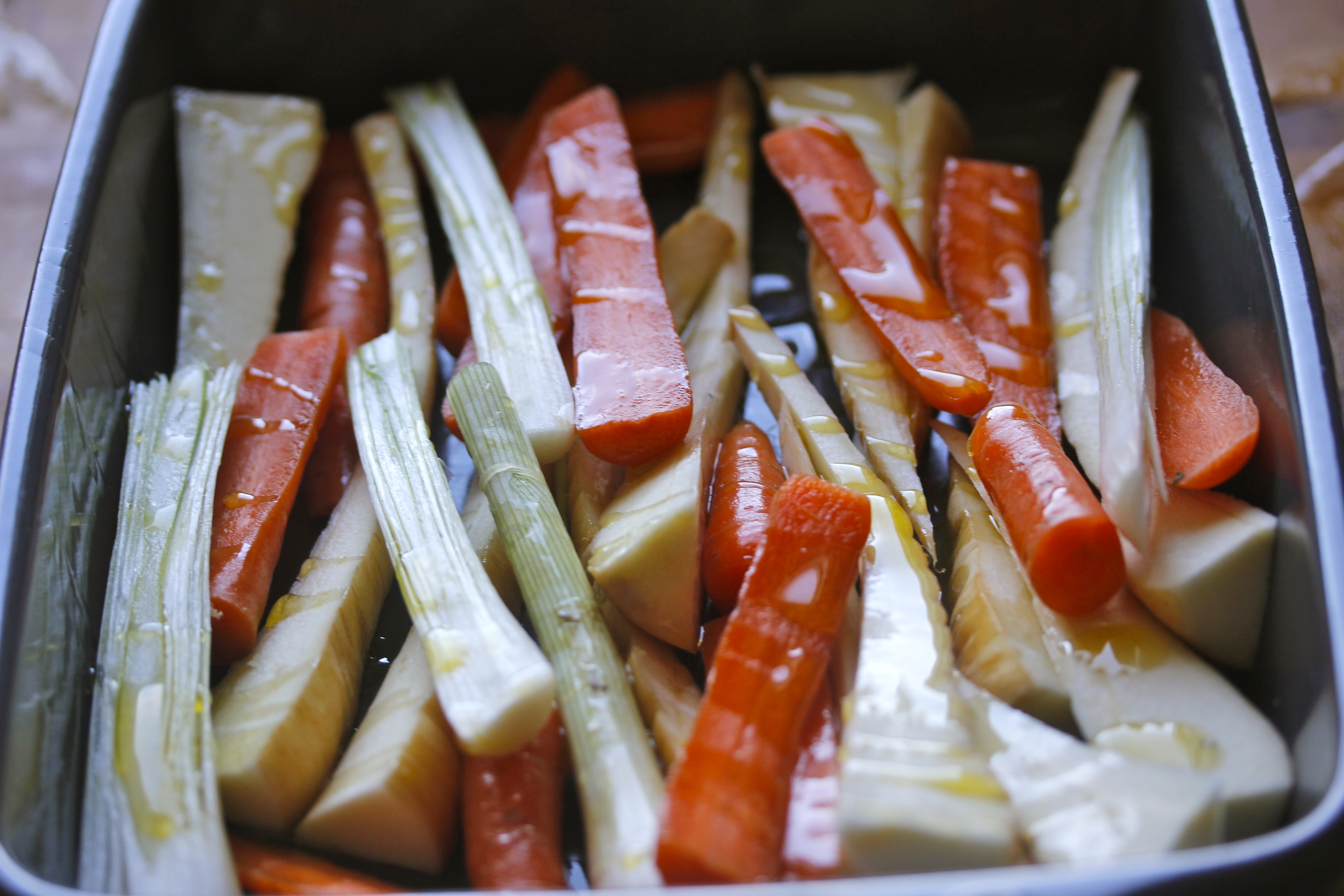 Ég skar nípurnar eftir endilöngu í 6-8 hluta hverja, eftir stærð, gulræturnar í 2-4 hluta eftir stærð (ef þær eru mjög litlar og mjóar má hafa þær heilar). Ég tók um 10 cm bút neðan af hverjum vorlauk, skar rótina af og skar laukana (þ.e. neðri hlutann) svo í tvennt eftir endilöngu.