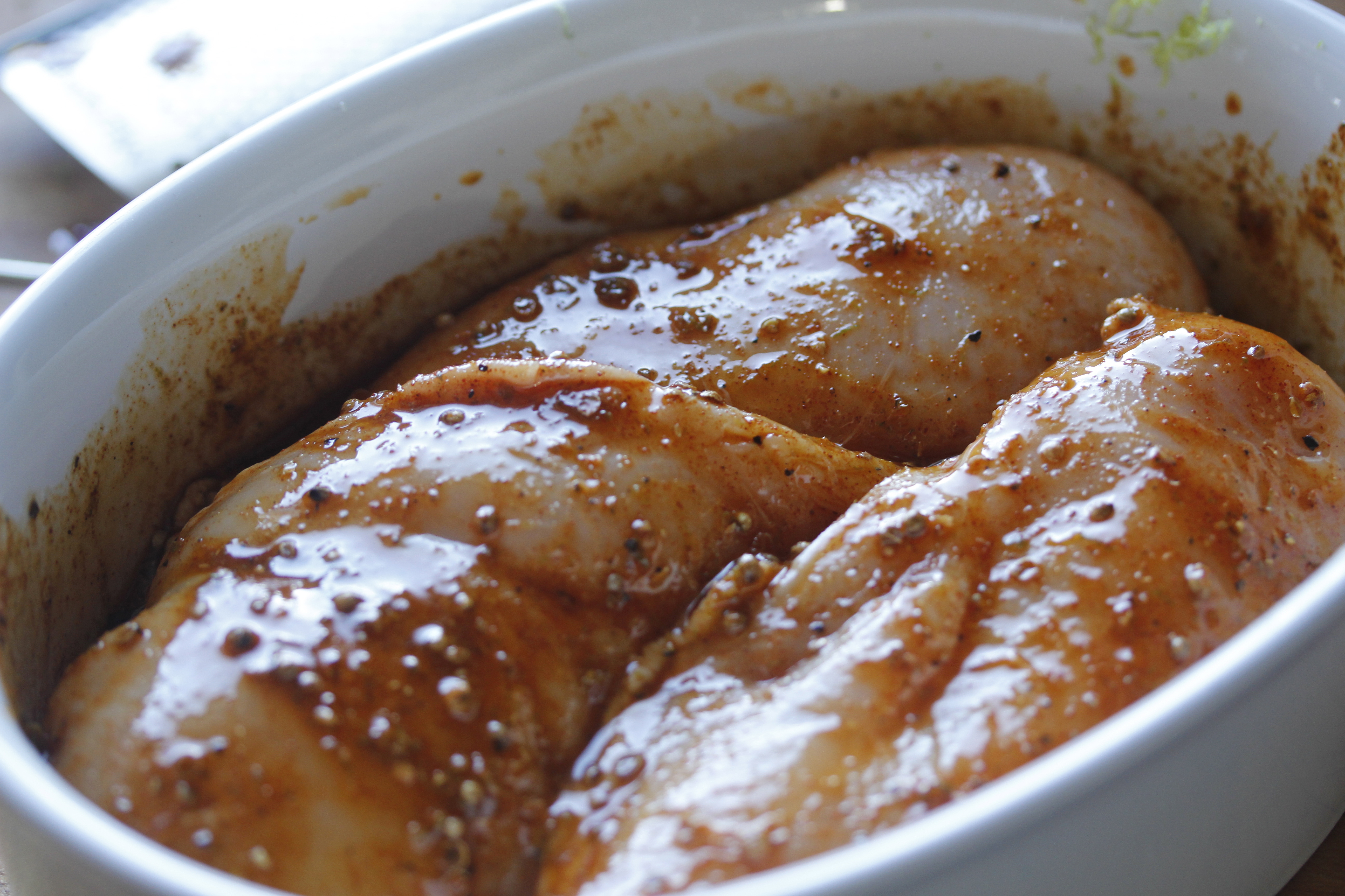 Ég var með þrjár kjúklingabringur og setti þær út í og velti þeim upp úr leginum. Lét þær standa í a.m.k. 1 klst. í kæli. Tók þær svo út og lét standa við stofuhita á meðan ég hitaði grillið. Ég kveikti líka á ofninum og stillti hann á 200°C.