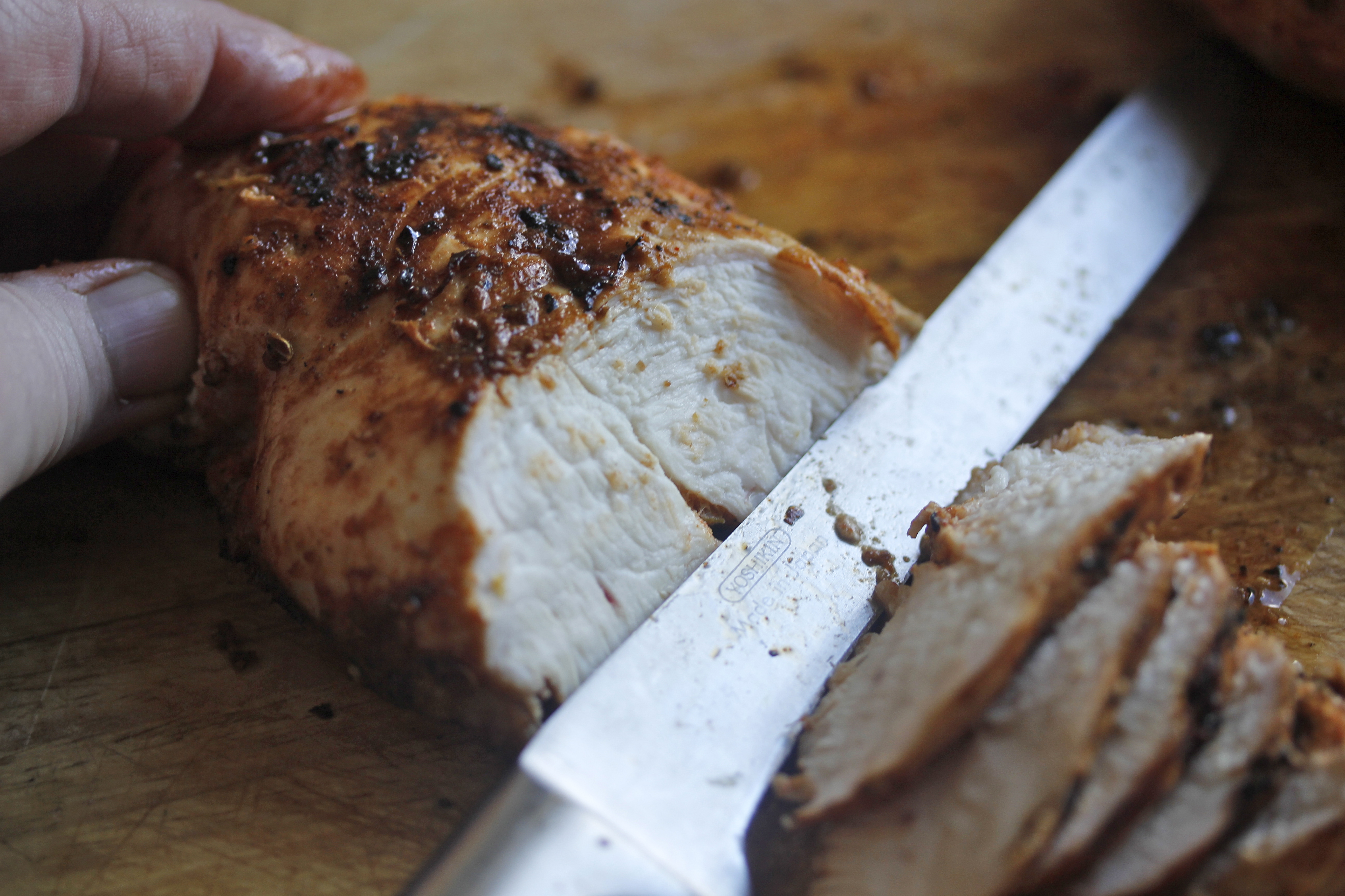 Ég tók svo bringurnar af grillinu þegar þær voru tilbúnar og lét þær standa í a.m.k. 5 mínútur áður en ég skar þær í 3-5 mm þykkar sneiðar.