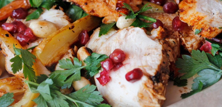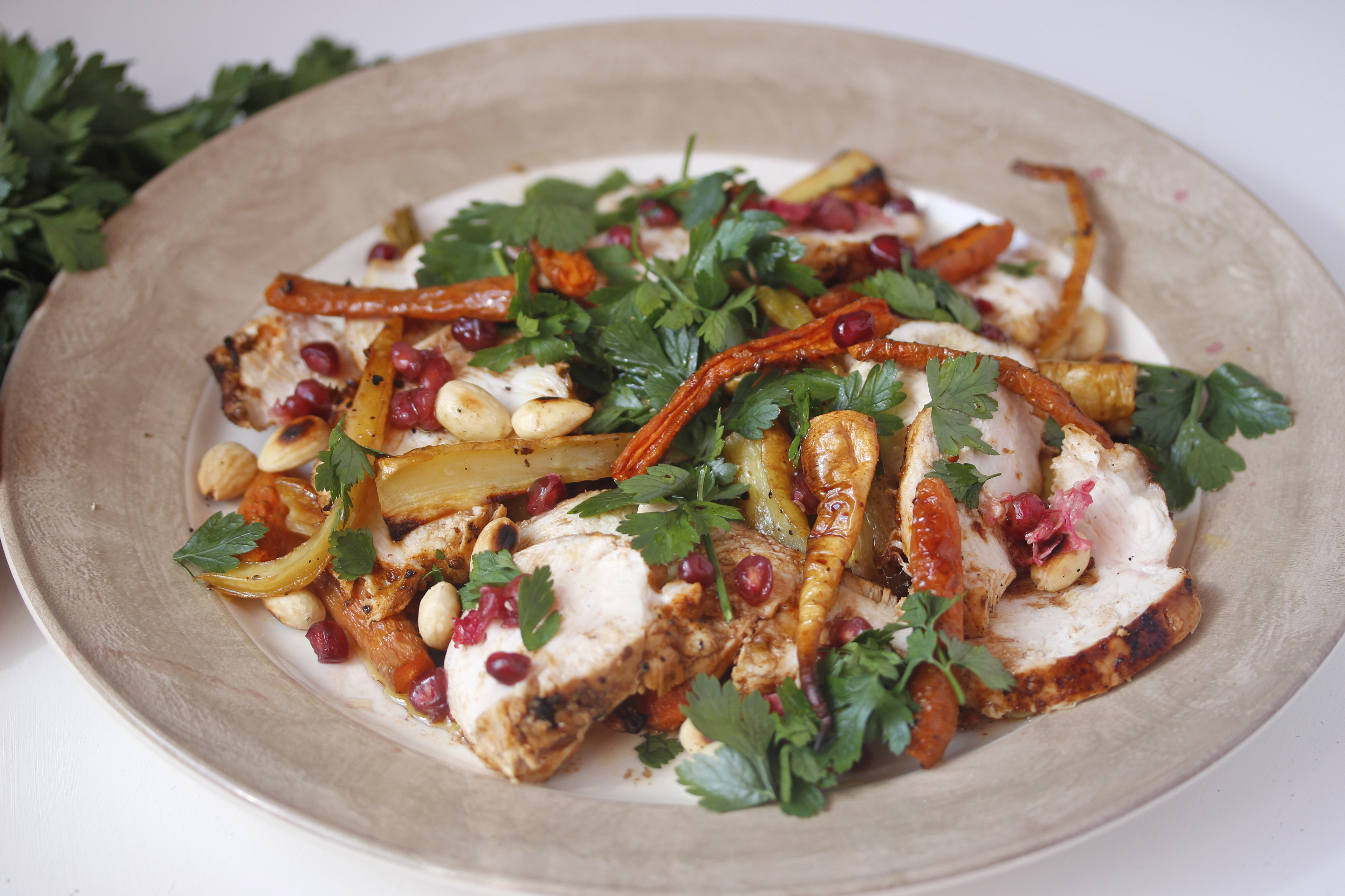 Salatið er sett saman úr þremur þáttum; í fyrsta lagi er það bakaða grænmetið, síðan kjúklingurinn og í þriðja lagi – ja, það mætti kannski kalla það ,,útákástið“ eða eitthvað slíkt, þ.e. möndlurnar, granateplafræin, steinseljan og salatsósan. En það er best að byrja á að setja kjúklinginn í maríneringu.