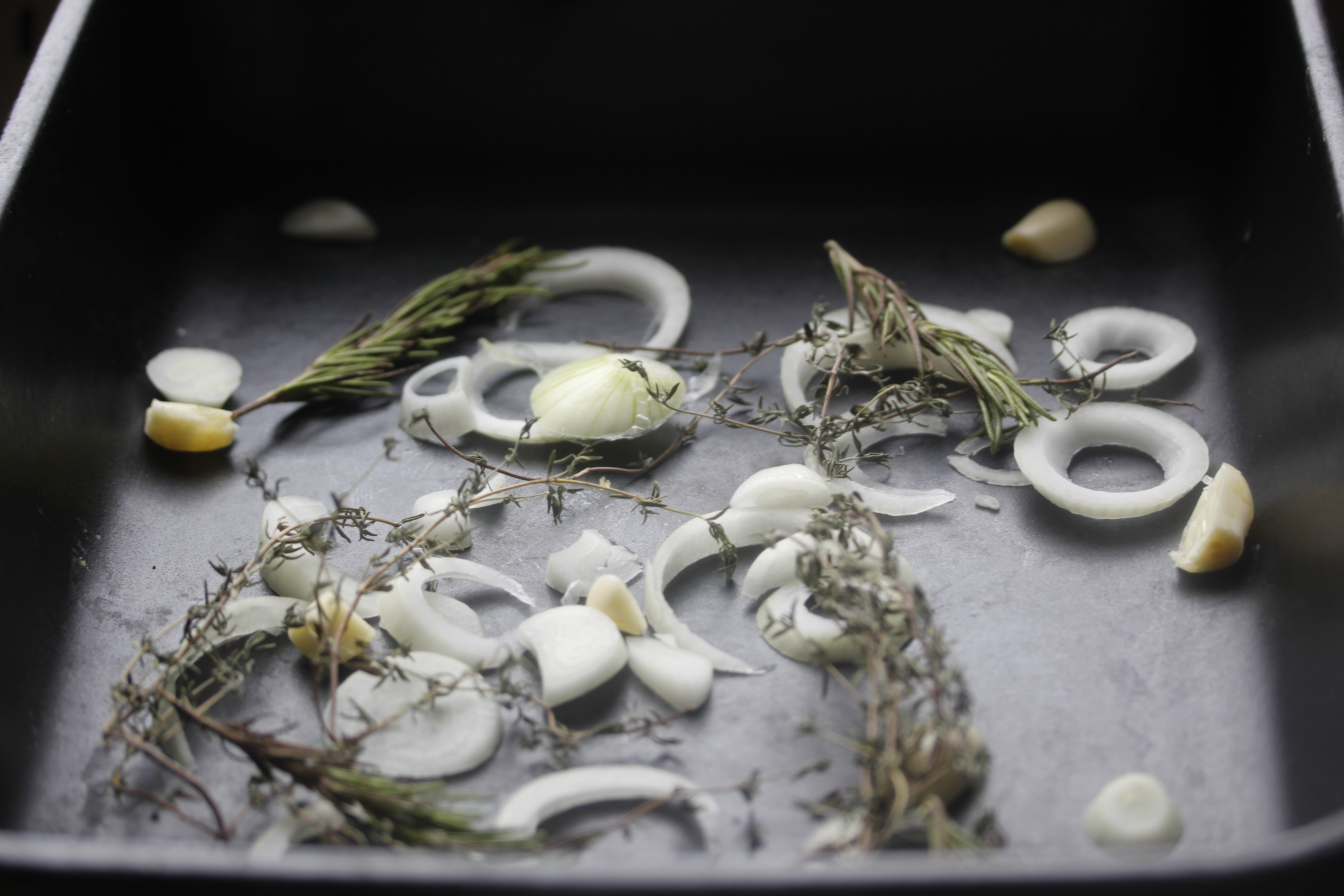 Svo tók ég eldfast mót, hæfilega stórt til að rúma bóginn, skar niður einn lauk og tvo hvítlauksgeira og setti í formið ásamt nokkrum rósmarín- og timjangreinum (það má líka nota þurrkaðar kryddjurtir). Dreifði þessu á botninn.
