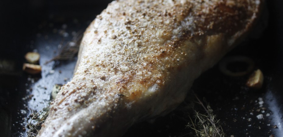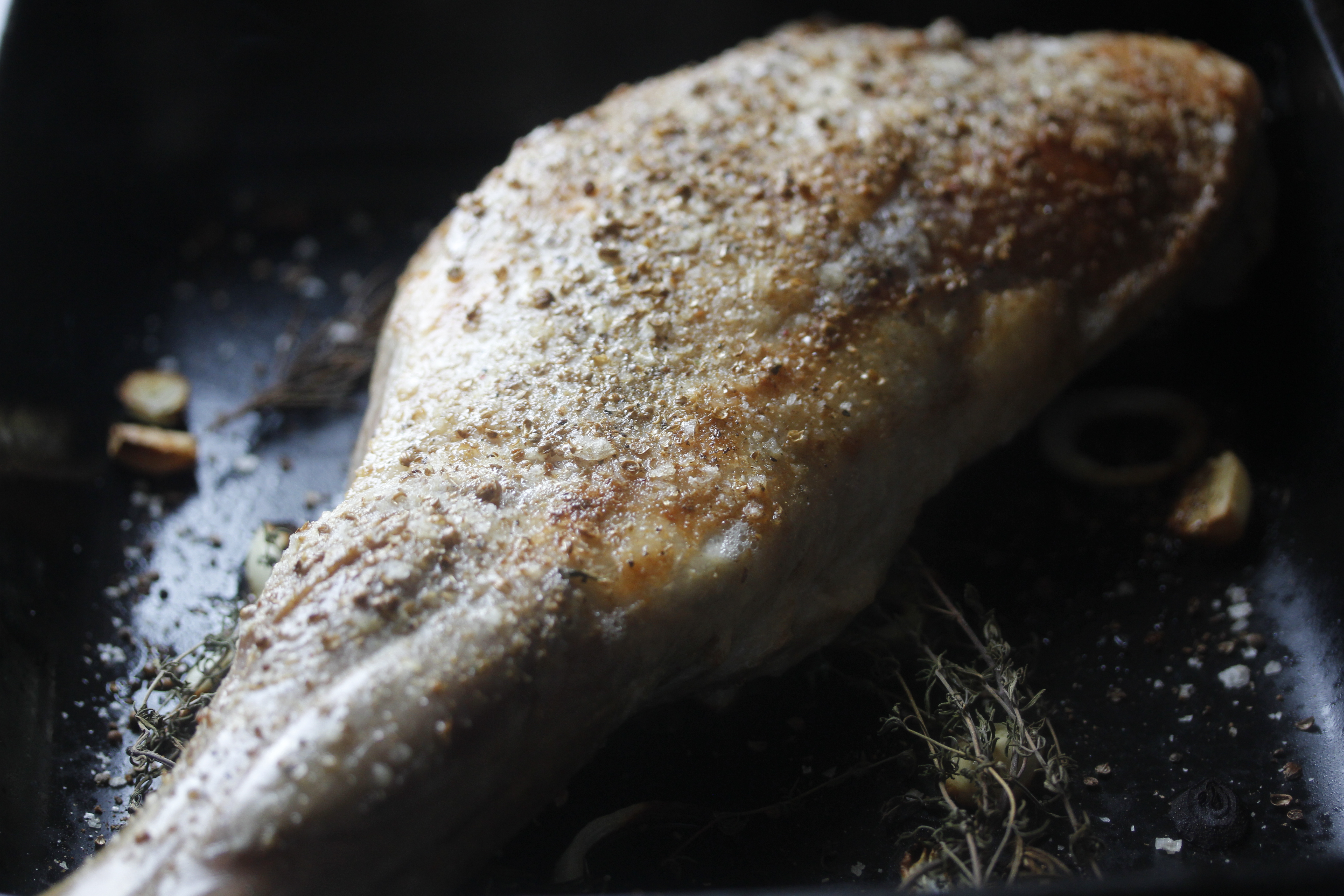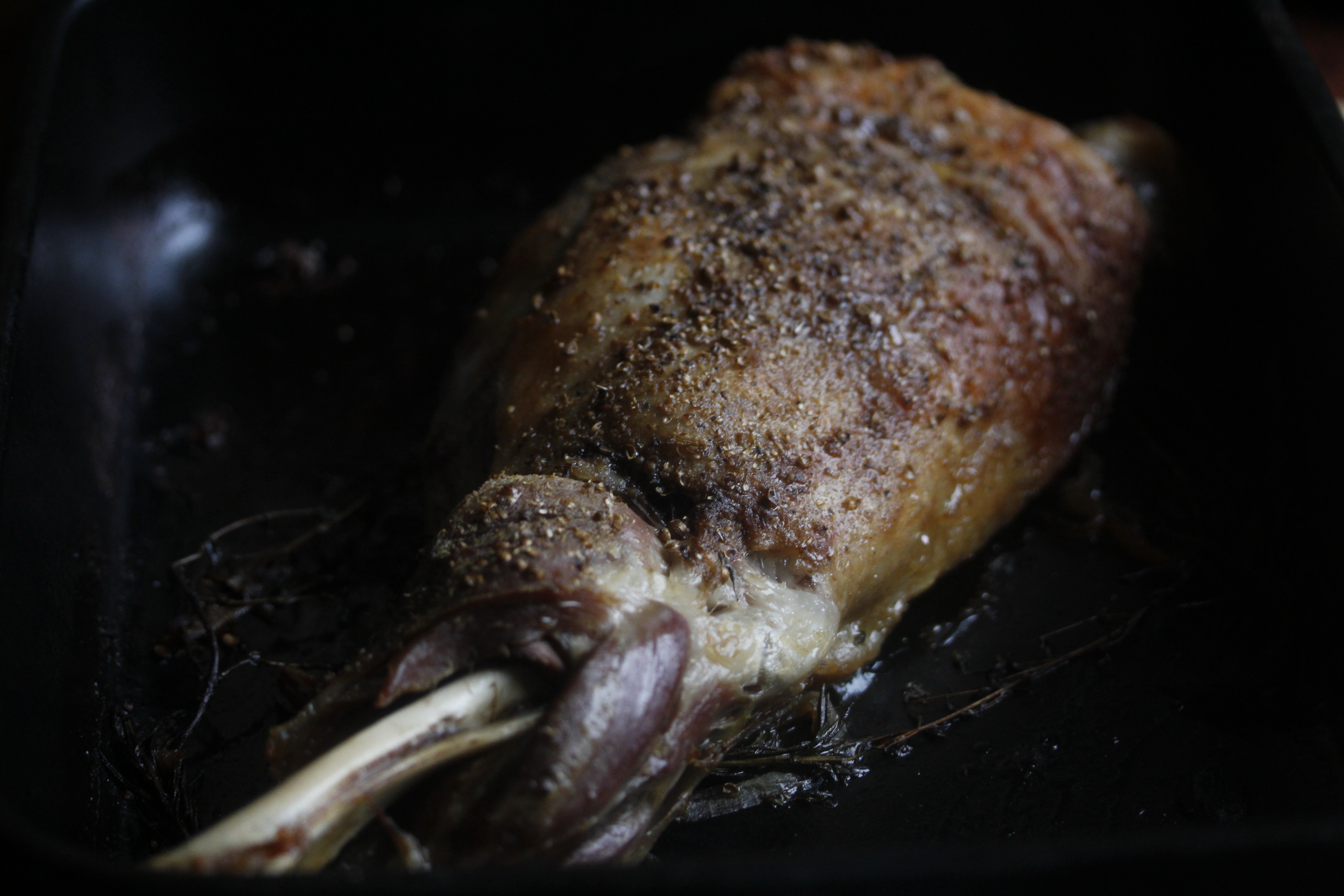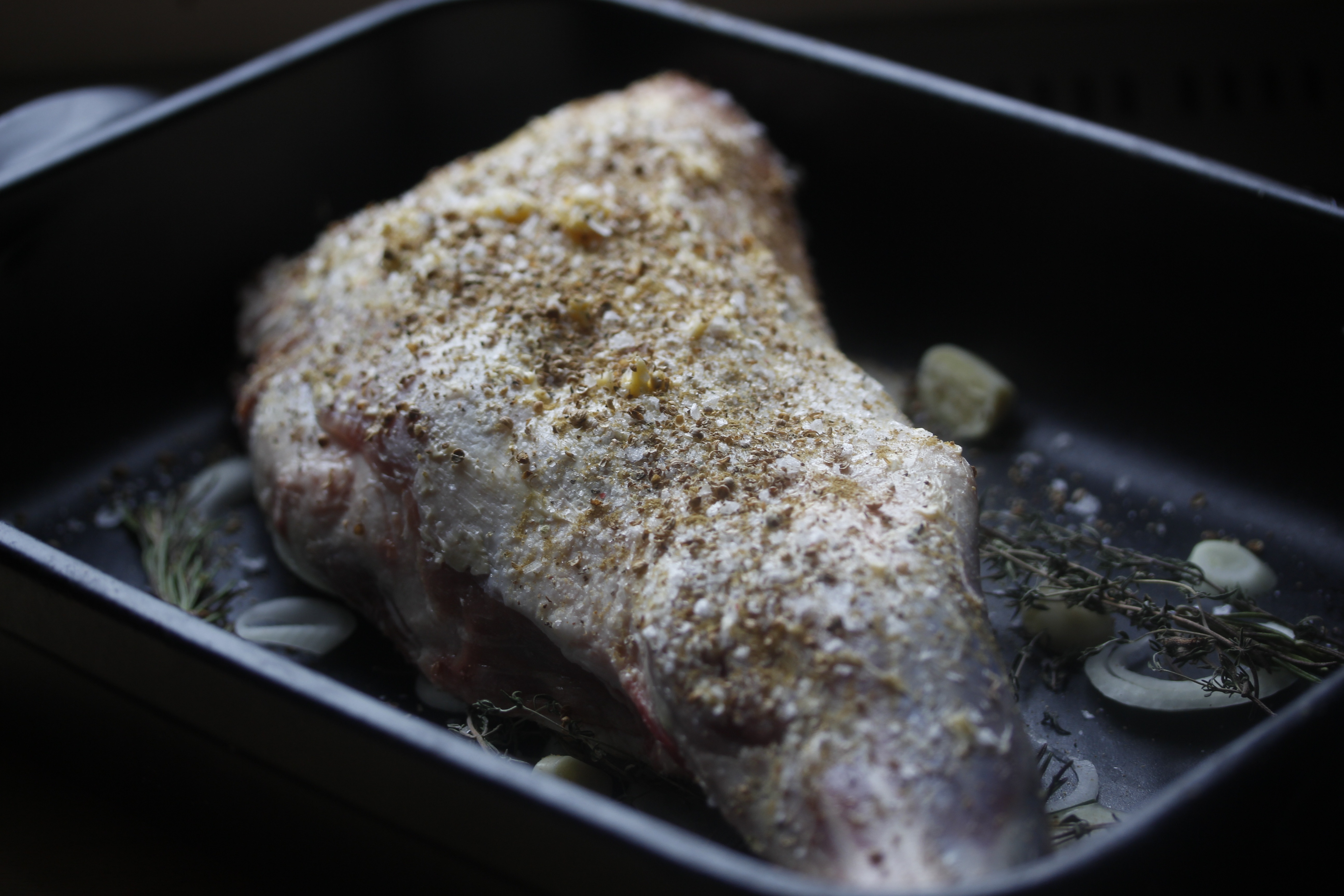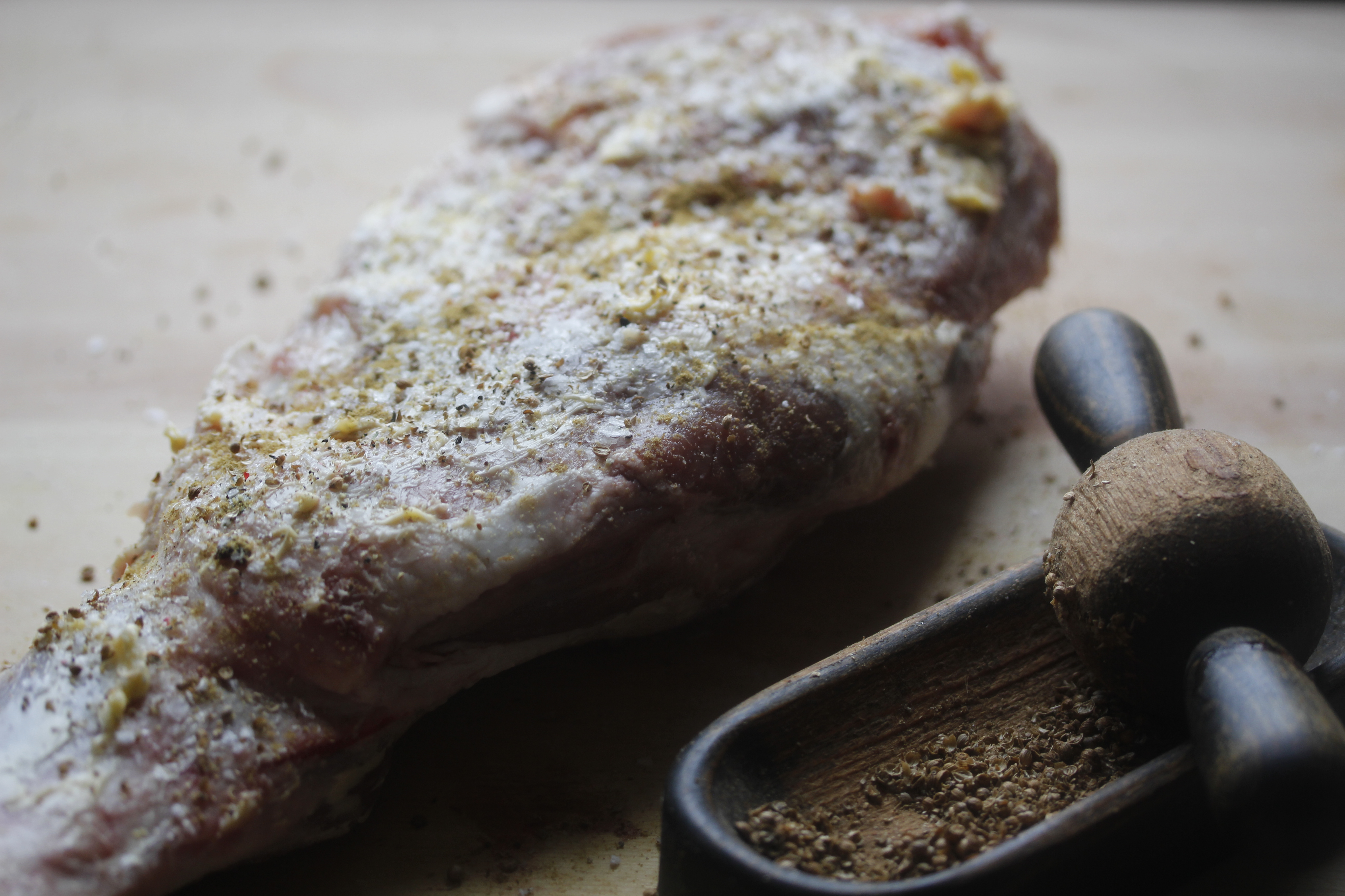 Það er auðvitað hægt að nota ýmiss konar krydd á lærið en ég notaði nýmalaðan pipar, salt, svona 1 msk af grófmöluðu kóríanderfræi og 1/2 tsk af kummini (má sleppa).