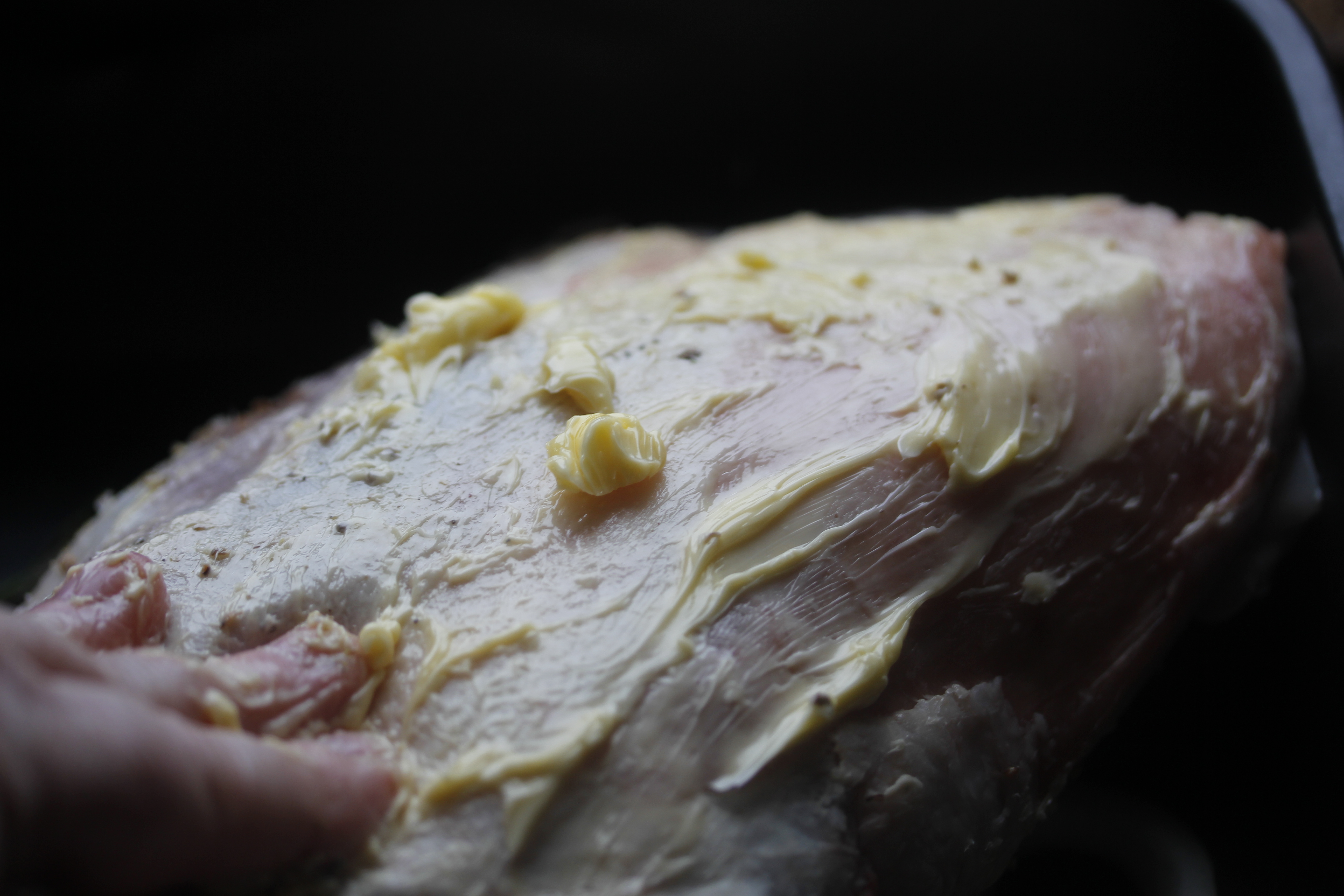 Svo tók ég svona 50-75 g (mældi það ekki) af linu smjöri og smurði því jafnt á allar hliðar bógsins með fingrunum. Eða með spaða eða hnífsblaði ef maður vill síður subba sig út.