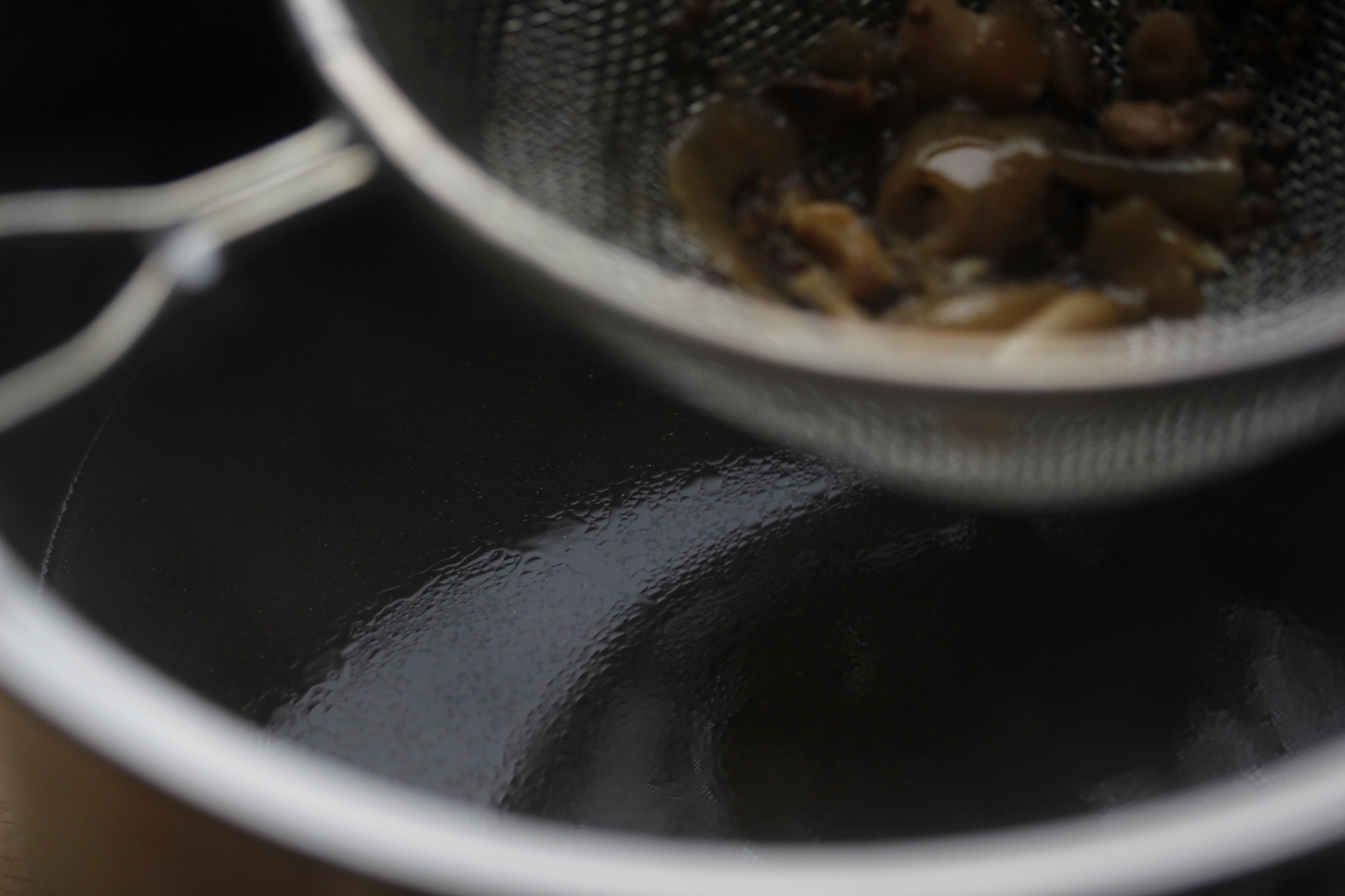 Þá tók ég það aftur út og fjarlægði álpappírinn, setti sigti yfir pott og hellti öllu soðinu úr fatinu í það. Slökkti á ofninum en setti fatið aftur í hann (án álpappírs) og lét það vera þar á meðan ég þykkti sósuna með hveitihristingi (má líka nota sósujafnara), bætti við dálitlum rjóma og lét hana malla í svona 10 mínútur. Þá tók ég kjötið úr ofninum og hellti dálitlu soði sem hafði bæst við í steikarfatið út í sósuna. Smakkaði til að athuga hvort þyrfti eitthvað að krydda en sósan var bragðmikil og góð svo ég lét duga að bæta nokkrum dropum af sósulit út í.