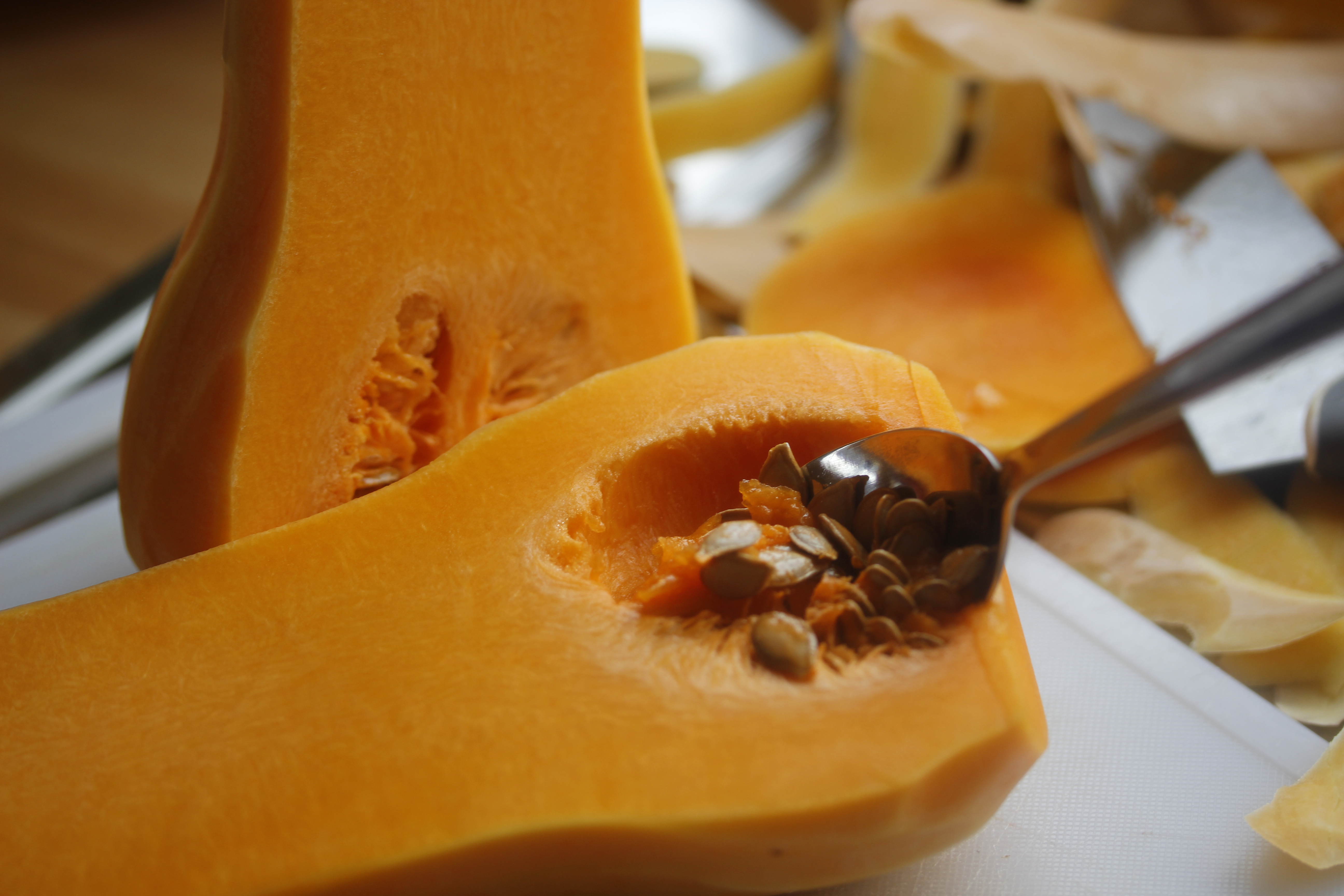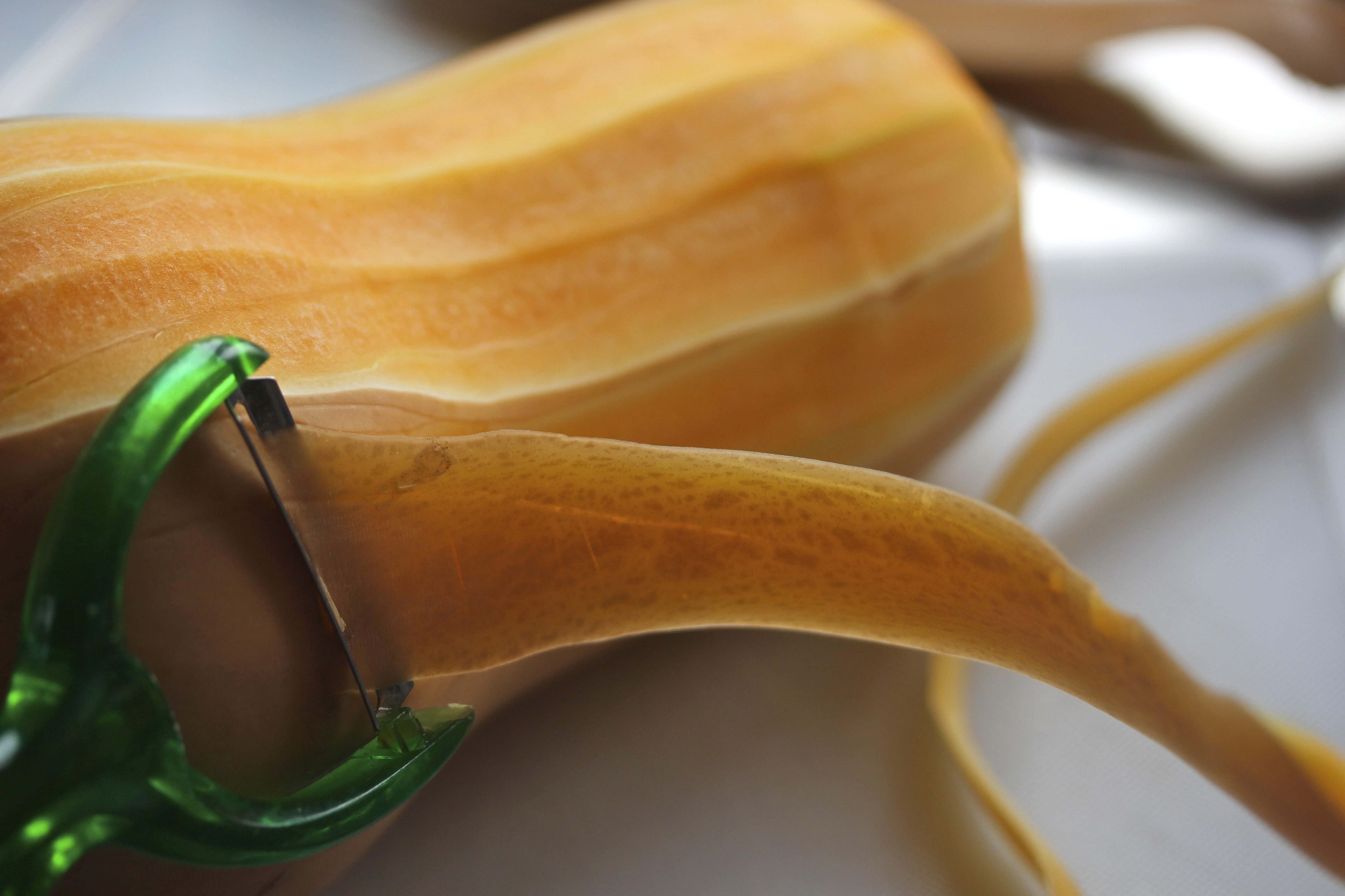 Ég sagði áðan að það væri ágætt að vera ekki með öll mín venjulegu eldhústól og dippidútta í kringum mig en það eru undantekningar og fyrst ég tók butternutkúrbítinn (sem var frekar stór) með tók ég flysjunarjárnið líka; það auðveldar flysjunina heil ósköp.