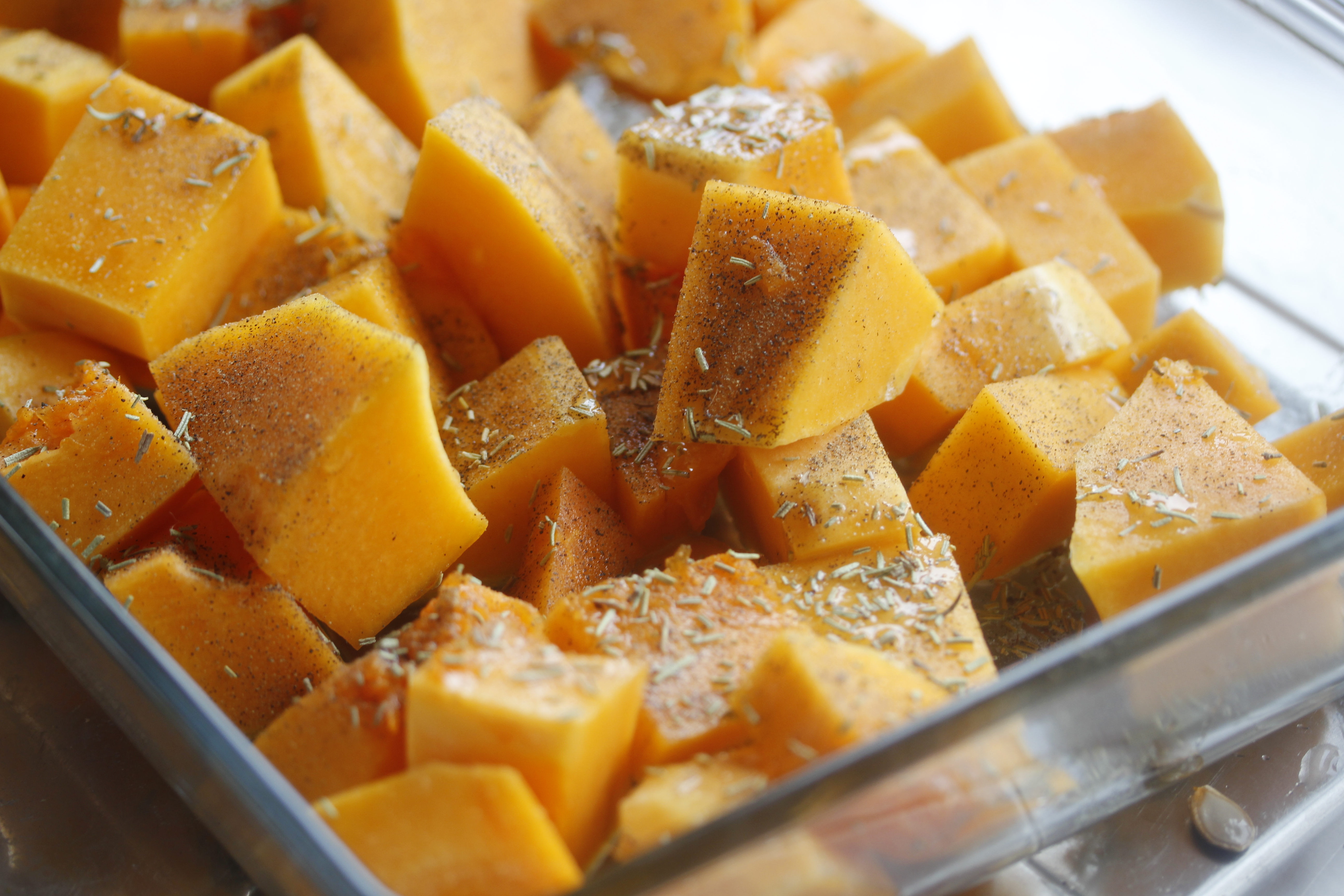 Svo skar ég butternnutkúrbítinn í frekar litla bita, 2-3 cm á kant eða svo, setti í eldfast mót ásamt 2 msk af olíu, 2 tsk af þurrkuðu timjani, pipar og salti. Blandaði vel, setti í ofninn og bakaði í svona 25-30 mínútur, eða þar til teningarnir voru meyrir og aðeins farnir að taka lit á brúnunum.