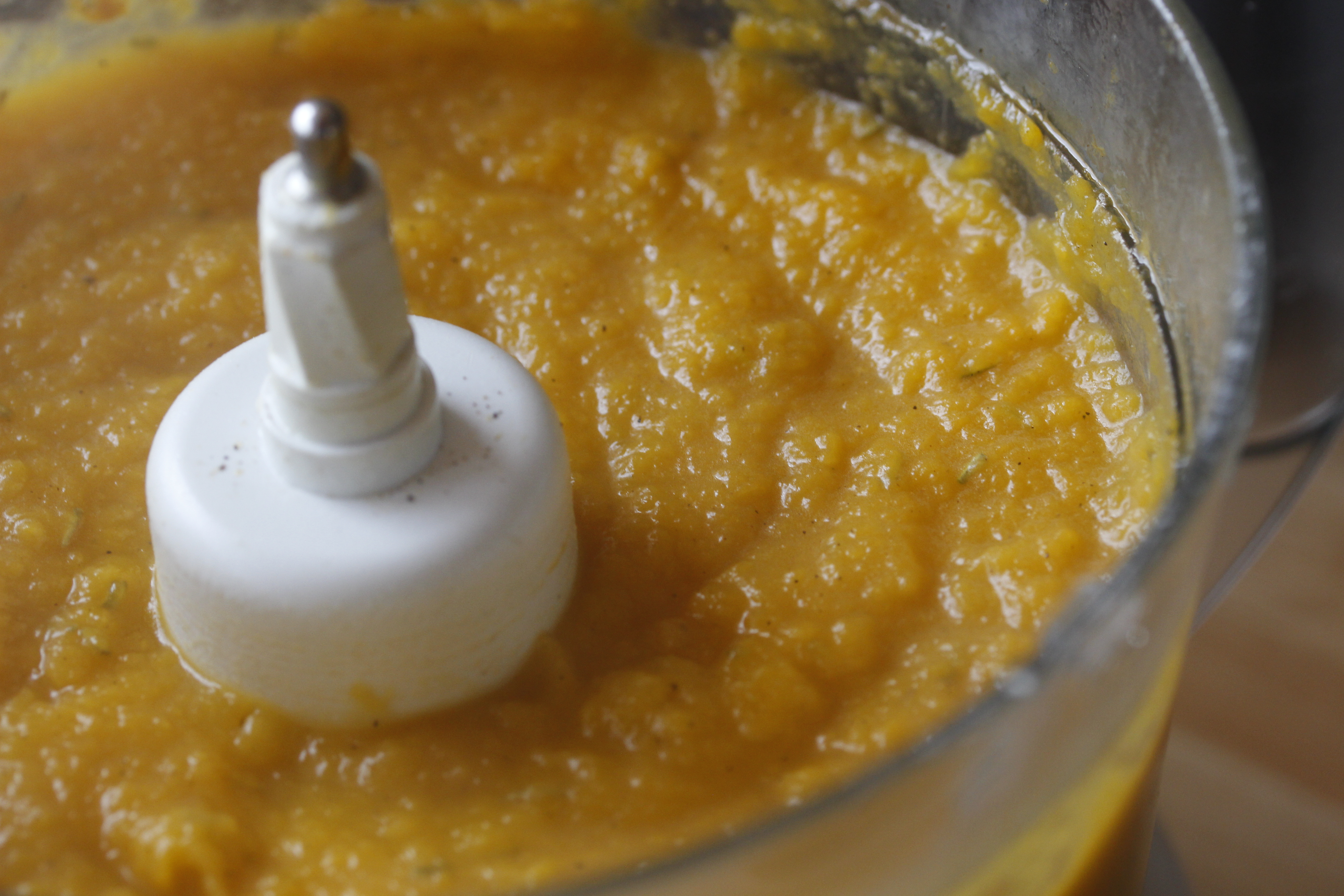 Þegar butternutkúrbíturinn var orðinn meyr tók ég fatið út og mokaði öllu úr því (olíunni líka, en það má sleppa henni) í matvinnsluvélina. Það er sko matvinnsluvél í þessum bústað (gömul og maður þarf að stinga borðhníf í hana svo að hún virki) en það mætti nota blandara eða kartöflustappara.