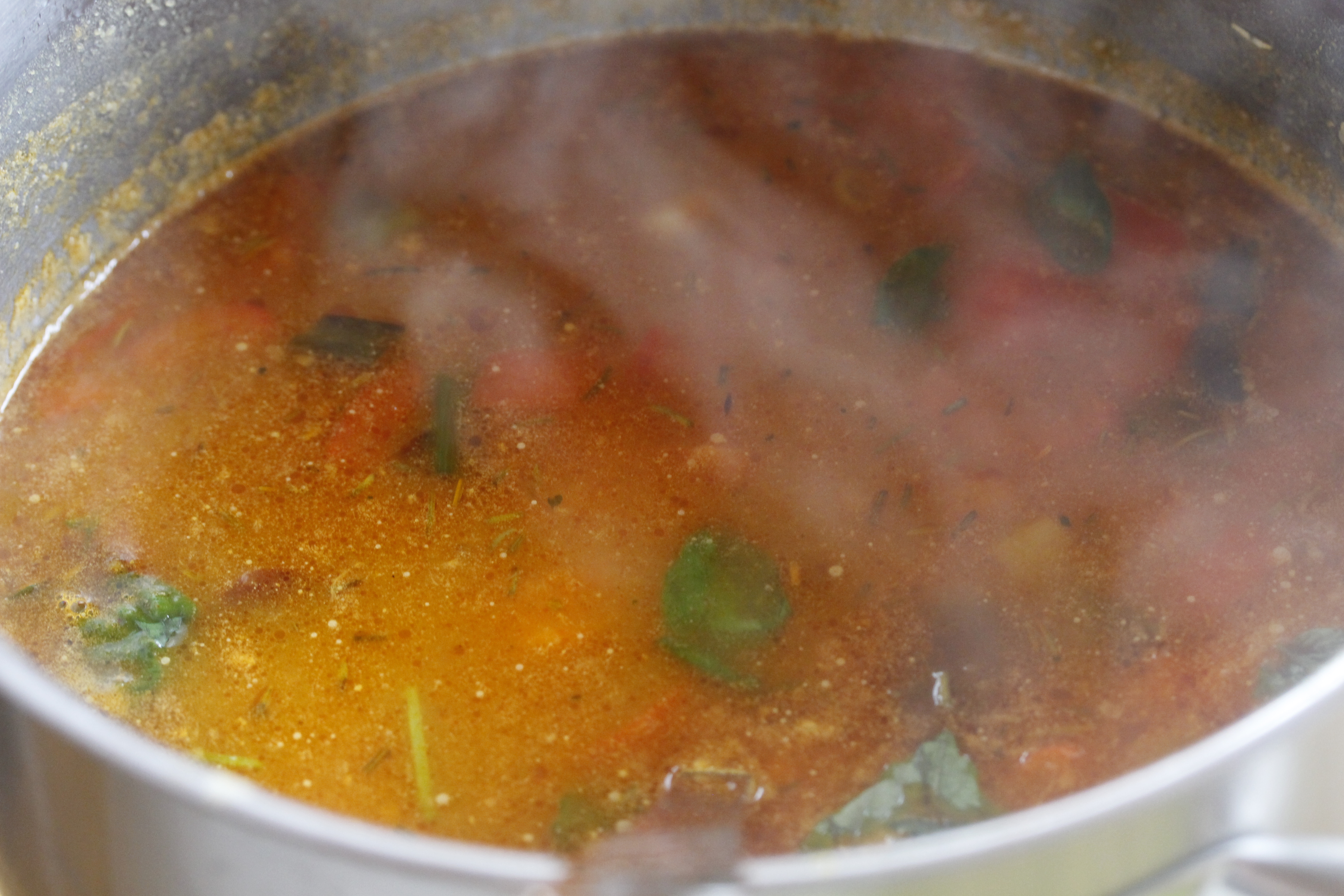 Ég hefði kannski viljað aðeins þykkari súpu, nota bara einn lítra, en við vorum átta. Ég ætlaði að nota grænmetis- eða kjúklingatening en það voru bara til lambakjötsteningar (þetta er nú í Skagafirði) svo ég notaði tvo slíka; það kom ágætlega út.