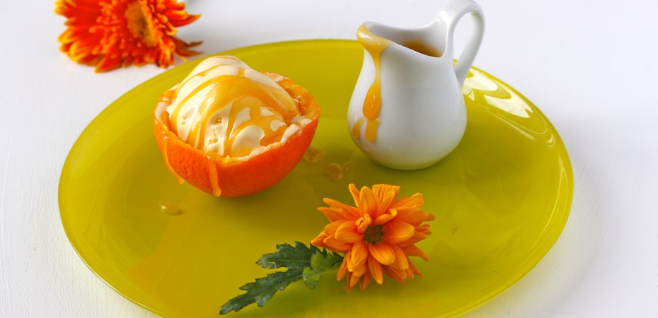 Ég bar sósuna fram með mandarínuís en hún á líka mjög vel við með t.d. vanilluís. En ef maður notar mandarínu- eða appelsínuís og hefur svo appelsínukaramellusósuna með er skemmtilegt að nota appelsínuhelminga fyrir ísskálar.