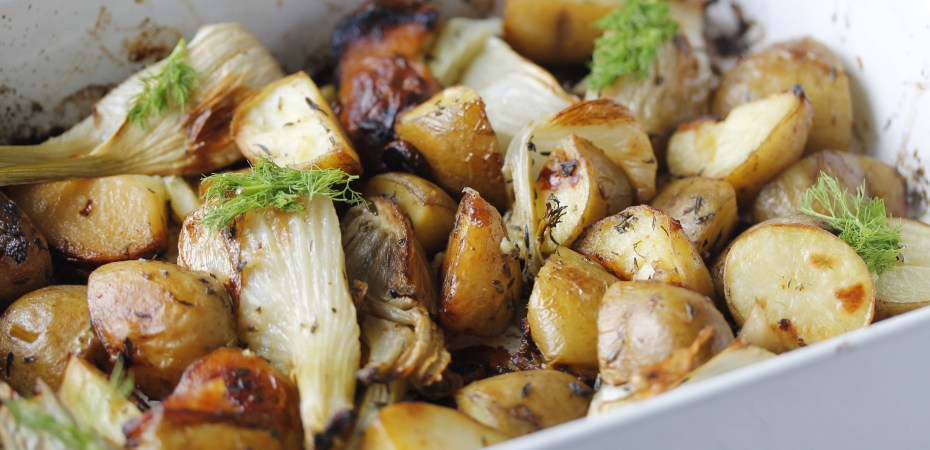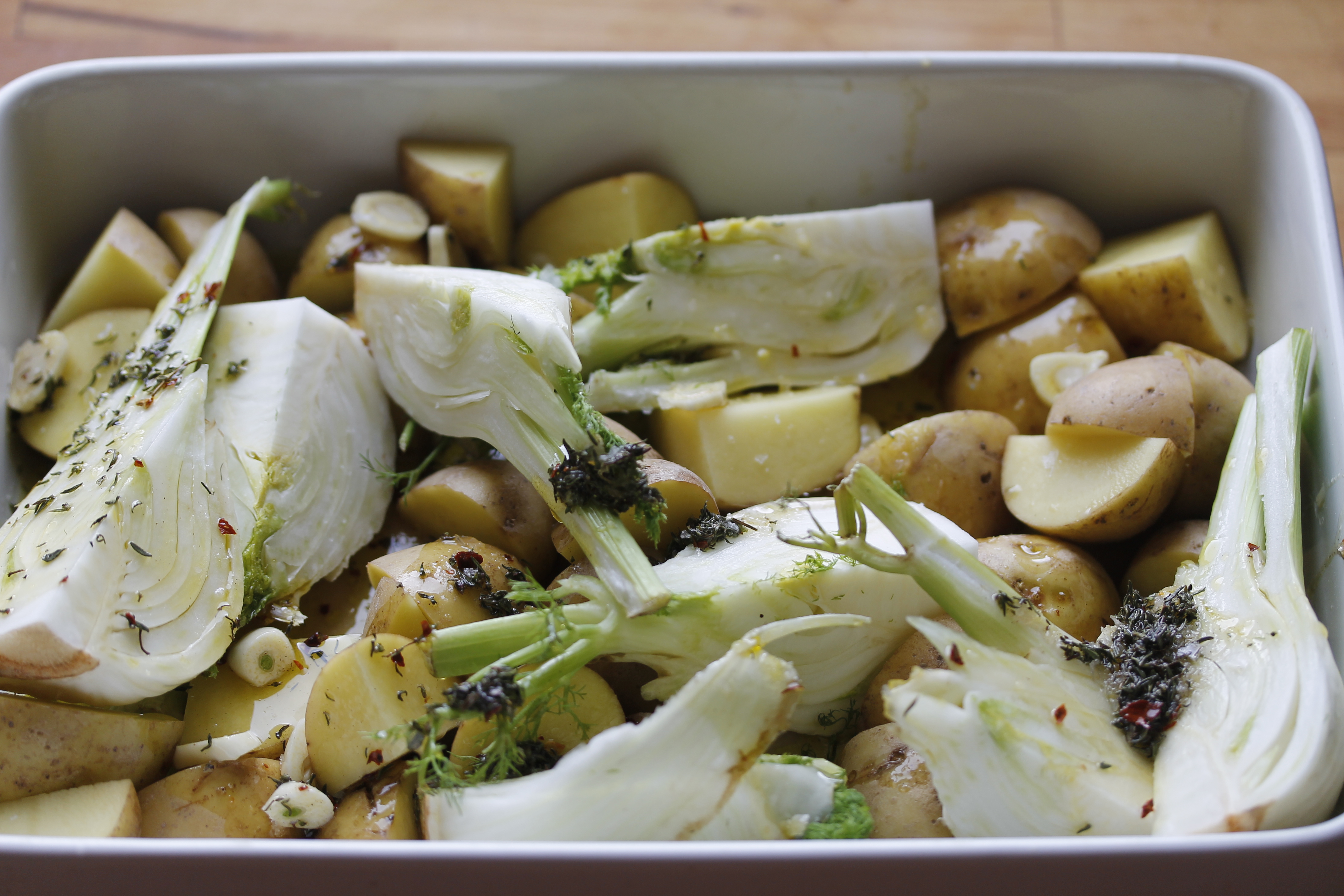 Ég setti kartöflur og fennikur í fremur stórt, eldfast mót. Blandaði saman í skál 4 msk af ólífuolíu, 4 smátt söxuðum hvítlauksgeirum, 1 msk af þurrkuðu óreganói, 1 tsk af kummini, 1 tsk af salti, nýmöluðum pipar og smáklípu af chiliflögum. Hellti þessu yfir kartöflurnar og fennikurnar og blandaði vel.