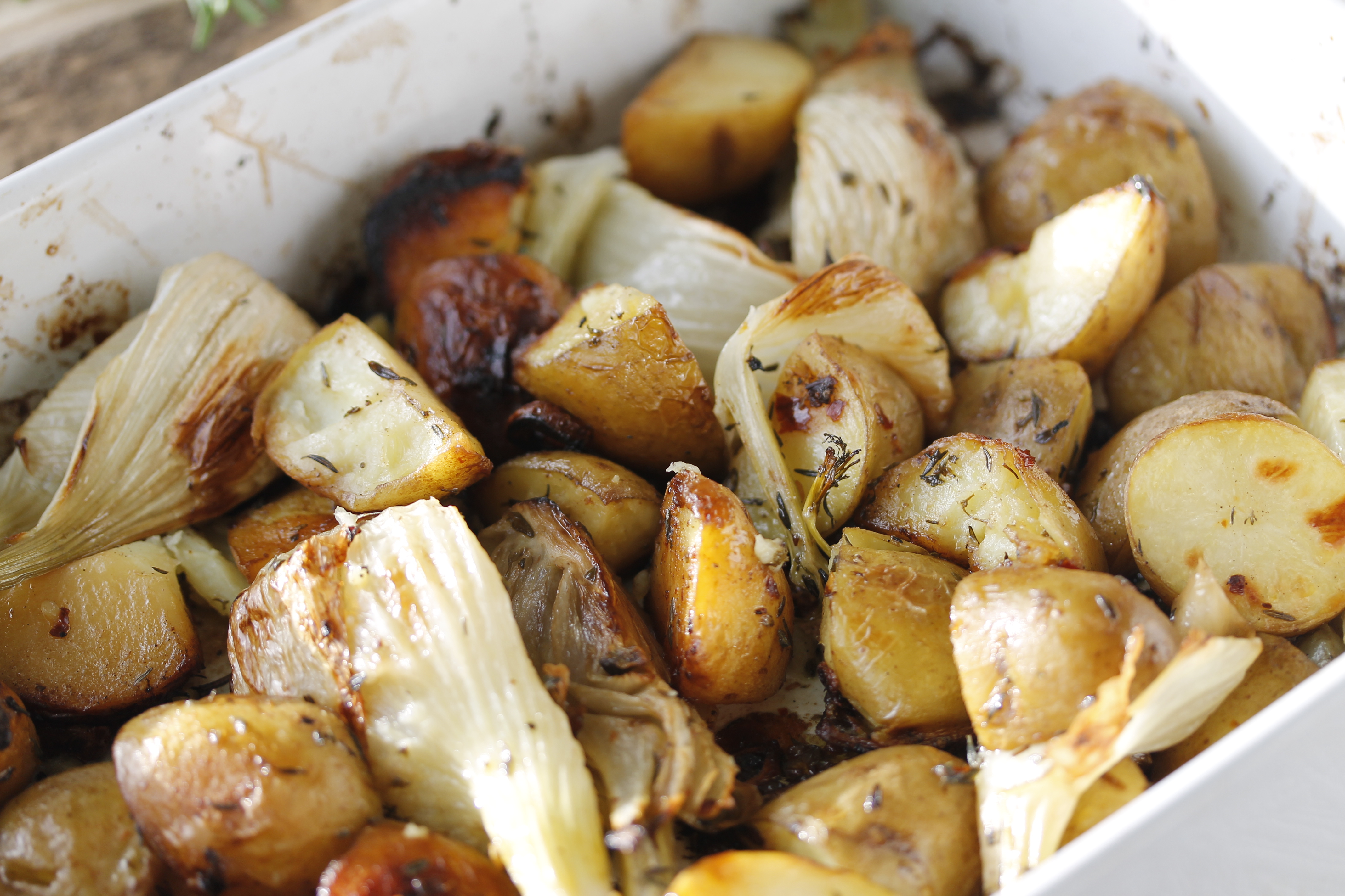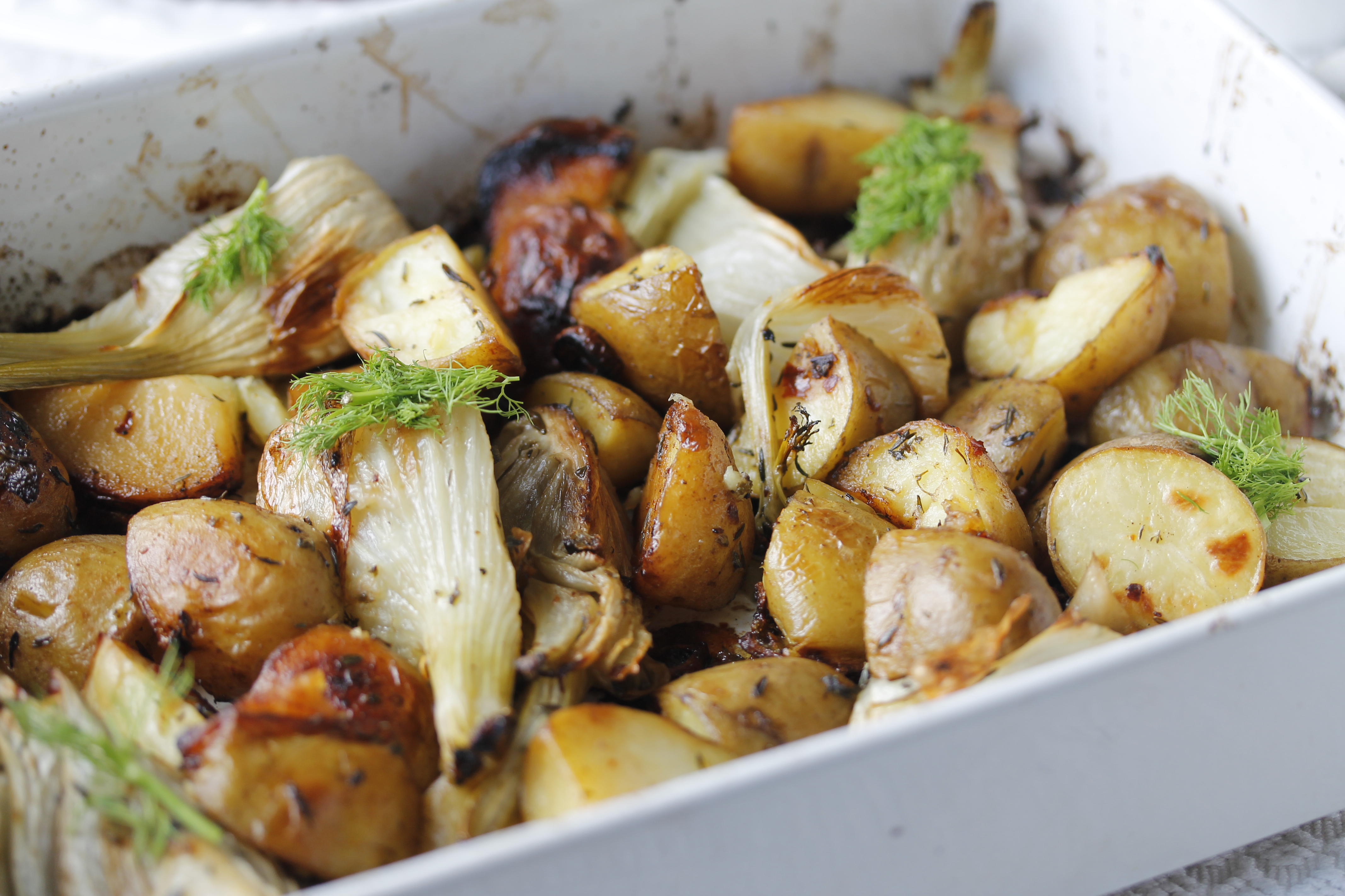 Hér kemur grískættuð uppskrift sem ég var með í páskablaði MAN, þar sem þemað var Grikkland. Ofnsteiktar kartöflur, bragðbættar með hvítlauk, óreganói og sítrónu, eru mjög vinsælar í Grikklandi og frábært meðlæti til dæmis með lambakjöti og öðrum steikum. Ég bætti líka fenniku við en það má svosem sleppa henni.