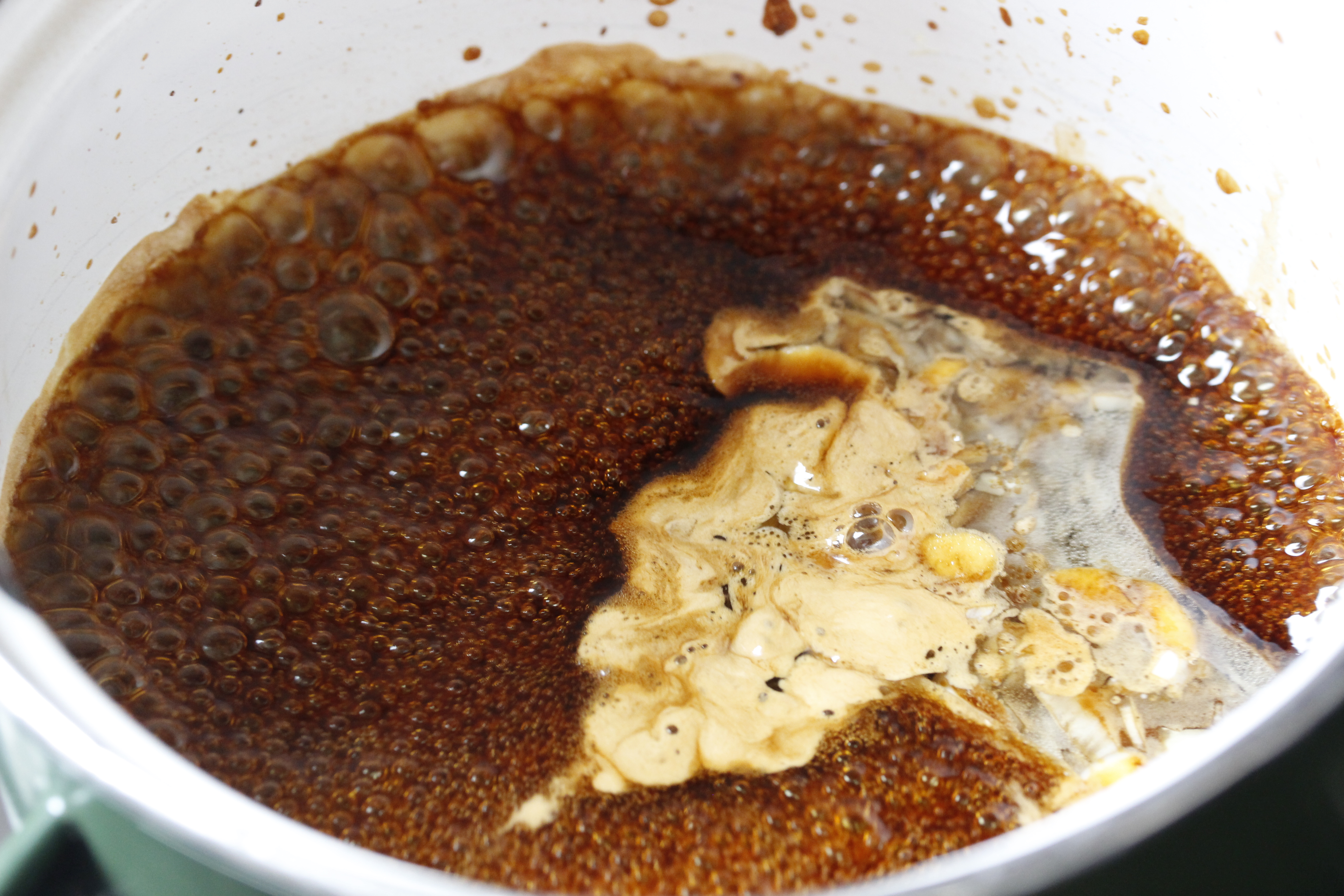 Ég byrjaði á sósunni: Setti 3 msk af mirini, 3 msk af púðursykri, 2 msk af hunangi, 1 msk af smátt saxaðri engiferrót, 125 ml af sojasósu, 2 smátt saxaða hvítlauksgeira og 1 tsk af sesamolíu í pott og hitaði rólega að suðu.