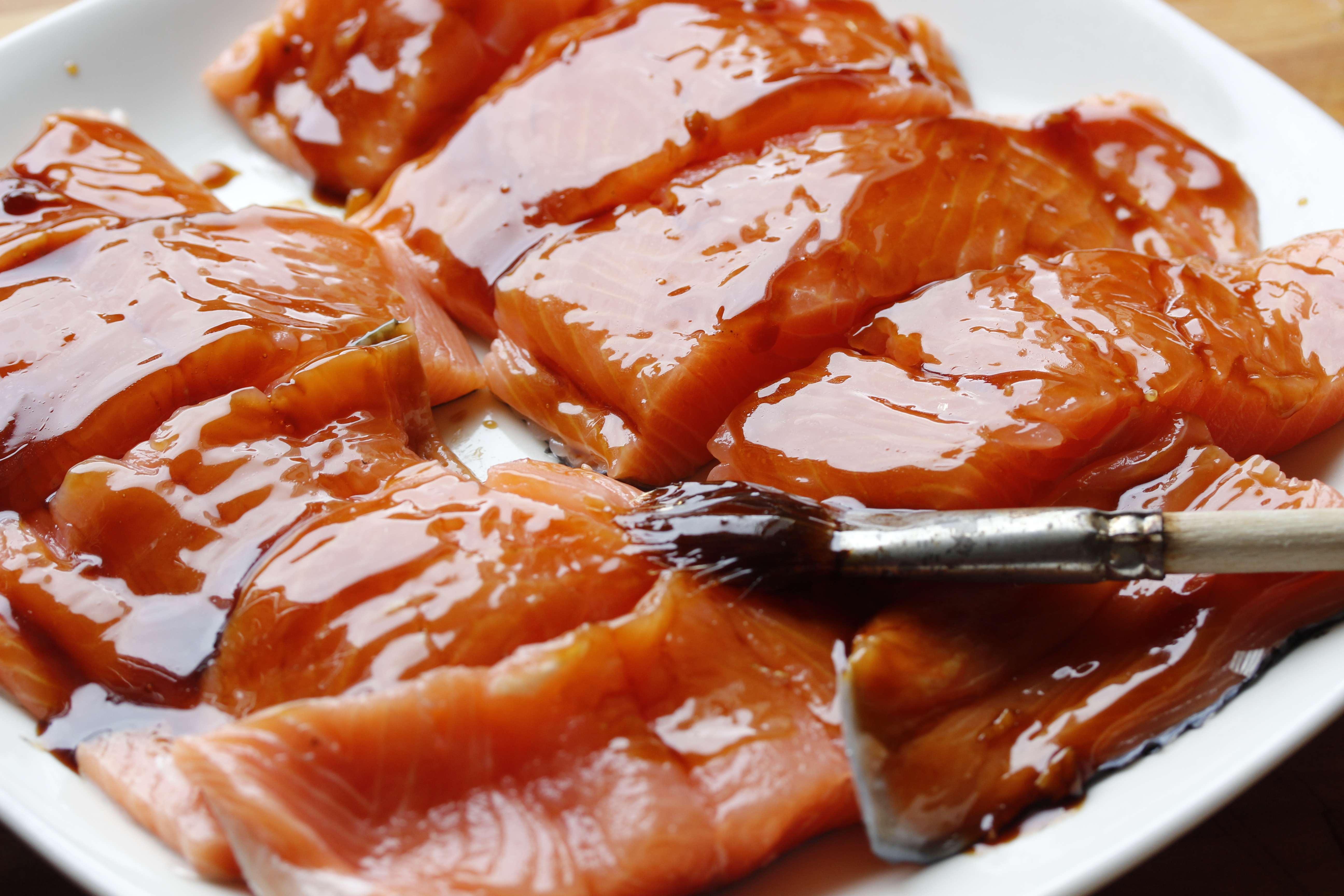 Svo tók ég laxaflak, 700-800 g, og skar það í um 5 cm breið stykki og raðaði þeim á disk með roðhliðina niður. Svo penslaði ég stykkin vel með sósunni og lét standa í um 10 mínútur.