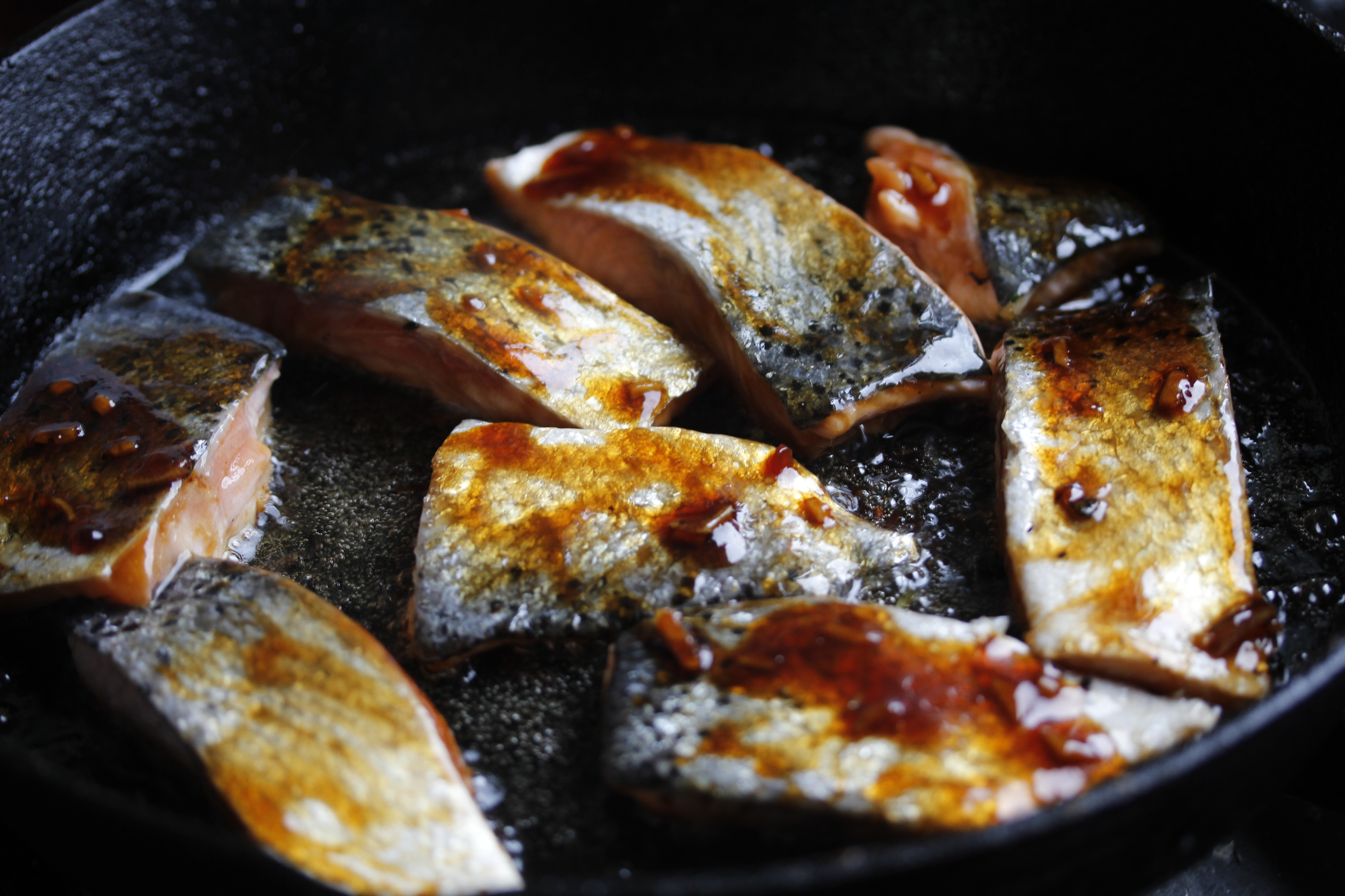 Ég hitaði svo 2–3 msk af olíu á pönnu, setti laxinn á hana með roðhliðina upp, penslaði roðhliðina með teriyakisósunni og steikti laxinn við meðalhita í 2–3 mínútur á hvorri hlið, eftir þykkt. Hann á að taka góðan lit en það þarf að passa að hann brenni ekki of mikið. Svo tók ég hann af pönnunni, setti á disk og hélt heitum.