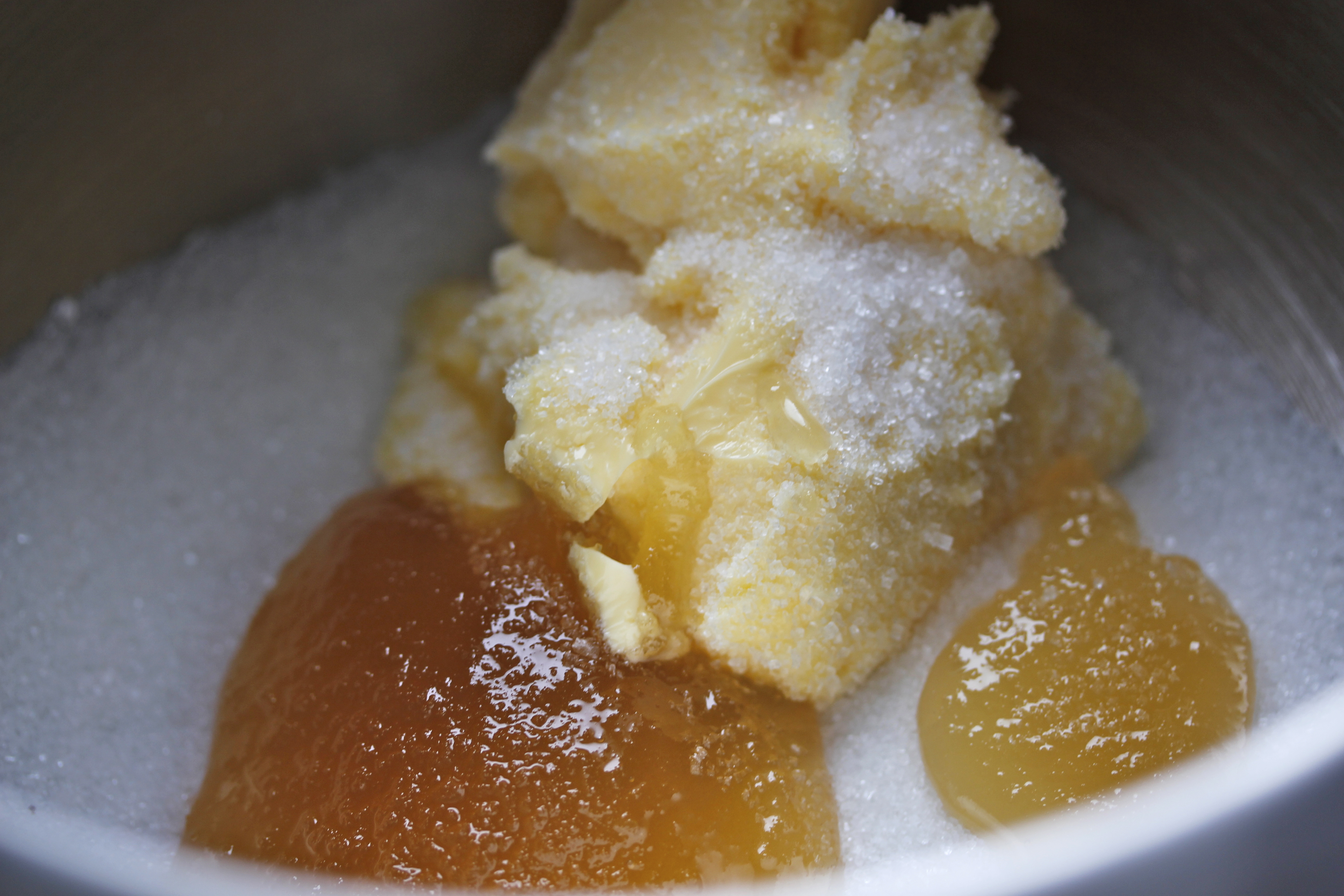 En allavega, ég náði í Bosch-hrærivélina mína (sem er ótrúlega létt, það er nú stór kostur þegar maður þarf að flytja hana fram og aftur eftir eldhúsbekknum. Ég gæti reyndar alveg notað hana þar sem hún er en ekki ef ég ætla að taka myndir, það hentar illa). Setti í skálina 100 g af sykri, 125 g af linu smjöri og 100 ml af hunangi.