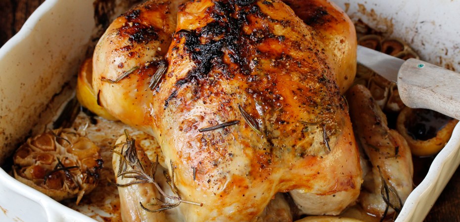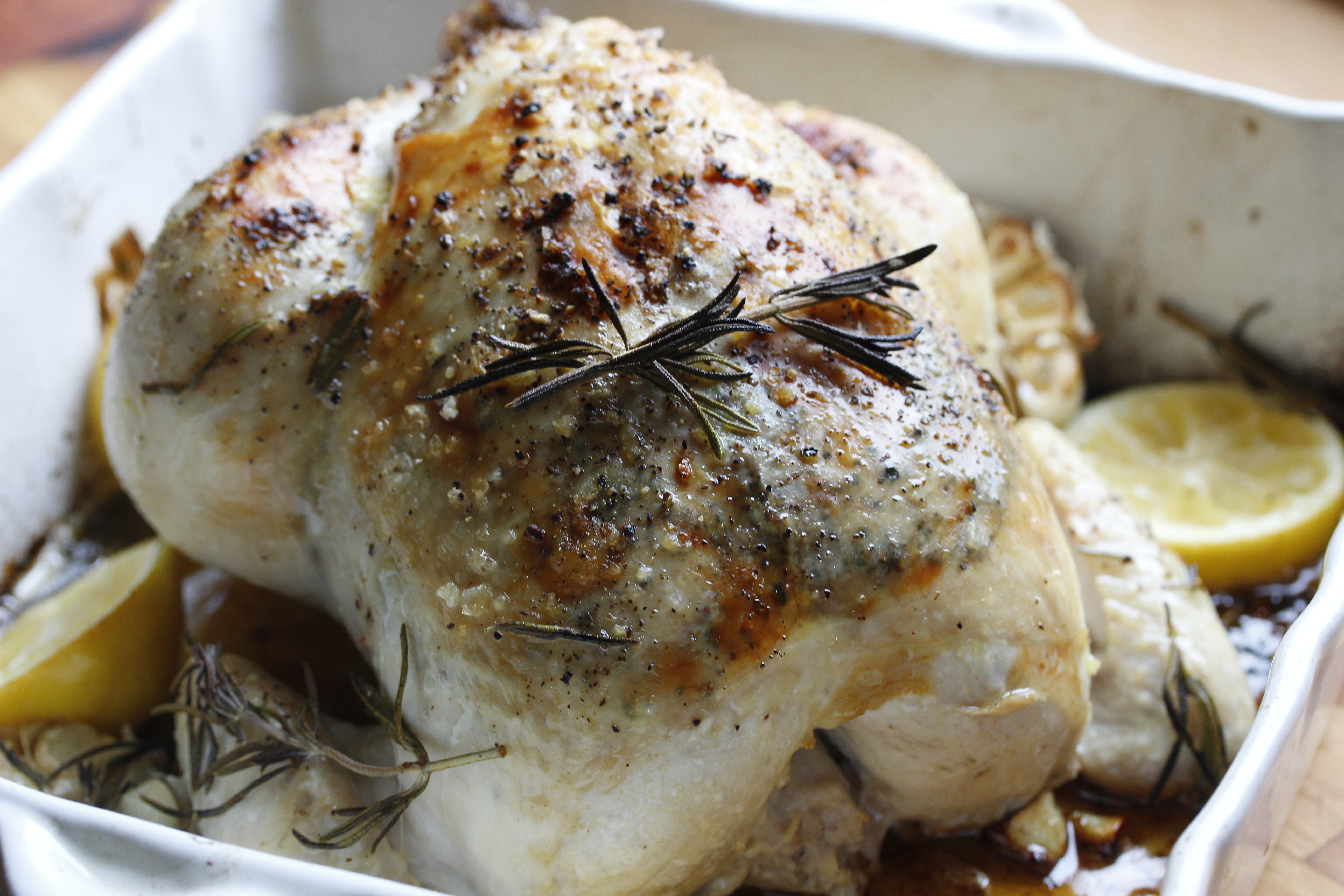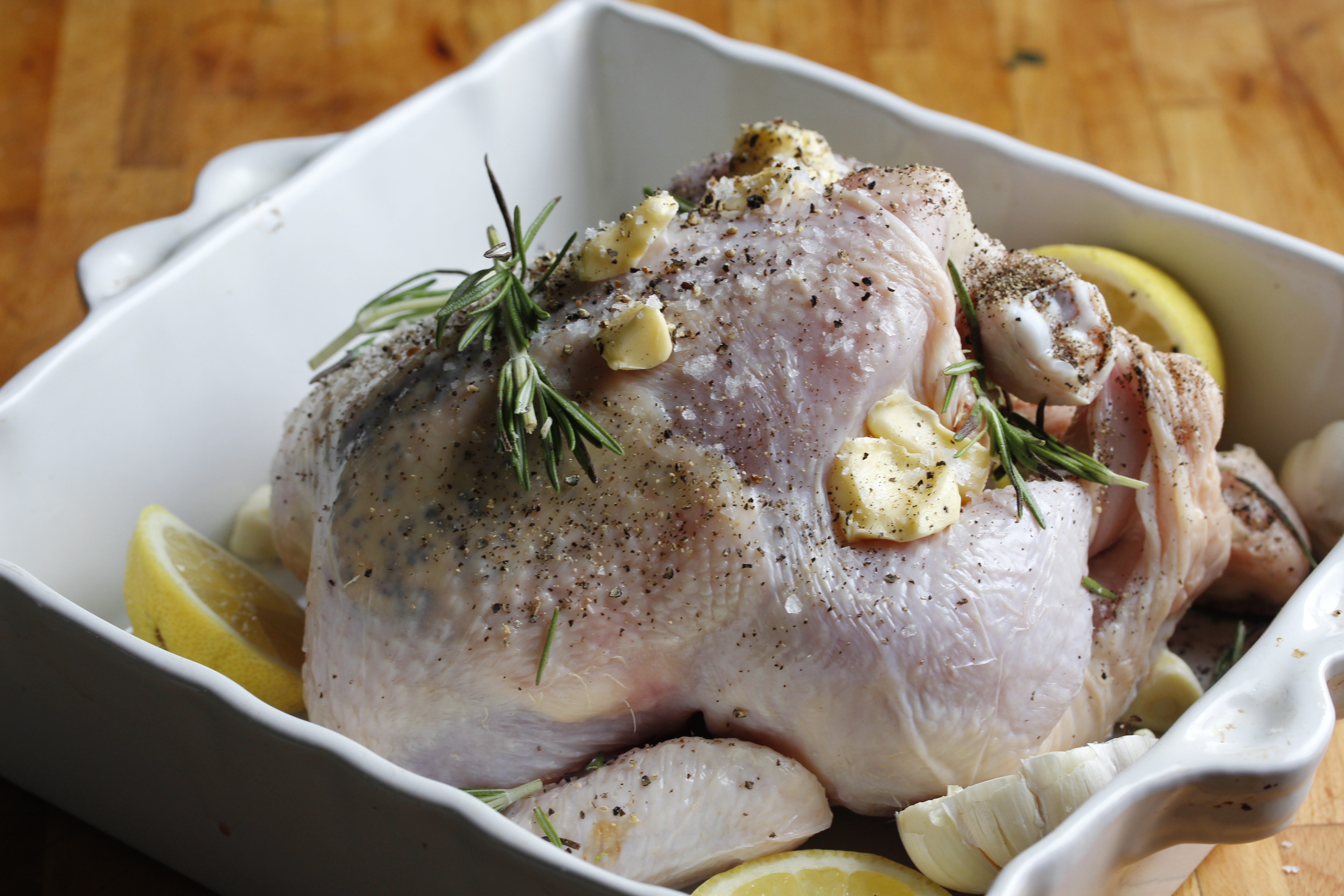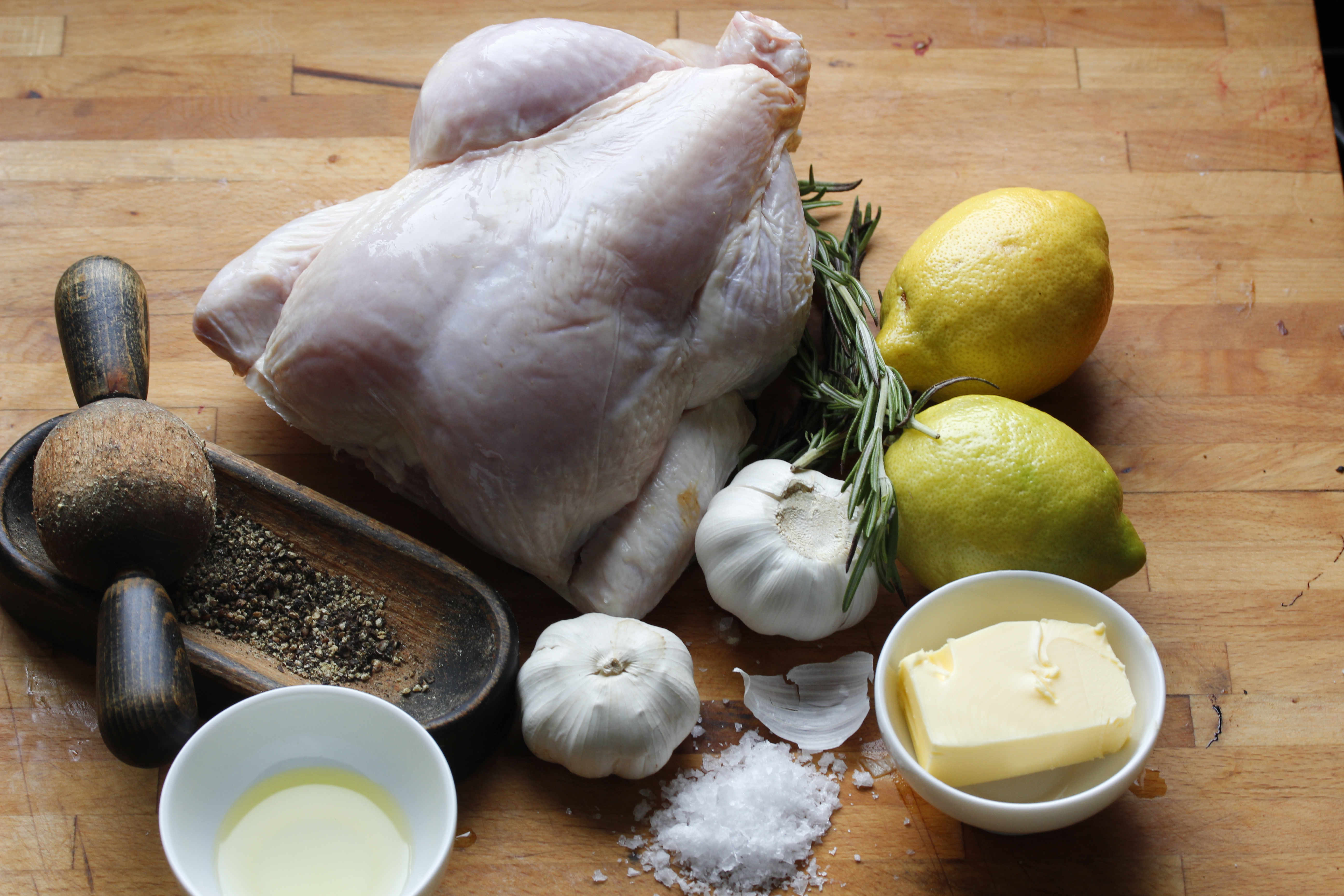 Allavega, ég var með kjúkling, svona 1,6 kíló, nýmalaðan pipar, salt, 40 g af smjöri – hvorki hörðu né linu, heldur dálítið mjúku – 2 sítrónur, 3-4 rósmaríngreinar (en það má nota aðrar kryddjurtir, ferskar eða þurrkaðar), 2 heila hvítlauka og svolitla ólífuolíu.