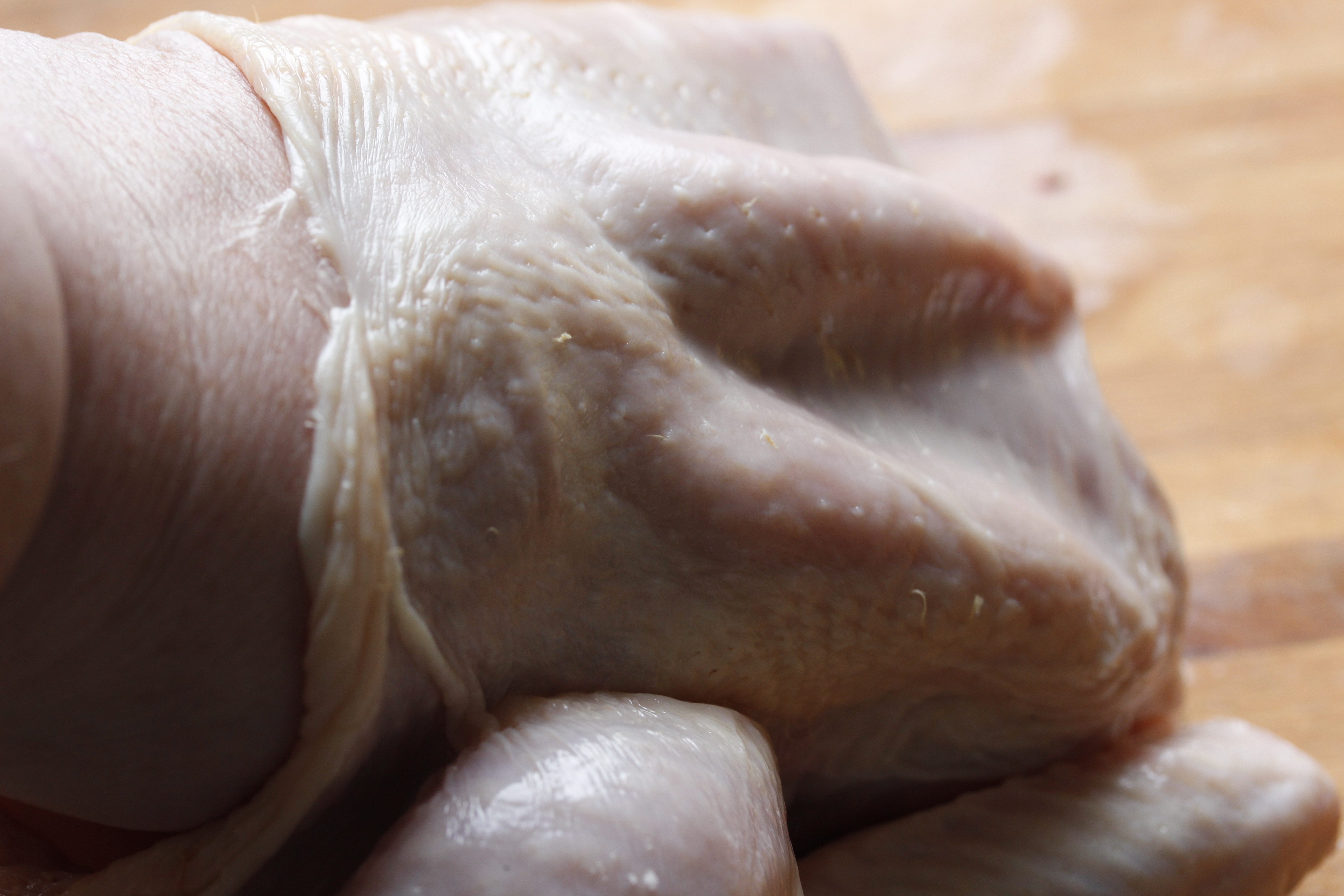 Ég byrjaði á að kveikja á ofninum og stilla hann á 215°C. Svo losaði ég um um haminn á bringu kjúklingsins með því að stinga fingrunum og síðan allri hendinni inn undir hann. Þetta útglennta þarna undir hamnum eru alltsvo puttarnir á mér.