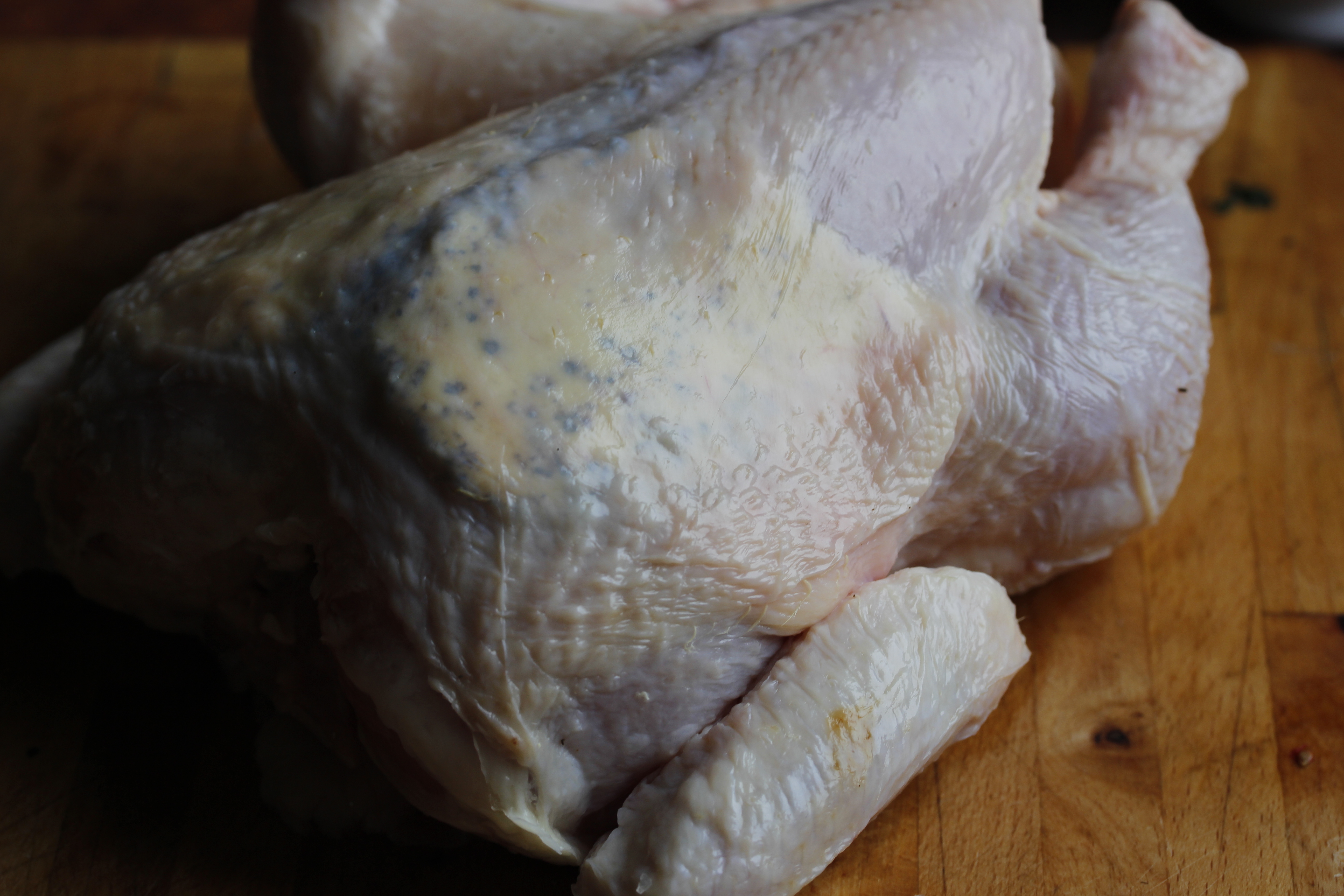 Ég kryddaði undir haminn með pipar og salti og setti svo u.þ.b. helminginn af smjörinu á bringuna undir haminn. Svo nuddaði ég haminn (utan frá) til að dreifa sem mest úr smjörinu.