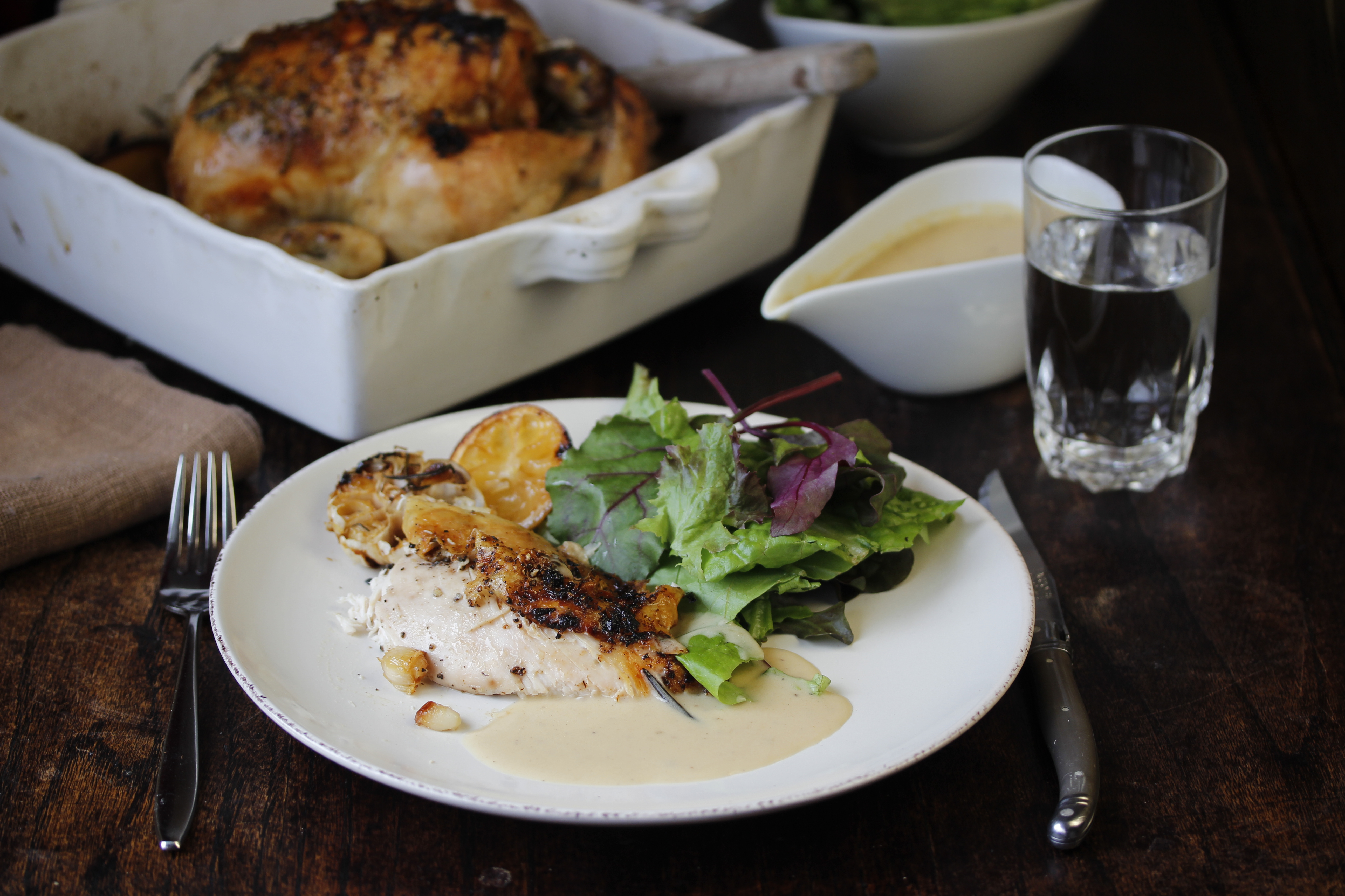 Þá tók ég fuglinn út og jós soði úr fatinu yfir hann. Ég skóf líka innan úr sítrónusneiðunum með skeið og dreifði á bringuna. Setti fatið svo aftur í ofninn og steikti í 25–30 mínútur í viðbót, eða þar til kjúklingurinn var gegnsteiktur (þar til tær safi rennur úr honum þegar prjón er stungið í hann þar sem hann er þykkastur). Þá tók ég hann út, setti hann á fat ásamt hvítlauknum og lét bíða í 10–15 mínútur, á meðan ég bjó til sósu.