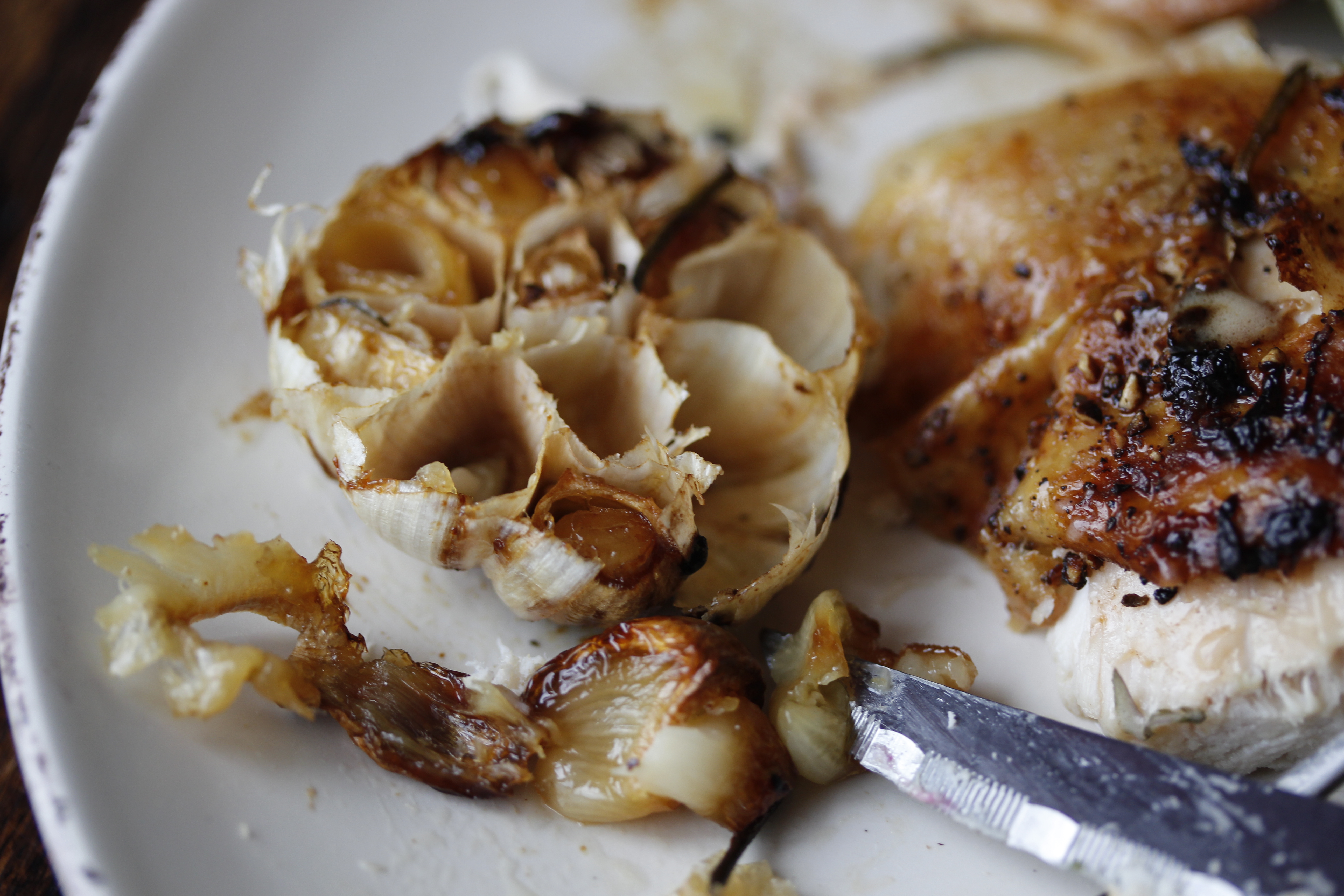 Enginn veit fyrir víst hver uppruni fjörutíu hvítlauksgeira kjúklingsins er og kannski varð réttur með þessu heiti fyrst til í Bandaríkjunum, þar sem fjörutíu hvítlauksgeirar þóttu ógnvekjandi tala – en ætternið er að minnsta kosti franskt. En ef kjúklingur væri eldaður með fjörutíu söxuðum eða pressuðum hvítlauksgeirum yrði hann líklega óætur. Galdurinn er að hafa geirana heila – eða hálfa, eins og hér er gert – og baka þá með kjúklingnum þar til þeir eru orðnir að mauki inni í hýðinu. Þá verða þeir unaðslega sætir og bragðmiklir og frábært að kreista maukið yfir kjúklinginn eða meðlætið.
