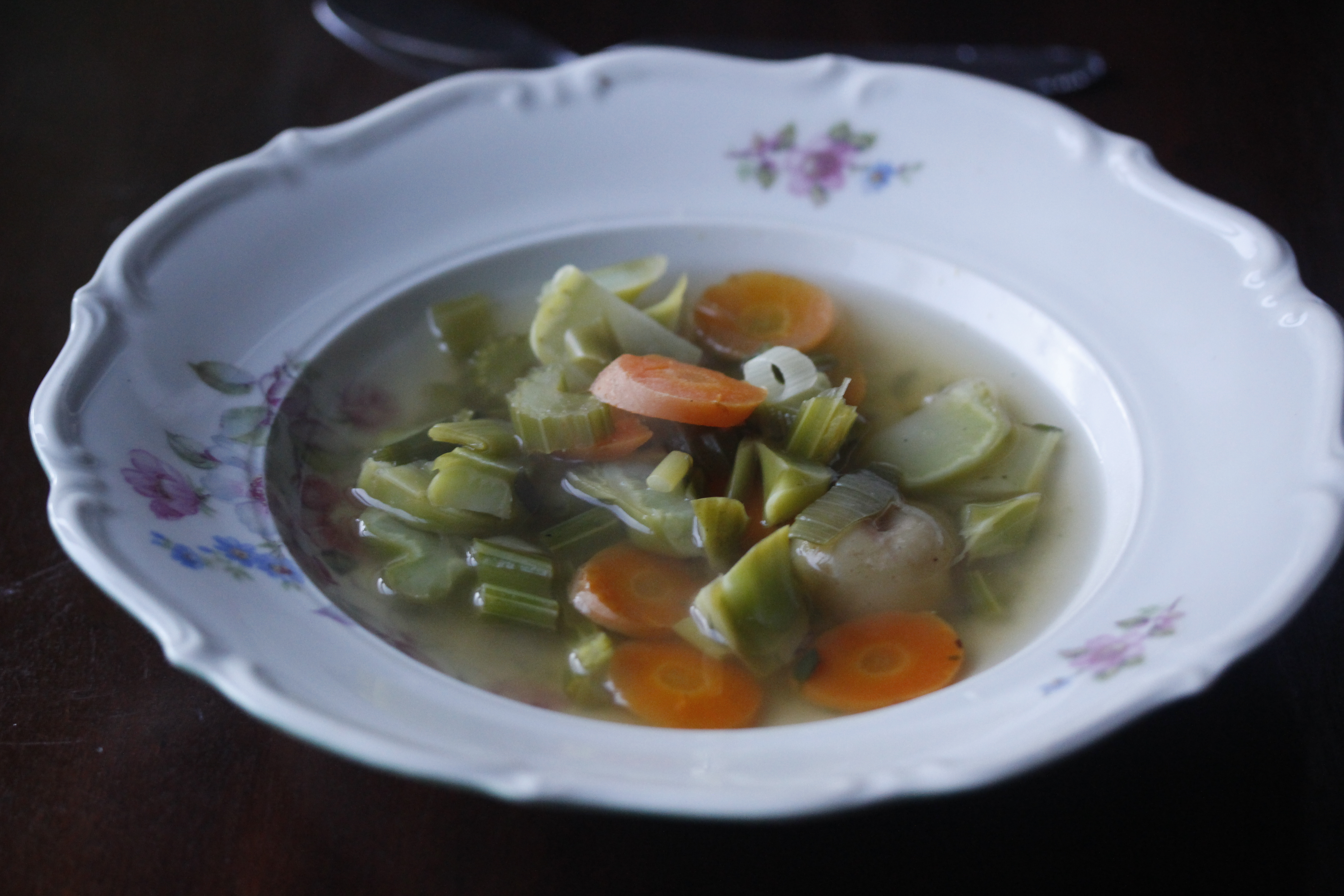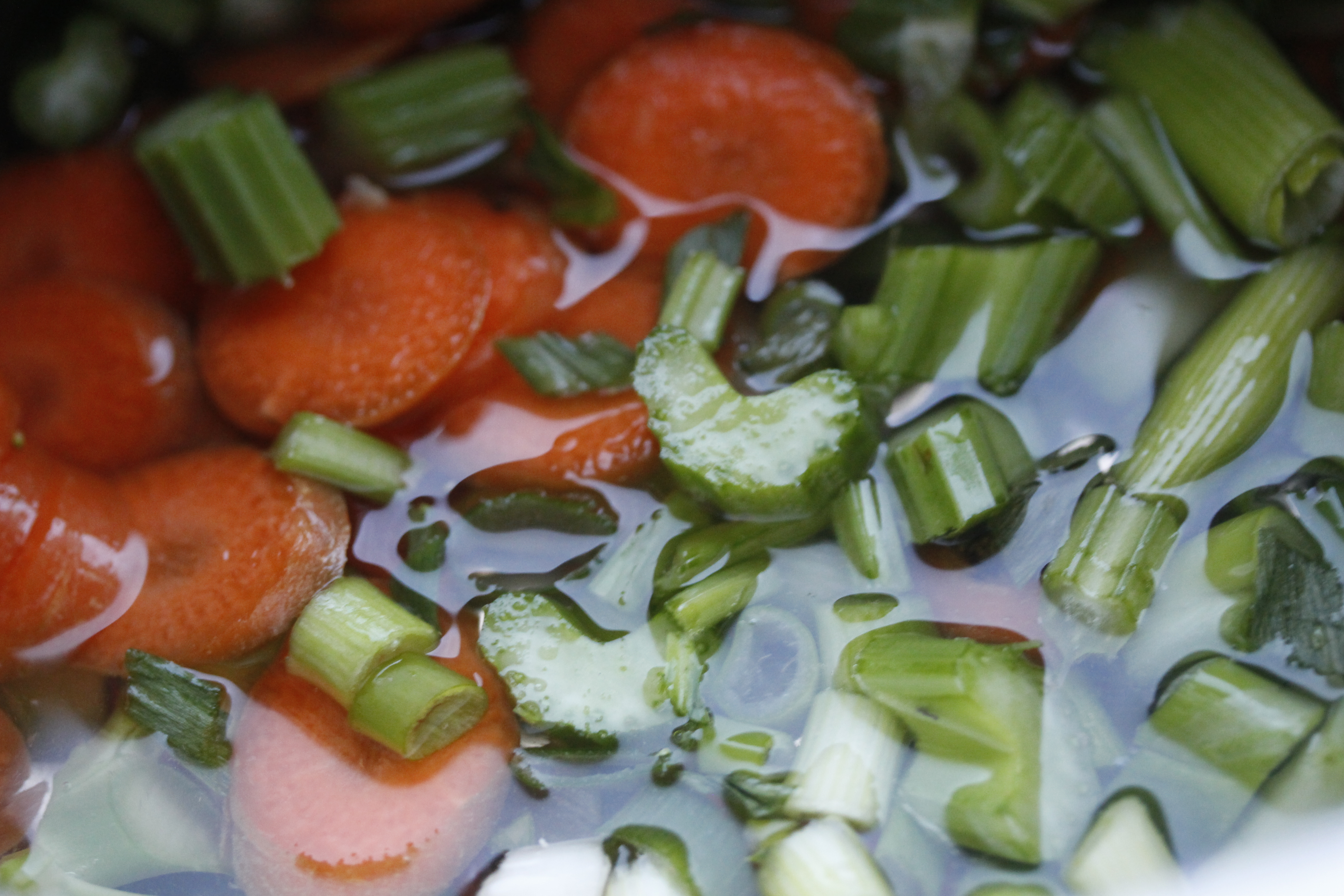Það kannski tekur því ekki að elda grænmetissúpu fyrir einn en það er samt minnsta mál í heimi ef maður á eitthvað af grænmeti til. Ég skar smátt eina gulrót, einn sellerístöngul, hvíta hlutann af tveimur vorlaukum (notaði græna hlutann í aðalréttinn) og stöngulinn af dálitlum spergilkálskvisti (hitt fór í aðalréttinn). Setti þetta í pott með 1/2 l af vatni og hitaði að suðu.