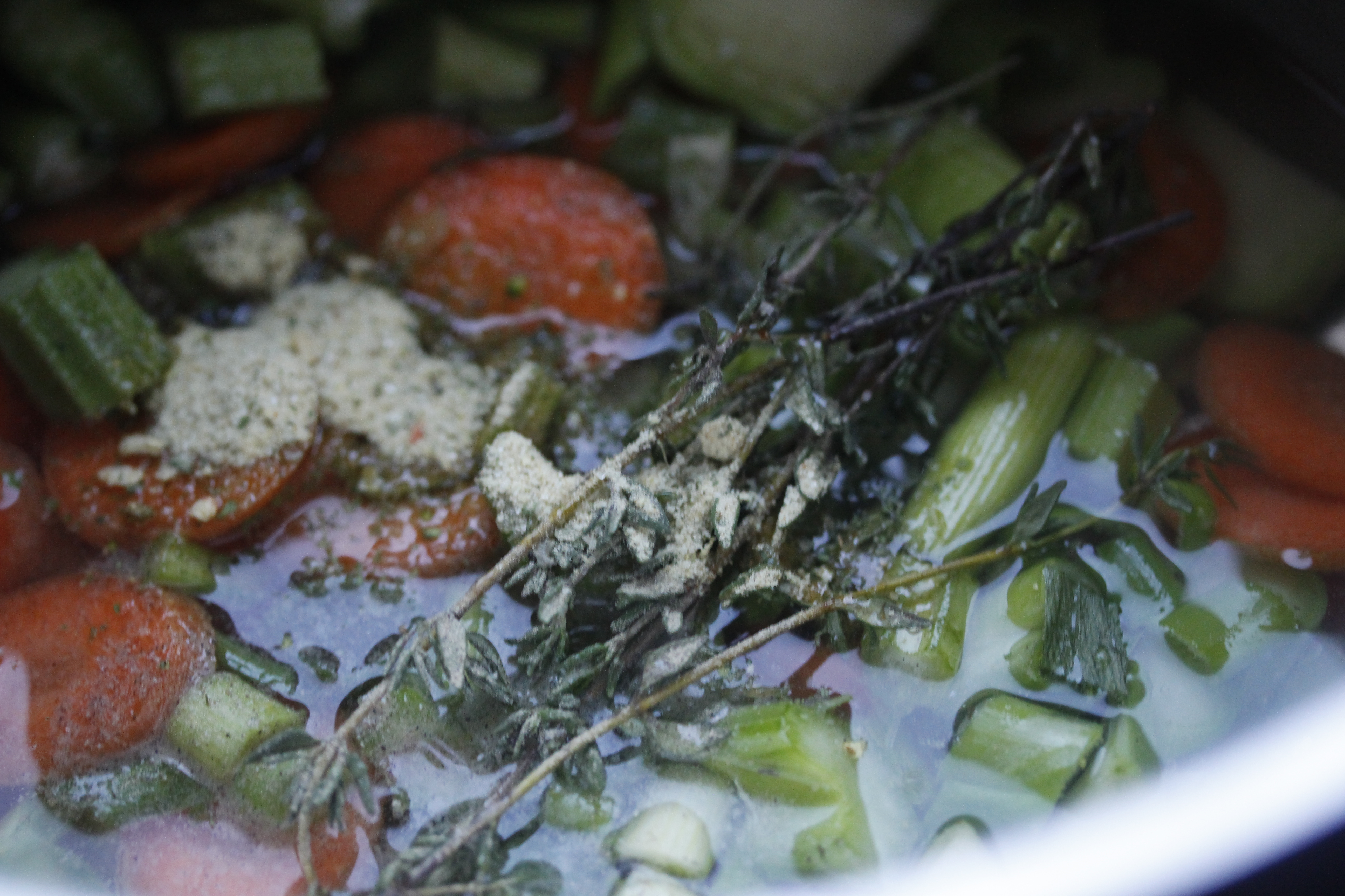 Bætti út í þetta nokkrum timjangreinum sem ég átti til (ég á oftast til timjan og það geymist þokkalega), 1 tsk af grænmetiskrafti, pipar og salti. Lét þetta malla rólega í svona 10-15 mínútur, eða þar til grænnmetið var meyrt.