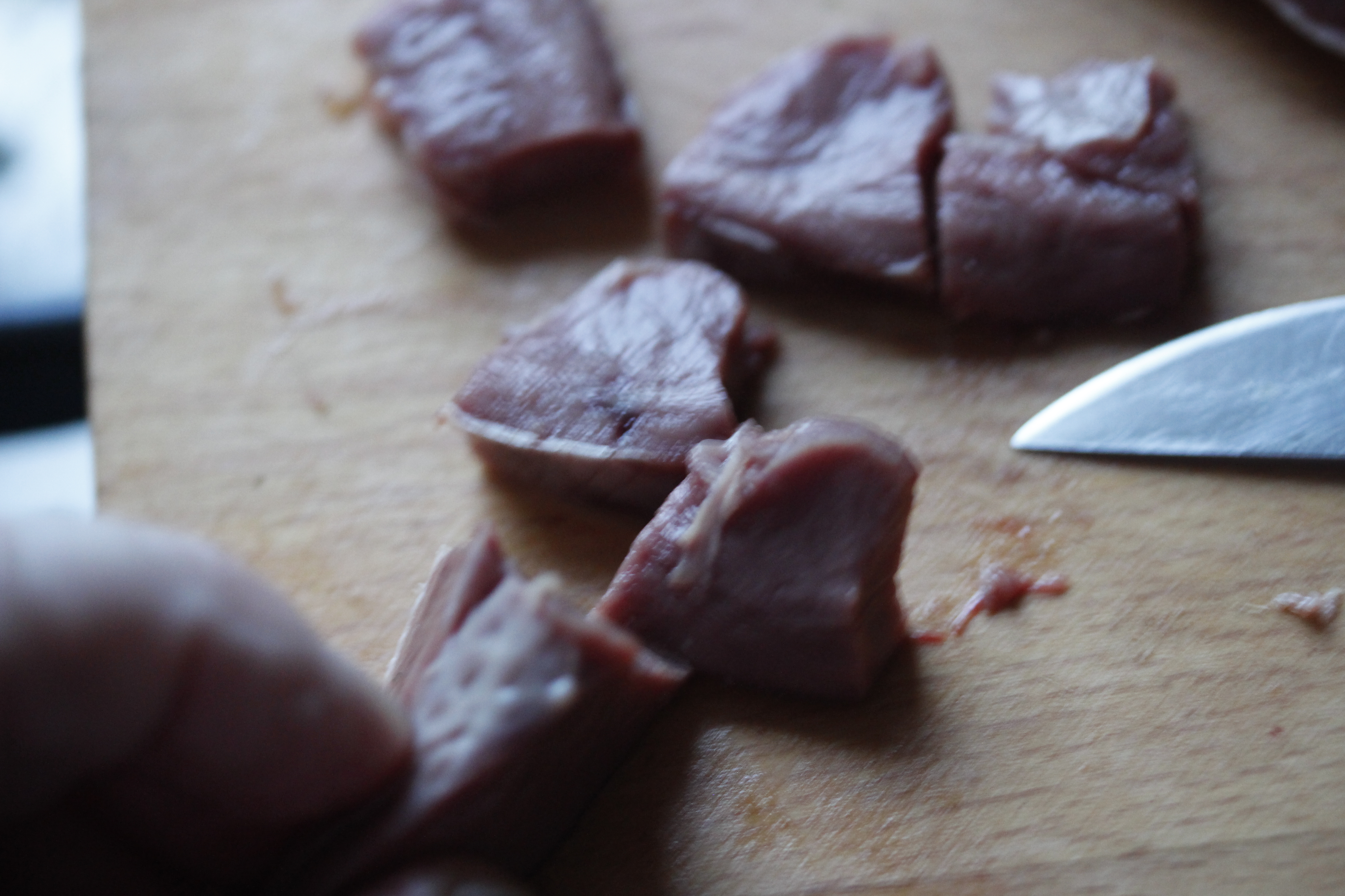 Ég var með eitt hjarta. Það var alveg heil 200 grömm og kostaði 80 krónur. Ég byrjaði á að snyrta það, skar burt fituna (hún getur verið góð en ekki þegar það er matreitt svona, finnst mér) og skar svo æðarnar frá. Skar hjartað svo í tvennt og hvorn helming í þrjá geira.