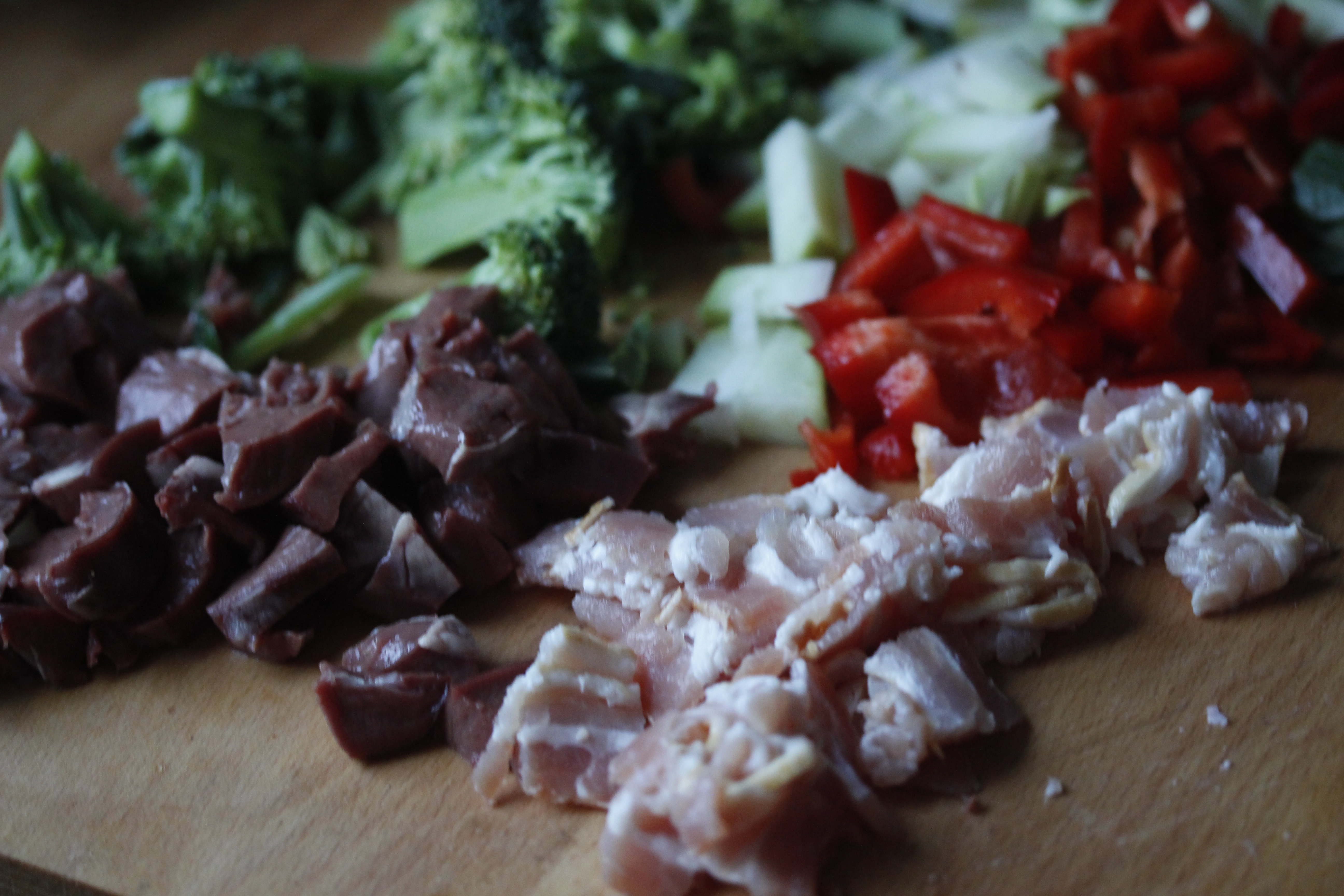 Svo tíndi ég til annað sem ég ætlaði að nota í réttinn (eða ég var reyndar búin að setja upp fáeinar litlar, nýjar kartöflur – sauð þær reyndar í súpunni til að spara mér pott og þess vegna sést í hálfa kartöflu á súpumyndinni, hún átti ekki að vera þar) og skar það frekar smátt. Helga hafði flesk og kartöflur með lifrinni svo að ég náði í 5-6 beikonsneiðar. Svo er þarna hálfur lítill hnúðkálshaus, skorinn í mjóa stafi, nokkrir spergilkálskvistir, fjórðungur úr papriku og grænu blöðin af vorlauknum sem fór í súpuna.