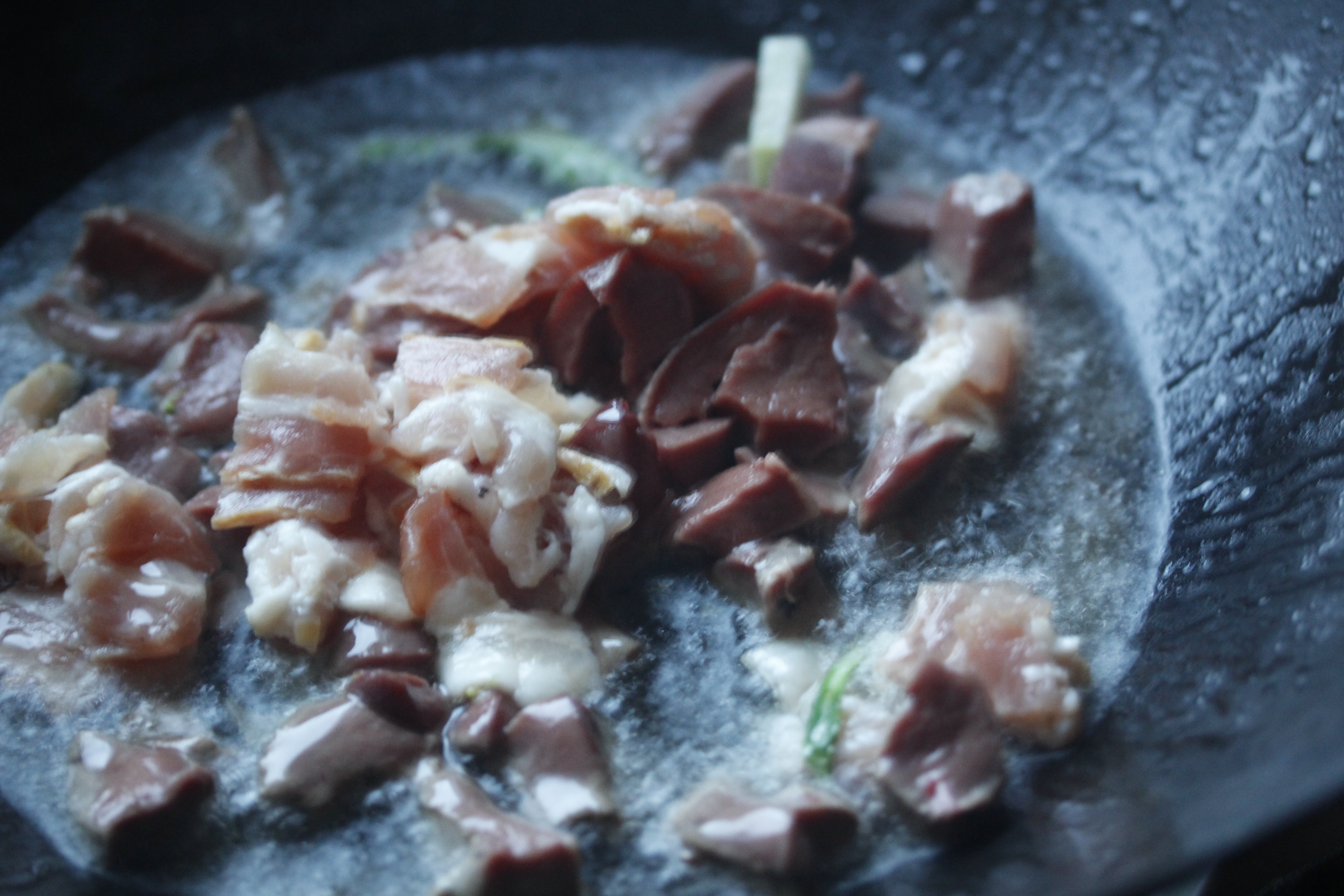 Ég tók wokpönnuna mína (hægt að nota góða steikarpönnu líka en hún þarf að þola töluverðan hita) og hitaði hana þar til var farið að rjúka af henni. Á meðan blandaði ég saman svona 1 tsk af reyktu paprikudufti (má vera venjulegt), 1/2 tsk af þurrkuðu timjani, pipar og salti. Hitaði svona 2 msk af olíu (ég notaði jarðhnetuolíu) á wokpönnunni, setti hjartað og beikonið á hana, stráði kryddinu yfir og steikti við hæsta hita í 1 1/2 mínútu. Ekki lengur. Hrærði nær stöðugt á meðan.