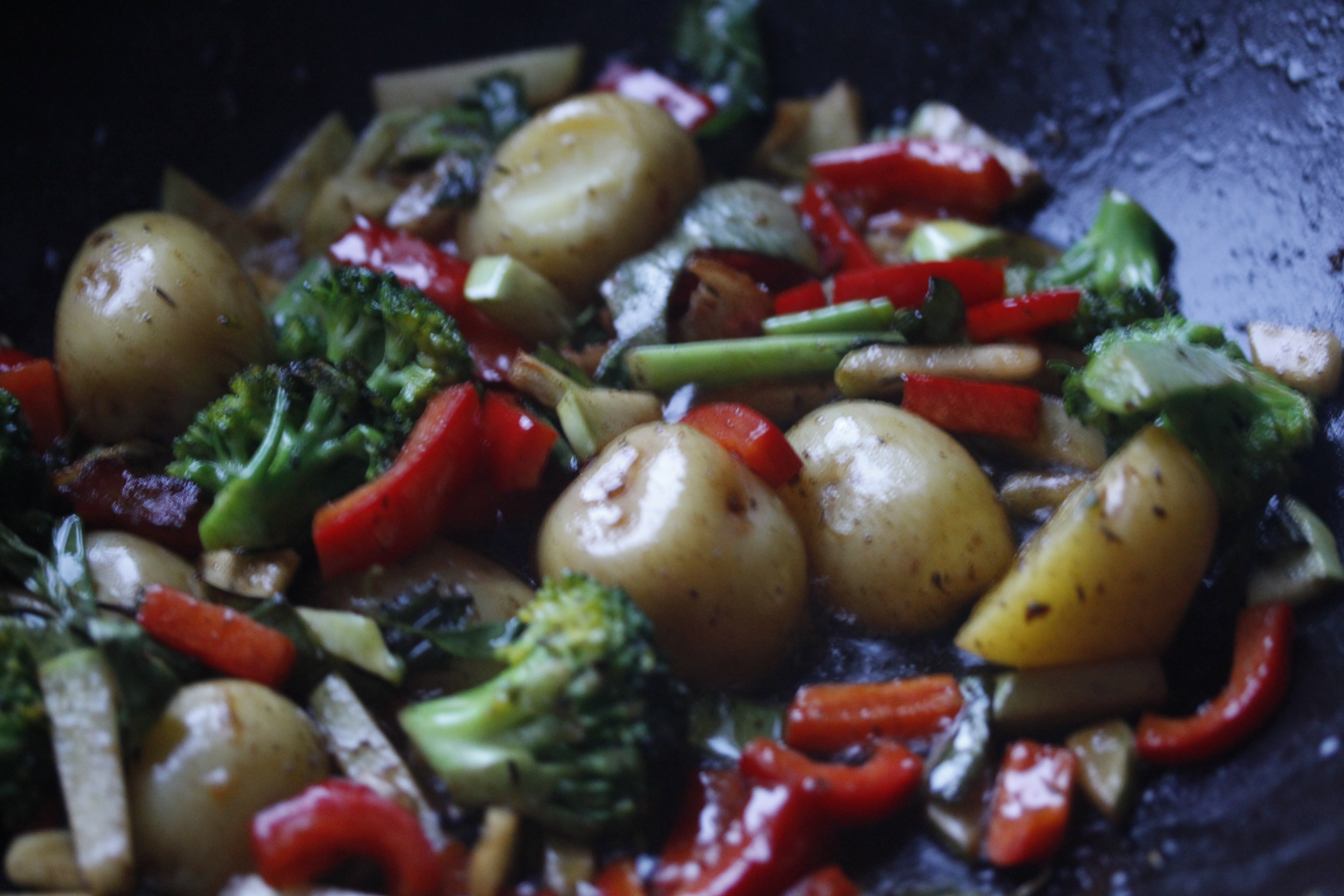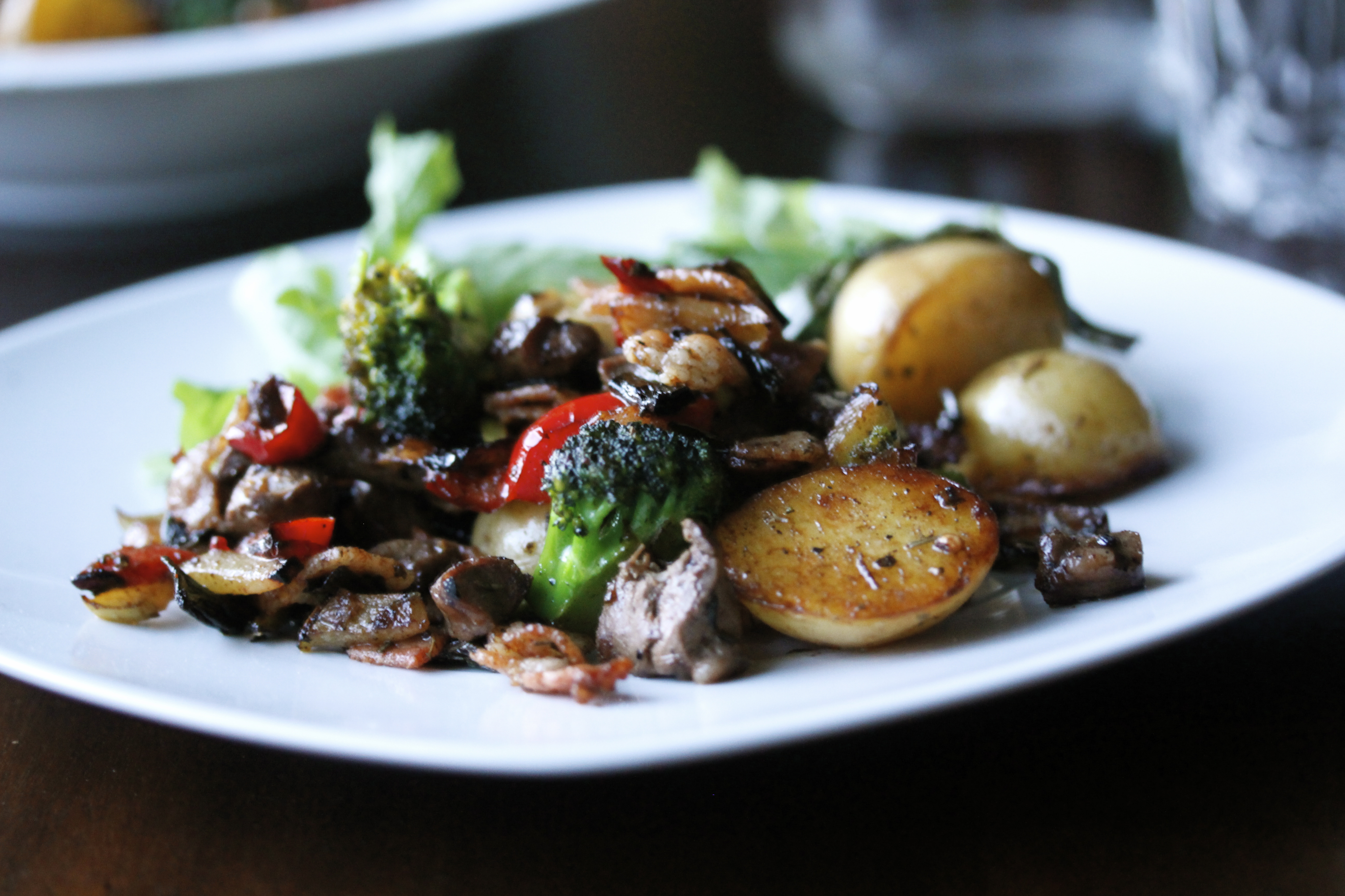 Ég tók hjartað og beikonið af pönnunni með gataspaða og setti á eldhúspappír. Lækkaði hitann dálítið og setti allt niðurskorna grænmetið á pönnuna, ásamt 1 hvítlauksgeira (og soðnu kartöflunum, skornum í tvennt). Steikti þetta í nokkrar mínútur, þar til allt var meyrt, og hrærði oft í á meðan. Kryddið sem ég hafði sett út á hjörtun og varð eftir í olíunni dugði fyrir mig en það má auðvitað krydda meira ef þörf ér á. Þegar þetta var tilbúið hækkaði ég hitann aftur, setti hjartað og beikonið aftur á pönnuna og steikti í hálfa mínútu eða svo – rétt til að hita í gegn.