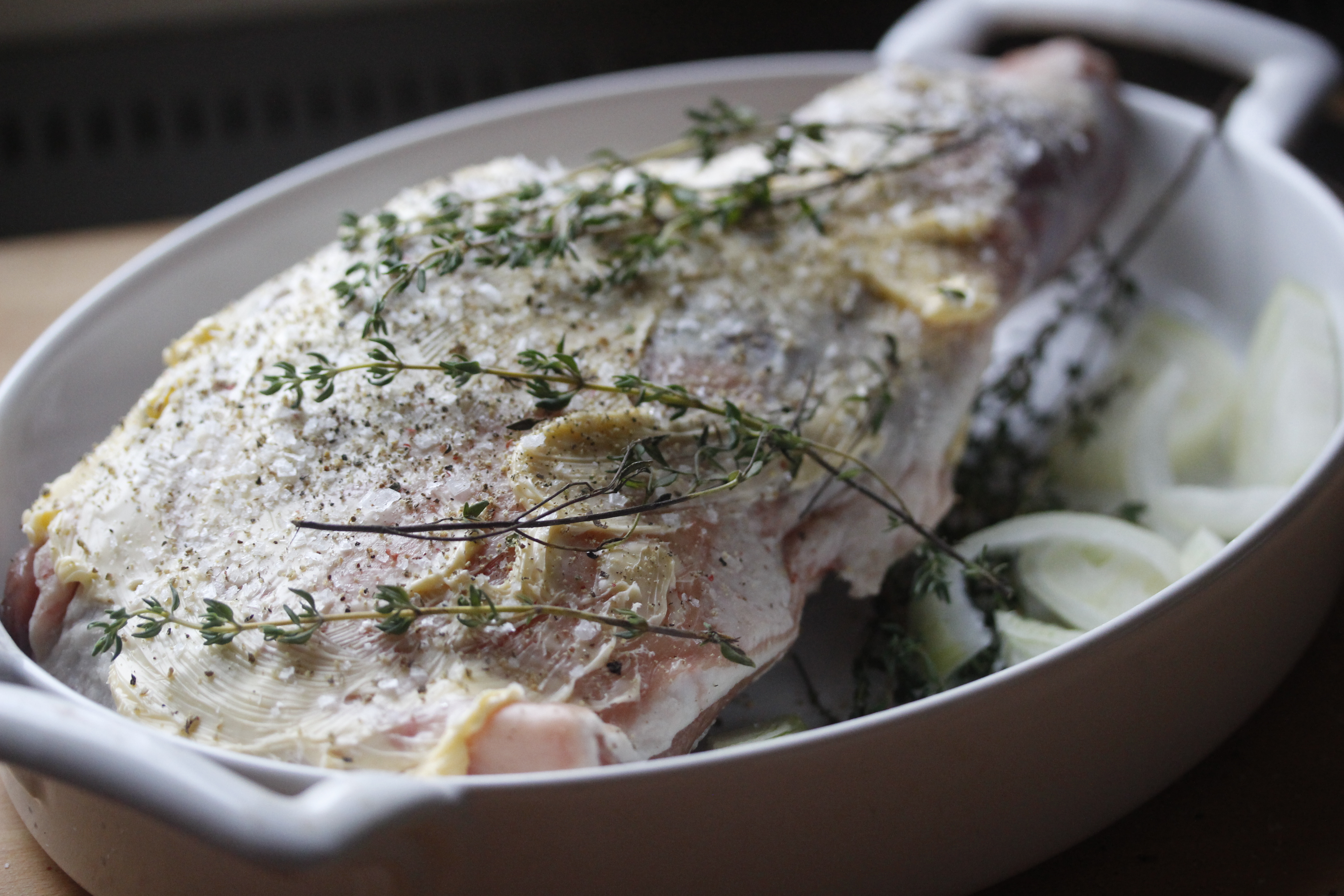 Ég byrjaði á að hita ofninn í 225°C. Svo smurði ég bóginn vel með svona 50 g af linu smjöri, kryddaði hann vel með pipar og salti og af því að ég átti dálítið af timjani setti ég nokkrar greinar yfir og í kring, ásamt einum söxuðum lauk. Setti þetta í ofninn og steikti í 20-25 mínútur, eða þar til bógurinn hafði tekið góðan lit.