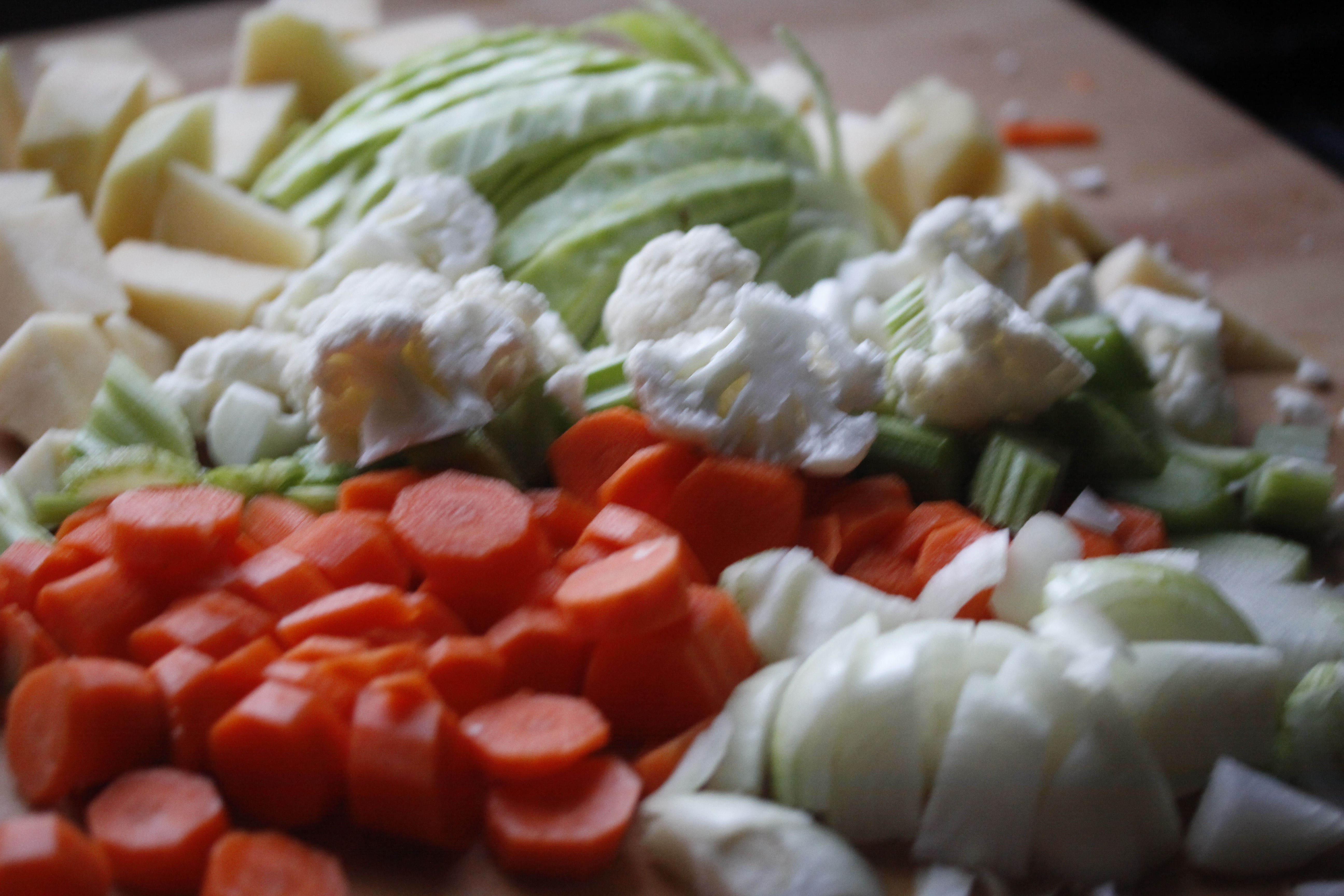 Á meðan bógurinn mallaði í ofninum undirbjó ég grænmetið. Ég notaði það sama og Helg var með í sinni uppskrift nema ég bætti við einni gulrófu, fannst það passa við tímann. Svo var ég með 10 frekar litlar kartöflur, 200 g af gulrótum, hálfan lítinn blómkálshaus, 2-3 sellerístöngla (tók blöðin af þeim frá og geymdi), bita af hvítkáli og einn lauk. Skar þetta allt niður frekar smátt (hvítkálið í mjóar ræmur) nema kartöflurnar. Þær forsauð ég þar til þær voru næstum tilbúnar og sauð líka rófubitana með síðustu 5 mínúturnar eða svo – þeir eiga samt að vera frekar stinnir svo þeir fari ekki í mauk við frekari eldamennsku. Hellti svo vatninu af kartöflunum og rófunum og skar kartöflurnar í tvennt.