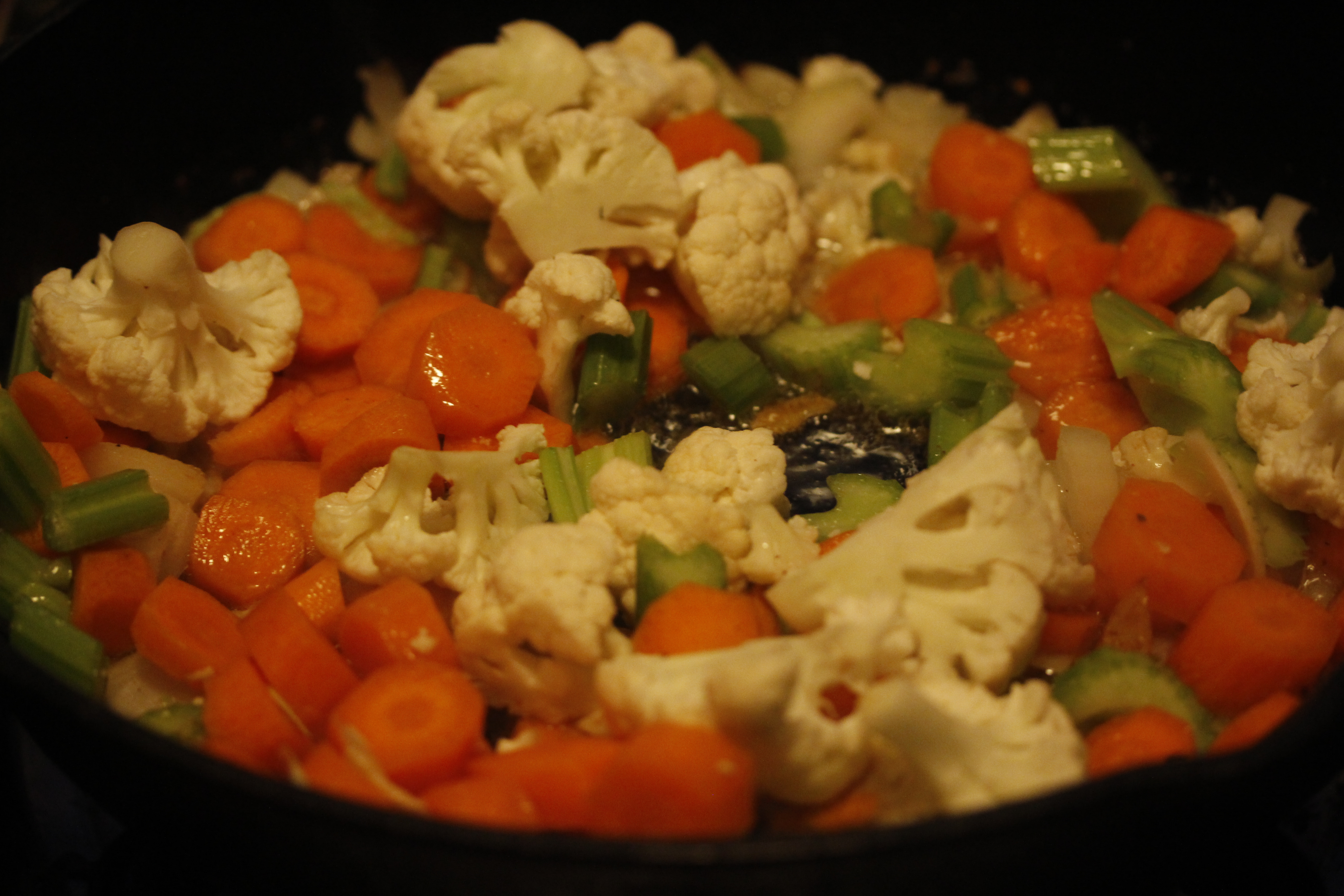 Ég hitaði svo 2 msk af olíu og 25 g af smjöri í stórri, djúpri pönnu (eftir á að hyggja hefði verið betra að nota víðan, þykkbotna pott) og byrjaði á að láta laukinn krauma í nokkrar mínútur. Bætti svo gulrótum, selleríi og blómkáli á pönnuna og steikti við meðalhita í nokkrar mínútur. Hrærði oft á meðan og kryddaði með pipar, salti og þurrkaðri basilíku.