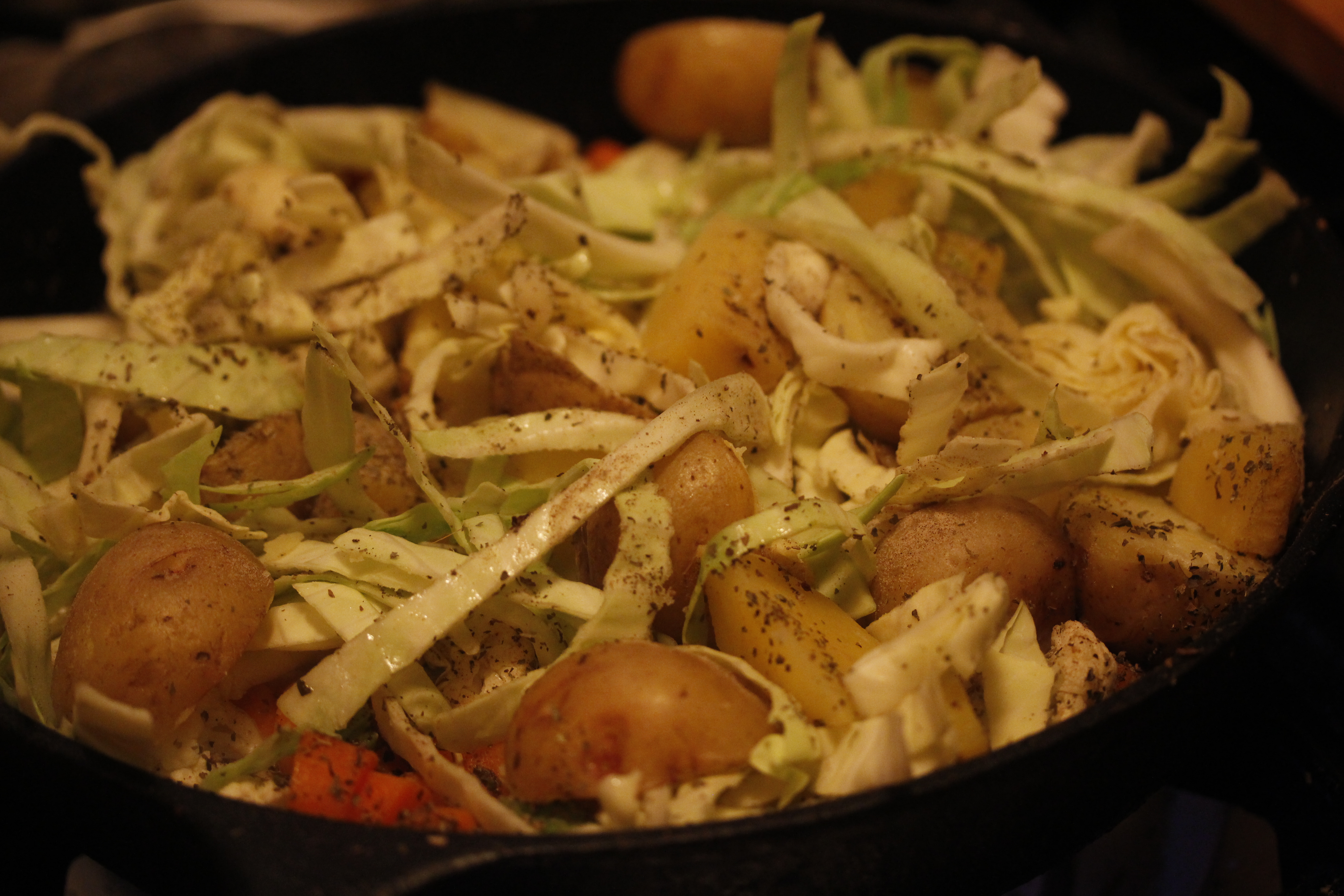 Svo bætti ég hvítkálsræmunum á pönnuna og síðan kartöfluhelmingunum og rófubitunum. Steikti þetta allt áfram í nokkrar mínútur. Þá var kjötið einmitt búið að vera í klukkutíma og korter í ofninum svo að ég tók það út, hellti soðinu úr fatinu í skál og setti kjötið svo aftur í ofninn án yfirbreiðslu í 10-15 mínútur, eða þar til paran, sem hafði mýkst í gufunni undir álpappírnum, var aftur orðin stökk og fín.
