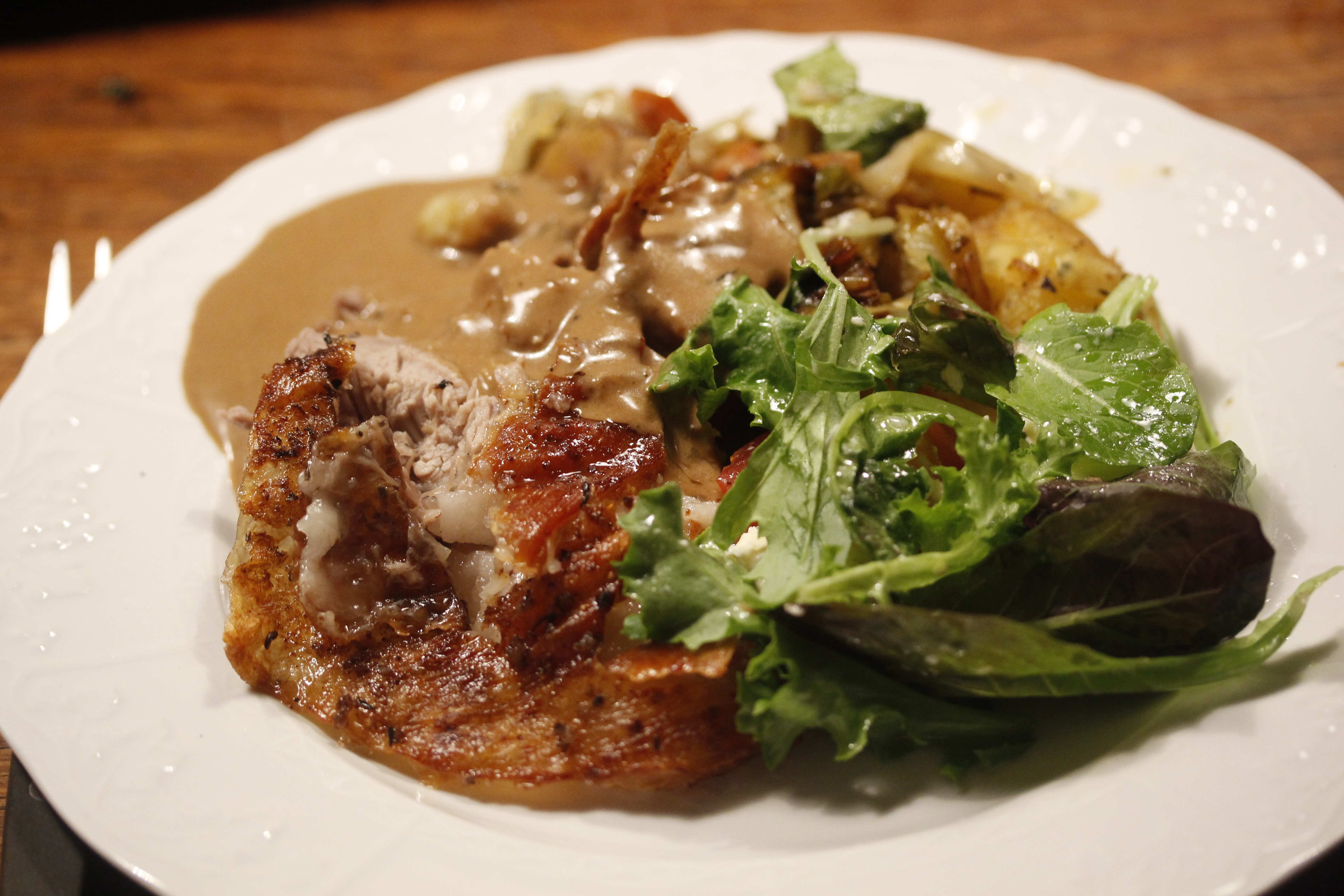 Afganginn af soðinu setti ég í pott og hitaði að suðu, þykkti með hveitijafningi og bætti við svona 125 ml af rjóma og dálitlum sósulit. Lét malla í um 10 mínútur – það þurfti ekkert að krydda þetta neitt, soðið var það kraftmikið, en það má bæta við pipar, salti og jafnvel kjötkrafti eftir þörfum. Og vatni, ef soðið er ekki mikið.