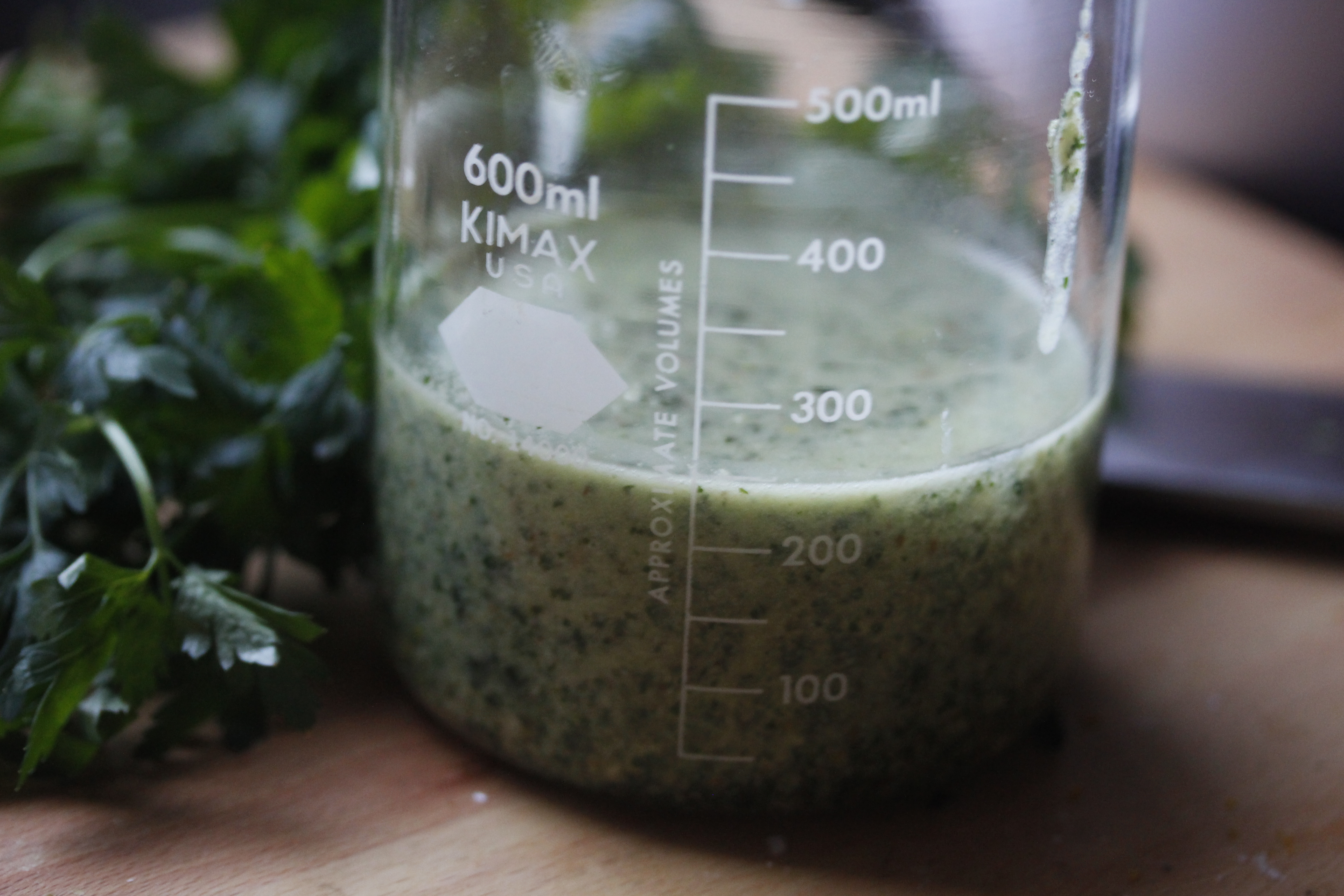 Þess í stað tók ég knippi af flatblaða steinselju, tók smávegis frá en setti hitt (mínus sverustu stöngulendana) í matvinnsluvél ásamt 40-50 g af valhnetum, rifnum berki af hálfri sítrónu og 1-2 tsk af sítrónusafa, 2 söxuðum hvítlauksgeirum og pipar og salti.