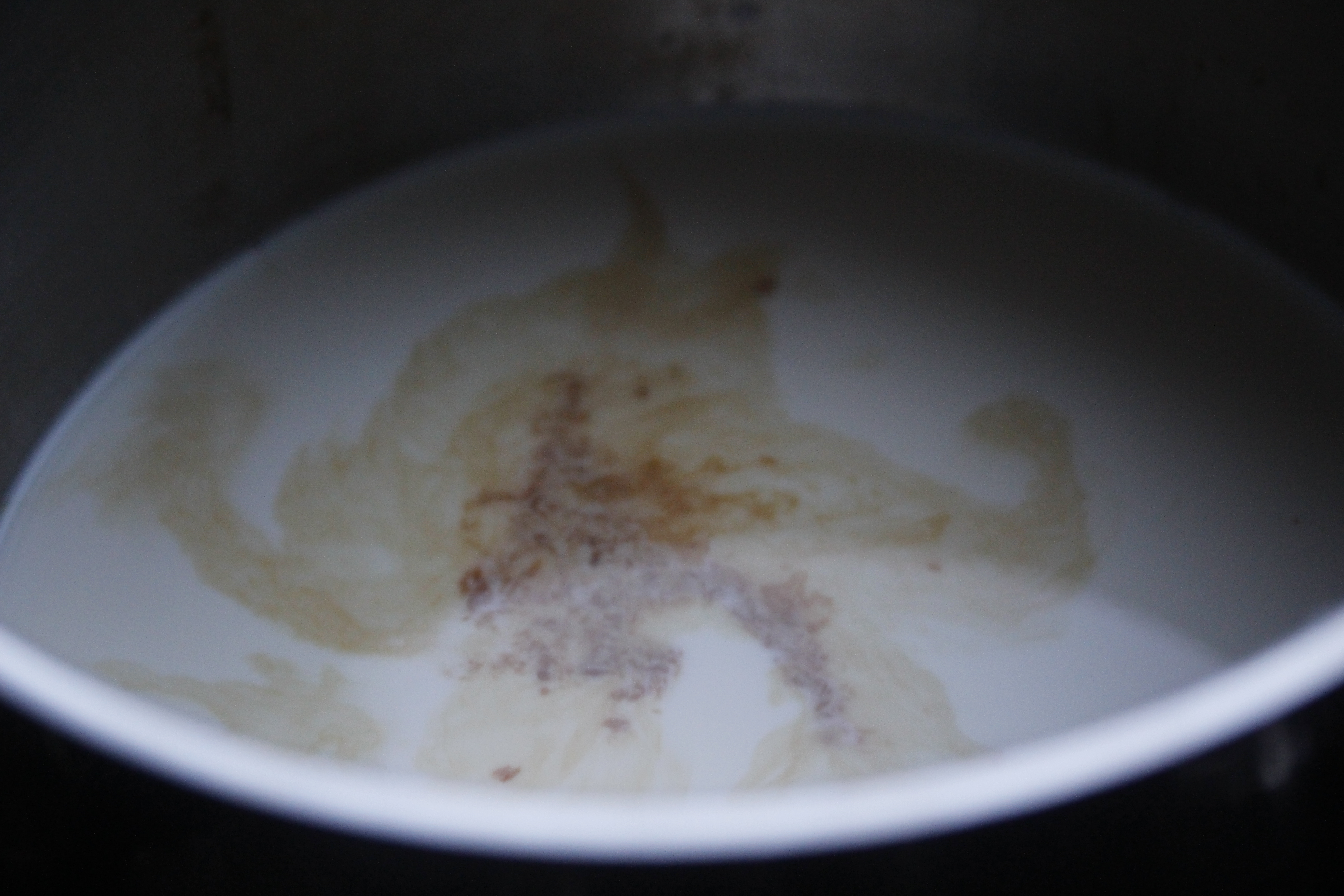 Ég byrjaði á að setja 1/2 l af mjólk í pott ásamt 2 msk af sykri, örlitlu salti og 1 tsk af vanilluessens. Ég hefði kannski notað hálfa vanillustöng ef ég hefði átt hana, og þó – þetta er hversdagsmatur og vanilluessensinn frá Kirkland sem fæst í Kosti er alveg ágætur í þetta og ódýr í þokkabót (fæst reyndar bara í stórum flöskum en endist vel). Hitaði þetta að suðu og lét malla í 1-2 mínútur.